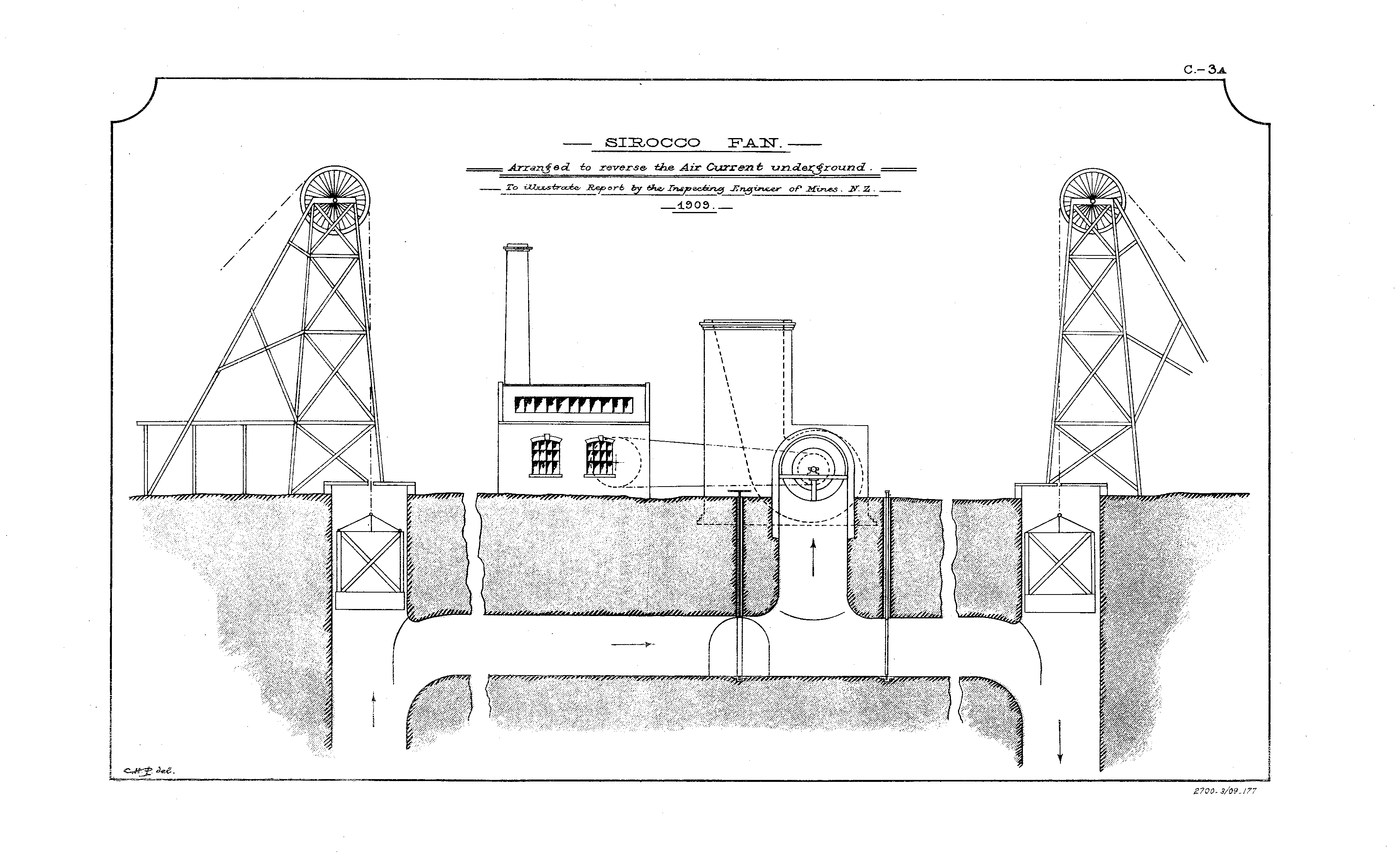 SIROCCO Arranged to reverse, the Air current underground. To illustrate Report by the Inspecting Engineer of Mines. N. Z. 1909.