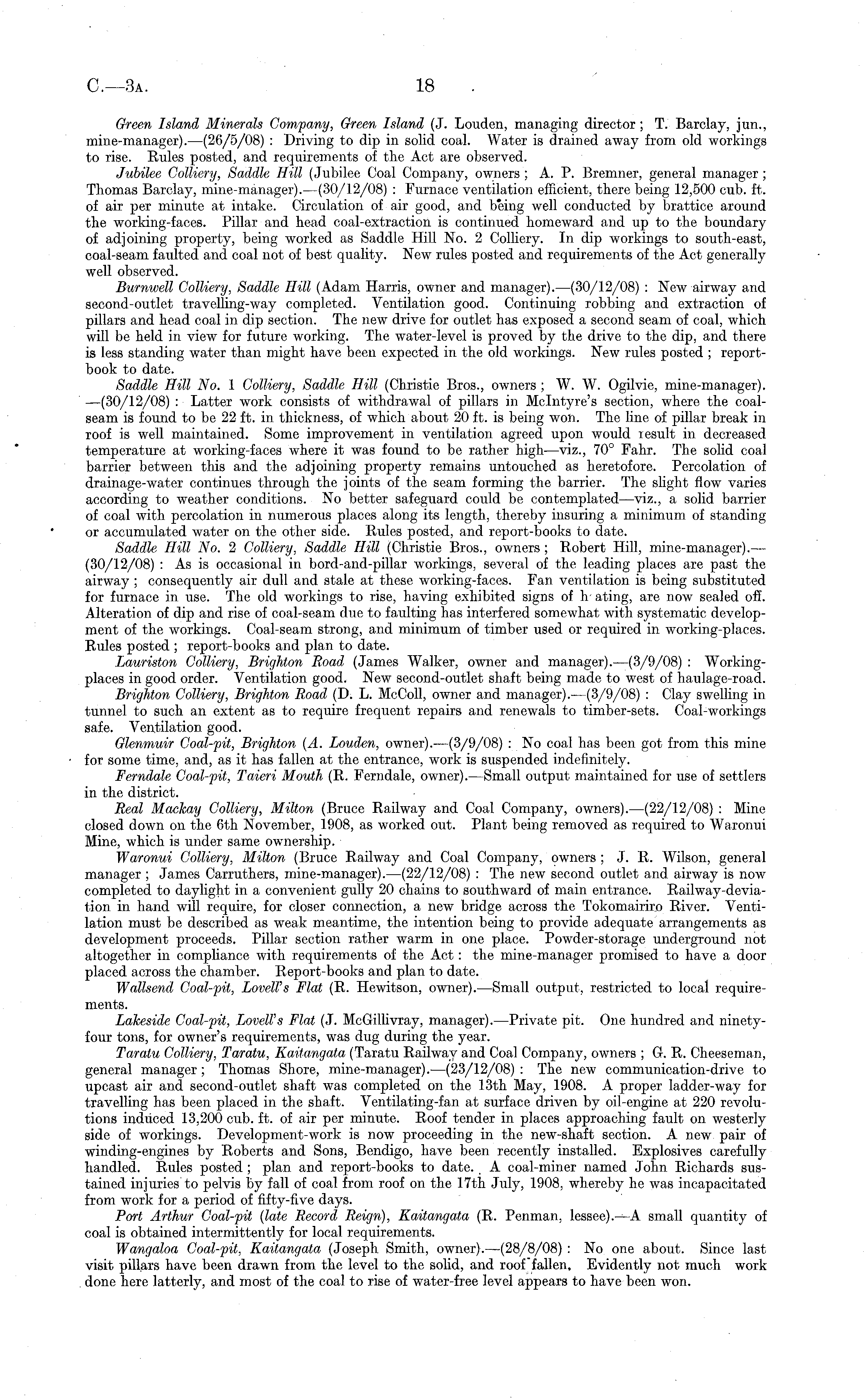 Green Island Minerals Company, Green Island (J. Louden, managing director ; T. Barclay, jun., mine-manager).—(26/5/08) : Driving to dip in solid coal. Water is drained away from old workings to rise. Rules posted, and requirements of the Act are observed. Jubilee Colliery, Saddle Hill (Jubilee Coal Company, owners ; A. P. Bremner, general manager ; Thomas Barclay, mine-manager).—(3o/12/08) : Furnace ventilation efficient, there being 12,500 cub. ft. of air per minute at intake. Circulation, of air good, and being well conducted by brattice around the working-faces. Pillar and head coal-extraction is continued homeward and up to the boundary of adjoining property, being worked as Saddle Hill No. 2 Colliery. In dip workings to south-east, coal-seam faulted and coal not of best quality. New rules posted and requirements of the Act generally well observed. Burnwell Colliery, Saddle Hill (Adam Harris, owner and manager). —(30/12/08) : New airway and second-outlet travelling-way completed. Ventilation good. Continuing robbing and extraction of pillars and head coal in dip section. The new drive for outlet has exposed a second seam of coal, which will be held in view for future working. The water-level is proved by the drive to the dip, and there is less standing water than might have been expected in the old workings. New rules posted ; reportbook to date. Saddle Hill No. 1 Colliery, Saddle Hill (Christie Bros., owners ; W. W. Ogilvie, mine-manager). —(30/12/08) : Latter work consists of withdrawal of pillars in Mclntyre's section, where the coalseam is found to be 22 ft. in thickness, of which about 20 ft. is being won. The line of pillar break in roof is well maintained. Some improvement in ventilation agreed upon would result in decreased temperature at working-faces where it was found to be rather high—viz., 70° Fahr. The solid coal barrier between this and the adjoining property remains untouched as heretofore. Percolation of drainage-water continues through the joints of the seam forming the barrier. The slight flow varies according to weather conditions. No better safeguard could be contemplated —viz., a solid barrier of coal with percolation in numerous places along its length, thereby insuring a minimum of standing or accumulated water on the other side. Rules posted, and report-books to date. Saddle Hill No. 2 Colliery, Saddle Hill (Christie Bros., owners ; Robert Hill, mine-manager).— (30/12/08) : As is occasional in bord-and-pillar workings, several of the leading places are past the airway ; consequently air dull and stale at these working-faces. Fan ventilation is being substituted for furnace in use. The old workings to rise, having exhibited signs of h- ating, are now sealed off. Alteration of dip and rise of coal-seam due to faulting has interfered somewhat with systematic development of the workings. Coal-seam strong, and minimum of timber used or required in working-places. Rules posted ; report-books and plan to date. Lauriston Colliery, Brighton Road (James Walker, owner and manager).—(3/9/08) : Workingplaces in good order. Ventilation good. New second-outlet shaft being made to west of haulage-road. Brighton Colliery, Brighton Road (D. L. McColl, owner and manager).—(3/9/08) : Clay swelling in tunnel to such an extent as to require frequent repairs and renewals to timber-sets. Coal-workings safe. Ventilation good. Glenmuir Coal-pit, Brighton (A. Louden, owner). —(3/9/08) : No coal has been got from this mine for some time, and, as it has fallen at the entrance, work is suspended indefinitely. Ferndale Coal-pit, Taieri Mouth (R. Ferndale, owner). —Small output maintained for use of settlers in the district. Real Mackay Colliery, Milton (Bruce Railway and Coal Company, owners). —(22/12/08) : Mine closed down on the 6th November, 1908, as worked out. Plant being removed as required to Waronui Mine, which is under same ownership. Waronui Colliery, Milton (Bruce Railway and Coal Company, owners ; J. R. Wilson, general manager ; James Carruthers, mine-manager). —(22/12/08) : The new second outlet and airway is now completed to daylight in a convenient gully 20 chains to southward of main entrance. Railway-devia-tion in hand will require, for closer connection, a new bridge across the Tokomairiro River. Ventilation must be described as weak meantime, the intention being to provide adequate arrangements as development proceeds. Pillar section rather warm in one place. Powder-storage underground not altogether in compliance with requirements of the Act: the mine-manager promised to have a door placed across the chamber. Report-books and plan to date. Wallsend Coal-pit, Lovell's Flat (R. Hewitson, owner). —Small output, restricted to local requirements. Lakeside Coal-pit, Lovell's Flat (J. McGillivray, manager).—Private pit. One hundred and ninetyfour tons, for owner's requirements, was dug during the year. Taratu Colliery, Taratu, Kaitangata (Taratu Railway and Coal Company, owners ; G. R. Cheeseman, general manager ; Thomas Shore, mine-manager).—(23/12/08) : The new communication-drive to upcast air and second-outlet shaft was completed on the 13th May, 1908. A proper ladder-way for travelling has been placed in the shaft. Ventilating-fan at surface driven by oil-engine at 220 revolutions induced 13,200 cub. ft. of air per minute. Roof tender in places approaching fault on westerly side of workings. Development-work is now proceeding in the new-shaft section. A new pair of winding-engines by Roberts and Sons, Bendigo, have been recently installed. Explosives carefully handled. Rules posted ; plan and report-books to date. A coal-miner named John Richards sustained injuries to pelvis by fall of coal from roof on the 17th July, 1908, whereby he was incapacitated from work for a period of fifty-five days. Port Arthur Coal-pit (late Record Reign), Kaitangata (R. Penman, lessee).—A small quantity of coal is obtained intermittently for local requireme