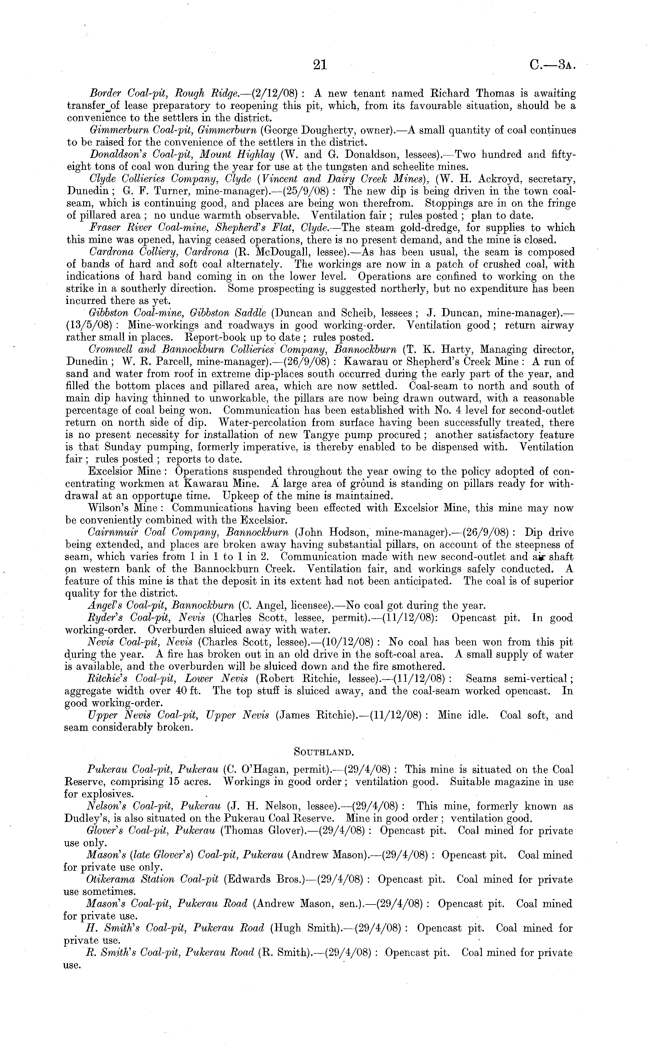 Border Coal-pit, Rough Ridge. —(2/12/08) : A new tenant named Richard Thomas is awaiting lease preparatory to reopening this pit, which, from its favourable situation, should be a convenience to the settlers in the district. Gimmerburn Coal-pit, Gimmerburn (George Dougherty, owner). —A small quantity of coal continues to be raised for the convenience of the settlers in the district. Donaldson's Coal-pit, Mount Highlay (W. and G. Donaldson, lessees). —Two hundred and fiftyeight tons of coal won during the year for use at the tungsten and scheelite mines. Clyde Collieries Company, Clyde (Vincent and Dairy Creek Mines), (W. H. Ackroyd, secretary, Dunedin ; G. F. Turner, mine-manager).—(2s/9/08) : The new dip is being driven in the town coalseam, which is continuing good, and places are being won therefrom. Stoppings are in on the fringe of pillared area ; no undue warmth observable. Ventilation fair ; rules posted ; plan to date. Eraser River Coal-mine, Shepherd's Flat, Clyde. —The steam gold-dredge, for supplies to which this mine was opened, having ceased operations, there is no present demand, and the mine is closed. Cardrona Colliery, Cardrona (R. McDougall, lessee). —As has been usual, the seam is composed of bands of hard and soft coal alternately. The workings are now in a patch of crushed coal, with indications of hard band coming in on the lower level. Operations are confined to working on the strike in a southerly direction. Some prospecting is suggested northerly, but no expenditure has been incurred there as yet. Gibbston Coal-mine, Gibbston Saddle (Duncan and Scheib, lessees ; J. Duncan, mine-manager). — (13/5/08) : Mine-workings and roadways in good working-order. Ventilation good ; return airway rather small in places. Report-book up to date ; rules posted. Cromwell and Bannockburn Collieries Company, Bannockburn (T. K. Harty, Managing director, Dunedin ; W. R. Parcell, mine-manager).—(26/9/08) : Kawarau or Shepherd's Creek Mine : A run of sand and water from roof in extreme dip-places south occurred during the early part of the year, and filled the bottom places and pillared area, which are now settled. Coal-seam to north and south of main dip having thinned to unworkable, the pillars are now being drawn outward, with a reasonable percentage of coal being won. Communication has been established with No. 4 level for second-outlet return on north side of dip. Water-percolation from surface having been successfully treated, there is no present necessity for installation of new Tangye pump procured ; another satisfactory feature is that Sunday pumping, formerly imperative, is thereby enabled to be dispensed with. Ventilation fair ; rules posted ; reports to date. Excelsior Mine : Operations suspended throughout the year owing to the policy adopted of concentrating workmen at Kawarau Mine. A large area of ground is standing on pillars ready for withdrawal at an opportupe time. Upkeep of the mine is maintained. Wilson's Mine : Communications having been effected with Excelsior Mine, this mine may now be conveniently combined with the Excelsior. Cairnmuir Coal Company, Bannockburn (John Hodson, mine-manager). —(26/9/08) : Dip drive being extended, and places are broken away having substantial pillars, on account of the steepness of seam, which varies from linltol in 2. Communication made with new second-outlet and ak shaft on western bank of the Bannockburn Creek. Ventilation fair, and workings safely conducted. A feature of this mine is that the deposit in its extent had not been anticipated. The coal is of superior quality for the district. Angel's Coal-pit, Bannockburn (C. Angel, licensee). —No coal got during the year. Ryder's Coal-pit, Nevis (Charles Scott, lessee, permit). —(11/12/08): Opencast pit. In good working-order. Overburden sluiced away with water. Nevis Coal-pit, Nevis (Charles Scott, lessee). —(10/12/08) : No coal has been won from this pit during the year. A fire has broken out in an old drive in the soft-coal area. A small supply of water is available, and the overburden will be sluiced down and the fire smothered. Ritchie's Coal-pit, Lower Nevis (Robert Ritchie, lessee). —(11/12/08) : Seams semi-vertical; aggregate width over 40 ft. The top stuff is sluiced away, and the coal-seam worked opencast. In good working-order. Upper Nevis Coal-pit, Upper Nevis (James Ritchie). —(11/12/08) : Mine idle. Coal soft, and seam considerably broken. Southland. Pukerau Coal-pit, Pukerau (C. O'Hagan, permit). —(29/4/08) : This mine is situated on the Coal Reserve, comprising 15 acres. Workings in good order ; ventilation good. Suitable magazine in use for explosives. Nelson's Coal-pit, Pukerau (J. H. Nelson, lessee). —(29/4/08) : This mine, formerly known as Dudley's, is also situated on the Pukerau Coal Reserve. Mine in good order ; ventilation good. Glover's Coal-pit, Pukerau (Thomas Glover). —(29/4/08) : Opencast pit. Coal mined for private use only. Mason's (late Glover's) Coal-pit, Pukerau (Andrew Mason). —(29/4/08) : Opencast pit. Coal mined for private use only. Otilcerama Station Coal-pit (Edwards Bros.) —(29/4/08) : Opencast pit. Coal mined for private use sometimes. Mason's Coal-pit, Pukerau Road (Andrew Mason, sen.). —(29/4/08) : Opencast pit. Coal mined for private use. H. Smith's Coal-pit, Pukerau Road (Hugh Smith). —(29/4/08) : Opencast pit. Coal mined for private use. R. Smith's Coal-pit, Pukerau Road (R. Smith). —(29/4/08) : Opencast pit. Coal mined for private use.