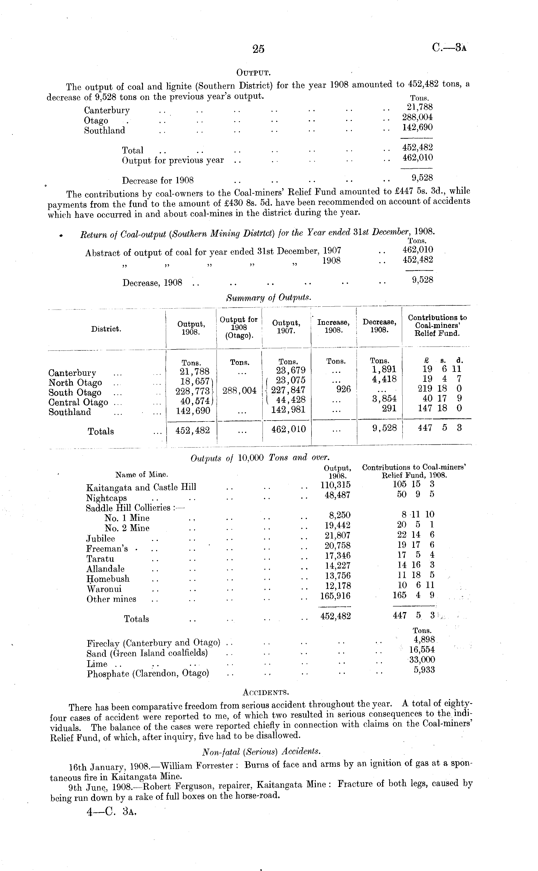 Output for 1908 (Otago). Output, 1907. " Distriot. Output, 1908. Increase, 1908. Decrease, 1908. Contributions to Coal-miners' Eelief Fund. Janterbury forth Otago louth Otago Jentral Otago ... Southland Tons. 21,788 18,657) 228,773 40,574j 142,690 Tons. Tons. 23,679 | 23,075 288,004 J 227,847 ( 44,428 142,981 Tons. 926 Tons. 1,891 4,418 £ s. d. 19 6 11 19 4 7 219 18 0 40 17 9 147 18 0 3,854 291 Totals 452,482 462,010 9,528 447 5 3