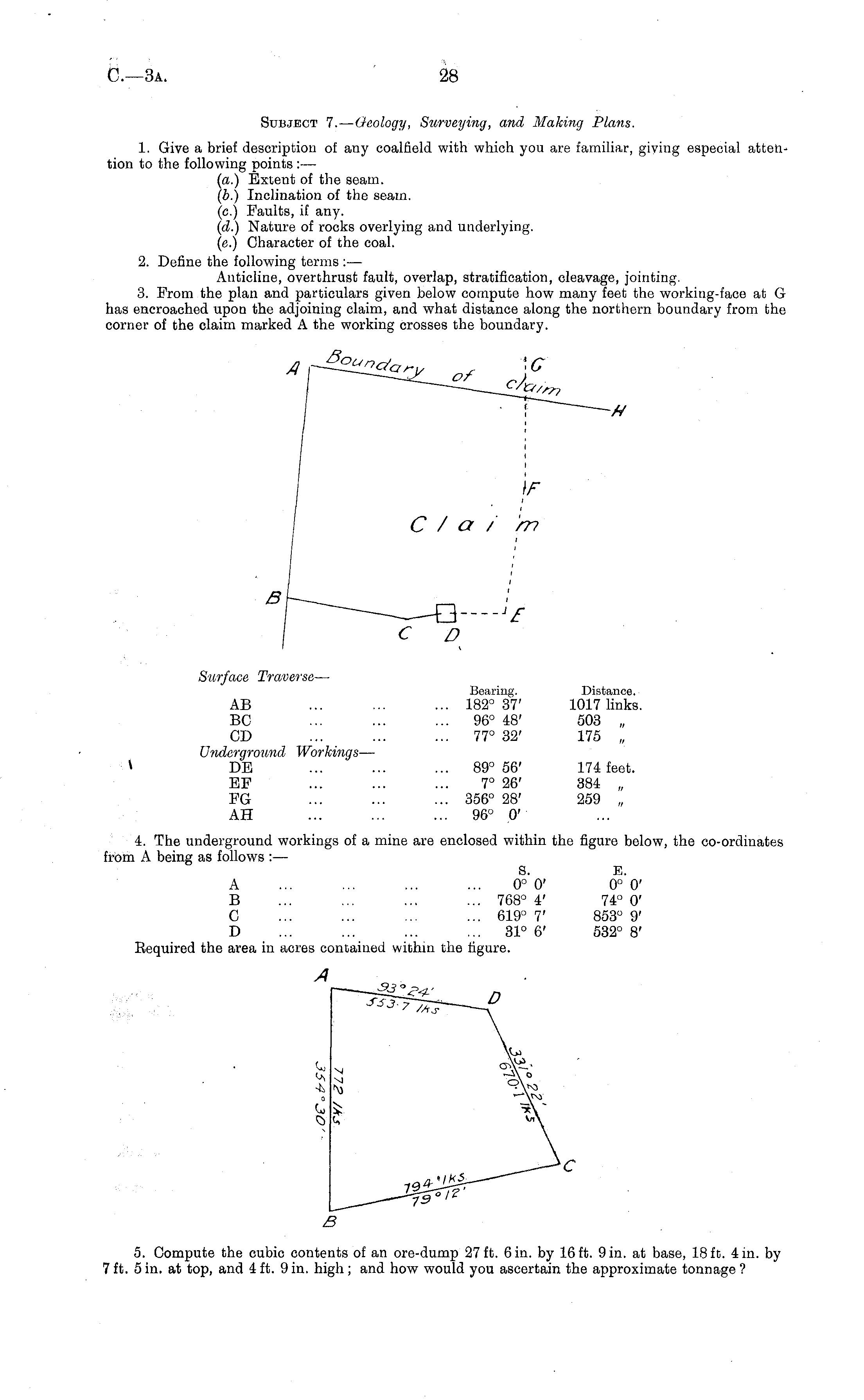 Subject 7. — Geology, Surveying, and Making Plans. 1. Give a brief description of any coalfield with which you are familiar, giving especial attention to the following points : — (a.) Extent of the seam. (b.) Inclination of the seam. (c.) Faults, if any. (d.) Nature of rocks overlying and underlying. (e.) Character of the coal. 2. Define the following terms : — Auticline, overthrust fault, overlap, stratification, cleavage, jointing. 3. From the plan and particulars given below compute how many feet the working-face at G has encroached upon the adjoining claim, and what distance along the northern boundary from the corner of the claim marked A the working crosses the boundary.