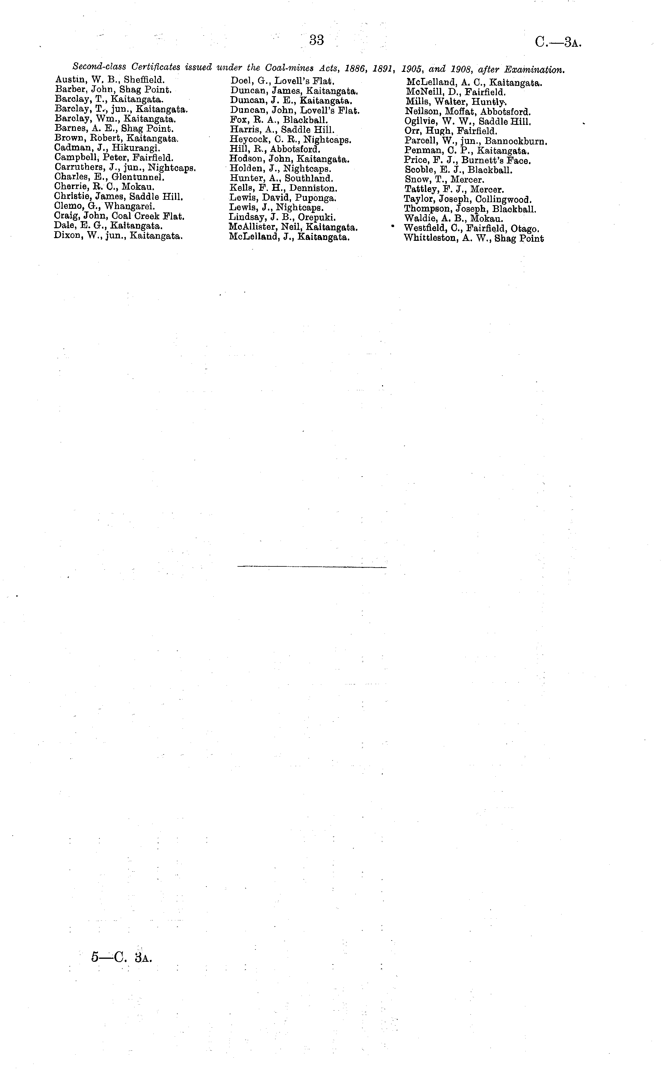 Second-class Certificates issued under the Coal-mines Acts, 1886, 1891, 1905, and 1908, after Examination. Austin, W. 8., Sheffield. Doel, G., Lovell's Flat. McLelland, A. C, Kaitangata. Barber, John, Shag Point. Duncan, James, Kaitangata, MoNeill, D., Fairfield. Barclay, T., Kaitangata. Duncan, J. E., Kaitangata. Mills, Walter, Huntly. Barclay, T., jun., Kaitangata. Duncan, John, Lovell's Flat. Neilson, Moffat, Abbotsford. Barolay, Wm., Kaitangata. Fox, R. A., Blackball. Ogilvie, W. W., Saddle Hill. Barnes, A. E., Shag Point. Harris, A., Saddle Hill. Orr, Hugh, Fairfield. Brown, Robert, Kaitangata. Heycock, C. R., Nightcaps. Parcell, W., jun., Bannookburn. Cadman, J., Hikurangi. Hill, R., Abbotsford. Penman, C. P., Kaitangata. Campbell, Peter, Fairfield. Hodson, John, Kaitangata. Price, F. J., Burnett's Face. Carruthers, J., jun., Nightcaps. Holden, J., Nightcaps. Scoble, E. J., Blackball. Charles, E., Glentunnel. Hunter, A., Southland. Snow, T., Mercer. Cherrie, R. C, Mokau. Kelts, F. H., Denniston. Tattley, F. J., Mercer. Christie, James, Saddle Hill. Lewis, David, Puponga. Taylor, Joseph, Collingwood Clemo, G., Whangarei. Lewis, J., Nightcaps. Thompson, Joseph, Blackball. Craig, John, Coal Creek Flat. Lindsay, J. 8., Orepuki. Waldie, A. 8., Mokau. Dale, E. G., Kaitangata. MoAllister, Neil, Kaitangata. ■ Westfield, C, Fairfield, Otago. Dixon, W., jun., Kaitangata. McLelland, J., Kaitangata. Whittleston, A. W., Shag Point