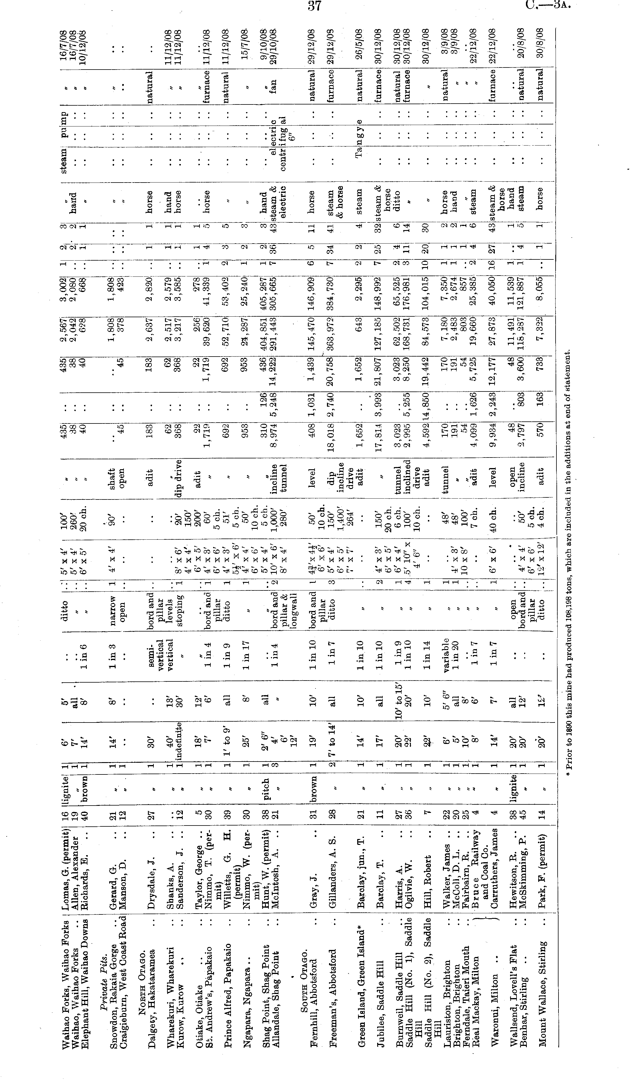 Waihao Forks, Waihao Forks ] Waihao, Waihao Forks .. ; Elephant Hill, Waihao Downs j Lomas, G. (permit) Allen, Alexander Richards, E. 16 19 40 lignite! brown 1 1 1 6' 7' 14' 5' all • 8' lin 6 ditto 5'x4' 5' x 4' 6'x5' 100' 260' 20 ch. ' „ 38 40 38 40 2,042 628 2,080 668 2 1 2 1 hand steam I P ' pu •• |mp •• •• " 16/7/08 10/12/08 •• Private Pits. Snowdon, Rakaia Gorge Craigieburn, West Coast Road Gerard, G. Manson, D. 14' 8' lin 3 narrow 4' x 4' 90' shaft open 1,808 378 1,808 423 21 12 1 1 1 45 45 open •• ••! North Otago. Dalgety, Hakataramea Drysdale, J. 30' semivertical vertical bord and pillar levels stoping adit I 183 183 2,637 2,820 horse natural 27 Wharekuri, Wharekuri Kurow, Kurow Shanks, A. Sanderson, J. .. 12 1 1 40' indefinite 13' 30' i 8' x 6' 4' x 4' 6' x 5' 4' x 3' 6' x6' 4' x3' 5*' x 6' i' x 4' 6' x 6' 5' x 4' 10' x 6' 8' x4' 20' 150' 200' 60' 5 ch. 51' 5 ch. 50' 10 ch. 5 ch. 1,000' 280' dip drive 62 368 62 368 2,517 3,217 2,579 3,585 1 1 1 hand horse 11/12/08 11/12/08 - Otiake, Otiake St. Andrew's, Papakaio Taylor, George .. Nimmo, T. (permit) Willetts, G. H. (permit) Nimmo, W. (permit) Hunt, W. (permit) Mcintosh, A. .. 5 30 1 1 18' 7' 12' 6' lin 4 bord and pillar ditto 1 adit 22 1,719 22 1,719 256 39,620 278 41,339 1 1 4 1 5 horse furnace 11/12/08 Prince Alfred, Papakaio 39 1' to 9' all 1 in 9 692 692 52,710 53,402 8 5 natural 11/12/08 Ngapara, Ngapara 30 1 25' 8' 1 in 17 u 953 953 24,287 25,240; 8 I 15/7/08. Shag Point, Shag Point Allandale, Shag Point 38 21 pitch - 1 3 2' 6" 4' 6' 12' all 1 in 4 bord and pillar & longwall 2 incline tunnel 310 8,974 126 5,248 436 14,222 404,851 291,443 405,287 305,665 1 7 2 36 3 43 hand steam & eleotric eli centr: ecti ifui 6" ectri ifug 6" c al fan 9/10/08 29/10/08 South Otago. Fernhill, Abbotsford Gray, J. 19' 10'. lin 10 bord and pillar ditto 4f'x 4J' 6' x6' 5'x 4' 6' x 5' 7' x 7' 50' 10 ch. 150' 1,400' 264' level 145,470 146,909i horse natural 29/12/08 31 brown 408 1,031 1,439 5 11 Freeman's, Abbotsford Gillanders, A. S. 28 7' to 14' all 1 in 7 3! dip incline j drive adit 18,018 2,740 20,758 363,972 384,730; 34 41 steam & horse .. i •■ furnace 29/12/08 Green Island, Green Island* Barclay, jun., T. 14' 10' 1 in 10 1,652 1,652 643 2,295 2 4| steam Ta ■ n g gy natural 26/5/08 21 Jubilee, Saddle Hill Barclay,!. 11 17' all 1 in 10 ■2 4'x3' 6' x5' 6' x4' 5' 10" x 4' 6" 150' 20 ch. 6 eh. 100' 10 ch. 17,814 3,993 21,807 127,185 148,992 25 32 steam & horse ditto furnace 30/12/08 Burnweil, Saddle Hill Saddle Hill (No. 1), Saddle Hill Saddle Hill (No. 2), Saddle Hill Lauriston, Brighton Brighton, Brighton Ferndale, Taieri Mouth Real Mackay, Milton ) Waronui, Milton .. J Harris, A. Ogilvie, W. 27 36 1 1 20' 22' 10' to 15' 20' 1 in 9 1 in 10 1 4 tunnel inclined drive adit 3,023 2,995 5,255 3,023 8,250 62,502 168,731 65,525 176,981 2 3 4 11 6 14 natural furnace 30/12/08 30/12/08 w „ • • I •• Hill, Robert 7 22' 10' lin 14 4,592 14,850 19,442 84,573 104,015 10 20 30 30/12/08 Walker, James .. McColl.D. L. .. Fairbairn, R. Bruce Railway and Coal Co. Carruthers, James 22 20 25 4 1 1 1 1 6' 5' 10' 8' 5' 6" all 8' 6' variable 1 in 20 1 1 i' x 3' 10 x 8' 48' 48' 100' 7 ch. I tunnel 170 191 54 4,099 170 191 54 5,725 7,180 2,483 803 19,660 7,350 2,674 857 25,385 1 1 1 1 1 4 2 ] 2 1 6 horse hand natural 3/9/08 3/9/08 . i lin 7 ' adit 1,626 2 | steam •• '" ! " i " 22/12/08 4 14' 7' lin 7 6' x 6' 40 ch. level 9,934 2,243 12,177 27,873 40,050 16 27 43 steam & horse hand steam furnace 22/12/08 Wallsend, Lovell's Flat Benhar, Stirling Hewitson, R. McSkimming, P. 38 45 lignite 1 1 20' 20' all 12' open bord and pillar ditto 4' x 4' 6' x6' 12'xl2' 50' 5ch. 4ch. open ! incline 48 2,797 803 48 3,600 11,491 118,287 11,539 121,887 1 ll 4 li 5 naturalj 20/8/08 1 " < 1 Mount Wallace, Stirling Park, F. (permit) 14 20' w adit 570 163 733 7,322 8,055 1 horse ■ • i \ ■■ natural 30/8/08 * Prior to 1890 this mine had produced 108,198 tons, which are included in the additions at end of statement.