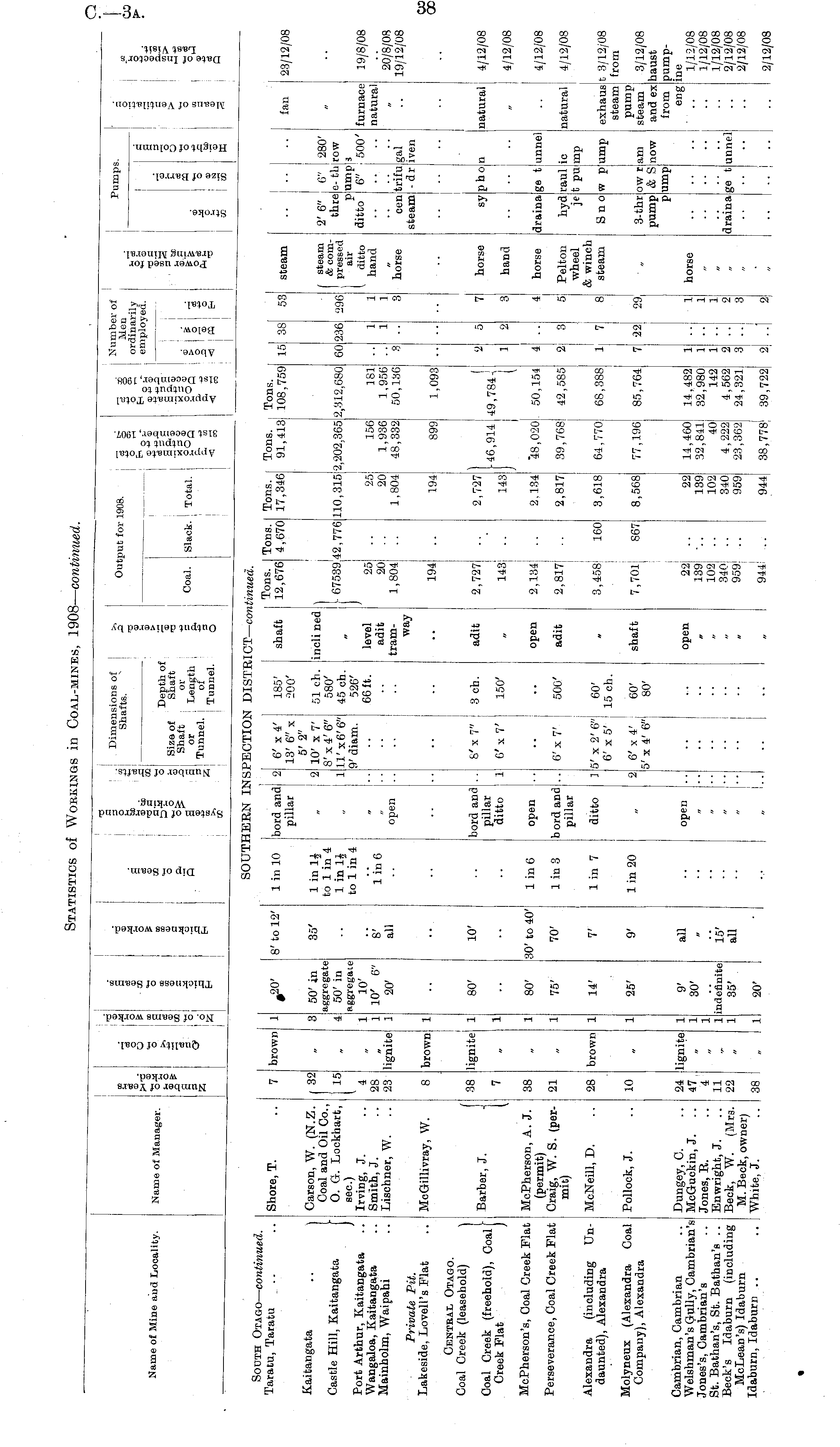 Name of Mine aud Locality. Name of Manager. CC tH ce -HT3 4H O £r= a co CO A a d I 4H O ! r= 44 ' CC * , o o CO o cc co co a EH •a 4H o CQ CO © © cd © cd o ft 5 m o © oi SB © cc CO ! .. Dimensions of | ' .g Shafts. s: — o Depth of & Size of Shaft p Shaft or 3 or Length s Tunnel, of Tunnel. 2 9 © *© fl O Output for 1908. , a g I « CD+ 3 © lis Coal. Slack. Total. gog Number of 3 S Men o S ordinarily E" 1 o u employed. P. 1c CO I c < 55 < » ] eh HH Q cd S C0HH fee Pumps. o CD X fl AS rfl '© o o © o 83 ""' co © AA Q CD C 4. SOUTHERN INS! PECTION DISTRICT— co? tinned. South Otago — continued. Taratu, Taratu 1 in 10 ;bord and 2 pillar 6' x 4' ! 185' shaft 13' 6" x ' 200' 5' 2" I 10' x 7' ; 51 eh. inclined 8' x 4' 6" 580' ll'x6'6" 45 ch. 9' diam. 526' 66 ft. level adit Tons. I 12,676 Tons. 4,670 Tons. 17,346 Tons. 91,413! Shore, T. brown # 20' 8'to 12' Tons. I 108,759 15 38| 53 steam fan 23/12/08 Kaitangata Castle Hill, Kaitangata Port Arthur, Kaitangata Wangaloa, Kaitangata Mainholm, Waipahi Carson, W. (N.Z. Coal and Oil Co., 0. G. Lockhart, sec.) Irving, J. Smith, J. Lischner, W. I 32 15 50' in aggregate 50' in aggregate 10' 10' 6" 20' 35' 1 in 1J „ 2 to 1 in 4 1 in 1J . 1 to 1 in 4 ■ 67539:42,776 ]42,776 110,315 2,202,365 2,312,680 60 '236 296 1 steam 1 & com- { pressed air I ditto hand 2' 6" thre P ditto 6" I e- thj ump! 6" 280' row 500' furnace natural 19/8/08 4 28 23 lignite 1 1 1 all 1 in 6 I .. open 2o! .. 20! .. 1,804i .. 25 20 1,804 156 1,936 48,332 181 1,956 50,136 " 3 1 1 1 1 3 horse oen steam trifu -dri gal iven ! 20/8/08 19/12/08 • • tram- •• Private Pit. Lakeside, Lovell's Flat MoGillivray, W. brown way 194 .. 194 899 1,093 .. I •• Central Otago. Coal Creek (leasehold) \ Coal Creek (freehold), Coal j Creek Flat J Barber, J. J 38 lignite! 80' 10' bord and .. pillar ditto 1 &'x7" 3ch. adit 2,727| .. 143] .. 2,727 146,914] I 2 horse natural 4/12/08 7 49,7845 sy pho| ! n 6' x 7' 150' 143 hand •• - 4/12/08 a 3 ,, McPherson's, Coal Creek Flat McPherson, A. J. (permit) Craig, W. S. (permit) 88 80' 30' to 40' 1 in 6 open open 6' x 7' 500' adit 2,134i .. 2,817 .. 2,134 48,020 50,154 4 horse draina ge tj unnel 4/12/08 Perseverance, Coal Creek Flat 21 75' 70' 1 in 3 b ord and .. pillar 2,817 39,768| 42,585 1 - 3 - Pelton wheel & winch steam hyd raul t pu ic mp natural i 4/12/08 Alexandra (including Undaunted), Alexandra ' McNeill, D. 28 brown 14' 7' 1 in 7 ditto ] 5' x 2' 6" 60' 6' x 5' 15 ch. 3,458' 160 3,618 64,770 ! 68,388 Sn 0 w p ump exhaus steam t 3/12/08 from Molyneux (Alexandra Coal Company), Alexandra Pollock, J. 10 25' 9' 1 1 in 20 „ 2 6' x 4' 60' shaft 5' x 4' 6" 1 80' 7,701 867 8,568 77,196 85,764 3-thr pump P am pump steam and ex from eng 3/12/08 haust pumpine 1/12/08 1/12/08 1/12/08 2/12/08 2/12/08 22 29 Cambrian, Cambrian Welshman's Gully, Cambrian's Jones's, Cambrian's St. Bathan's, St. Bathan's .. Beck's Idaburn (including McLean's) Idaburn Idaburn, Idaburn .. .. | Dungey, C. McGuckin, J. Jones, R. Enwright, J. Beck, W. (Mrs. M. Beck, owner) White, J. 9' 30' all open ow r & S ump now j 24 47 4 11 22 lignite 1 1 1 1 1 open 22 .. 139 -.. 102 .. 340! .. 959 1 .. 22 139 102 340 959 14,460 32,841 40 4,222 23,362 14,482 32,980 142 4,562 24,321 horse indefinite 35' 15' all 1 1 1 2 3 •1 1 1 1 2 - draina ge t •• unnel " " .... " ■■ •■ 38 20' 944 1 .. 944 38,778* 39,722 .. ! 2/12/08