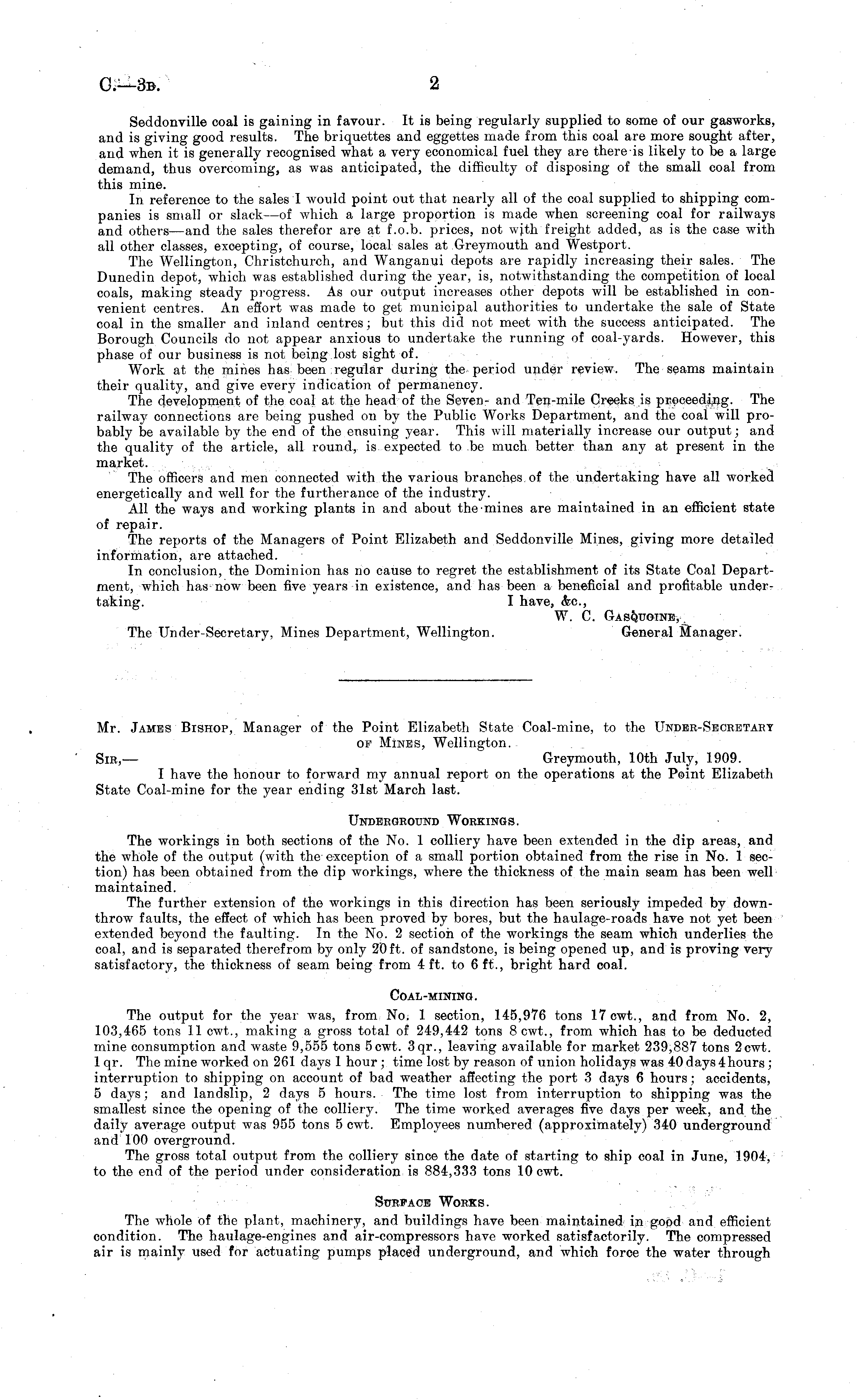 Mr. James BrsHOP, Manager of the Point Elizabeth State Coal-mine, to the Under-Secretary of Mines, Wellington. Sir,— Greymouth, 10th July, 1909. I have the honour to forward my annual report on the operations at the Point Elizabeth State Coal-mine for the year ending 31st March last. Underground Workings. The workings in both sections of the No. 1 colliery have been extended in the dip areas, and the whole of the output (with the exception of a small portion obtained from the rise in No. 1 section) has been obtained from the dip workings, where the thickness of the main seam has been well maintained. The further extension, of the workings in this direction has been seriously impeded by downthrow faults, the effect of which has been proved by bores, but the haulage-roads have not yet been extended beyond the faulting. In the No. 2 section of the workings the seam which underlies the coal, and is separated therefrom by only 20 ft. of sandstone, is being opened up, and is proving very satisfactory, the thickness of seam being from 4 ft. to 6 ft., bright hard coal. Coal-mining. The output for the year was, from No. 1 section, 145,976 tons 17 cwt., and from No. 2, 103,465 tons 11 cwt., making a gross total of 249,442 tons 8 cwt., from which has to be deducted mine consumption and waste 9,555 tons scwt. 3qr., leaving available for market 239,887 tons 2cwt. 1 qr. The mine worked on 261 days 1 hour; time lost by reason of union holidays was 40 days 4hours ; interruption to shipping on account of bad weather affecting the port 3 days 6 hours; accidents, 5 days; and landslip, 2 days 5 hours. The time lost from interruption to shipping was the smallest since the opening of the colliery. The time worked averages five days per week, and the daily average output was 955 tons 5 cwt. Employees numbered (approximately) 340 underground and 100 overground. The gross total output from the colliery since the date of starting to ship coal in June, 1904, to the end of the period under consideration is 884,333 tons 10 cwt. Surface Works. The whole of the plant, machinery, and buildings have been maintained in good and efficient condition. The haulage-engines and air-compressors have worked satisfactorily. The compressed air is mainly used for actuating pumps placed underground, and which force the water through