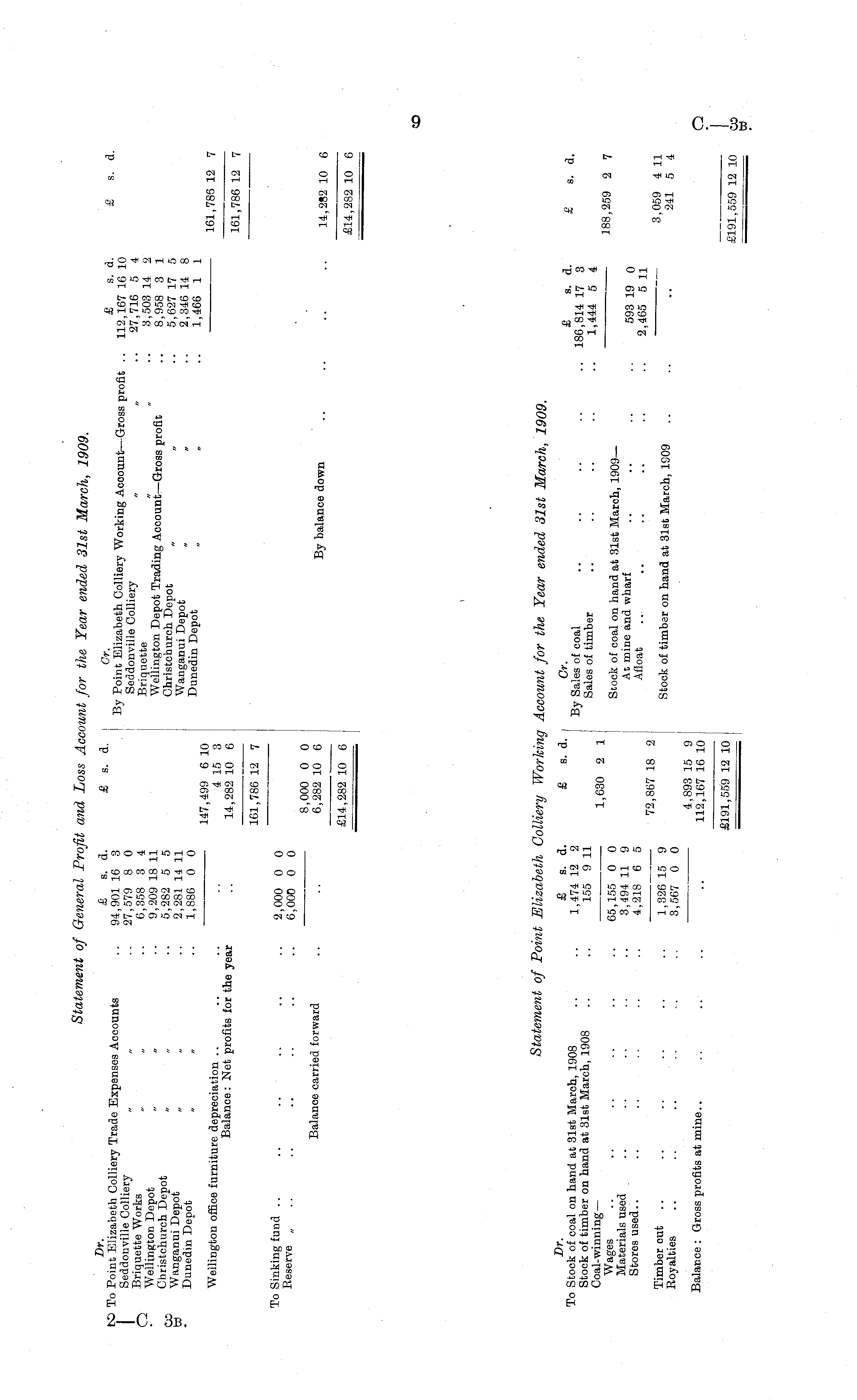 Statement of General Profit and Loss Account for the Year ended 31st March, 1909. E„ r „.w..k./ : : :; %f£ 1 2 St": 1 " 0 """" - - ■■ "•™,»« 147 499 6 10 " -m*"" i JWellington office furniture depreciation .. .. .. .. 4 15 3 161,786 12 7 Balance: Net profits for the year .. 14,282 10 6 161 786 12 161,786 12 7 To Sinking fund .. .. .. ' .. .. .. 2,000 0 0 Reserve ~..... .. .. .. 6,000 0 0 8,000 0 0 . Balance carried forward .. .. 6,282 10 6 By balance down 14,282 10 6 ll^sT^ Statement of Point Elizabeth Colliery Working Account for the Year ended 31st March, 1909. To Stock of coal on hand at 31st March, 1908 .. .. 1,474 12 2"' ' By SalesT'of coal 17 *q *S' dStock of timber on hand at 31st March, 1908 .. .. 155 911 Sales of timber .. .'" ' 1444 w Coal-winning- 1,630 2 1 .... _M«_6J Wages •■ 65,155 0 0 Stock of coal on hand at 31st March, 1909- ' 2 7 Materials used 3,494 11 9 At mine and wharf .... 593 19 O Stores used 4,218 6 5 Afloat " 2 4fil 11 72 867 18 2 •■.... j.aoo a ii mb , e f rout 1,326 15 9 Stock of timber on hand at 31st March, 1909 .. .. ~~ 3 'm? w Royalties .. .. .. .. ... , .. 3,567 00 •• •-. 241 5 4 4,893 15 9 Balance: Gross profits at mine.. .. .. .. .. Xl 2 167 16 10 5191,55 9 ~ >6f19 lg 1Q