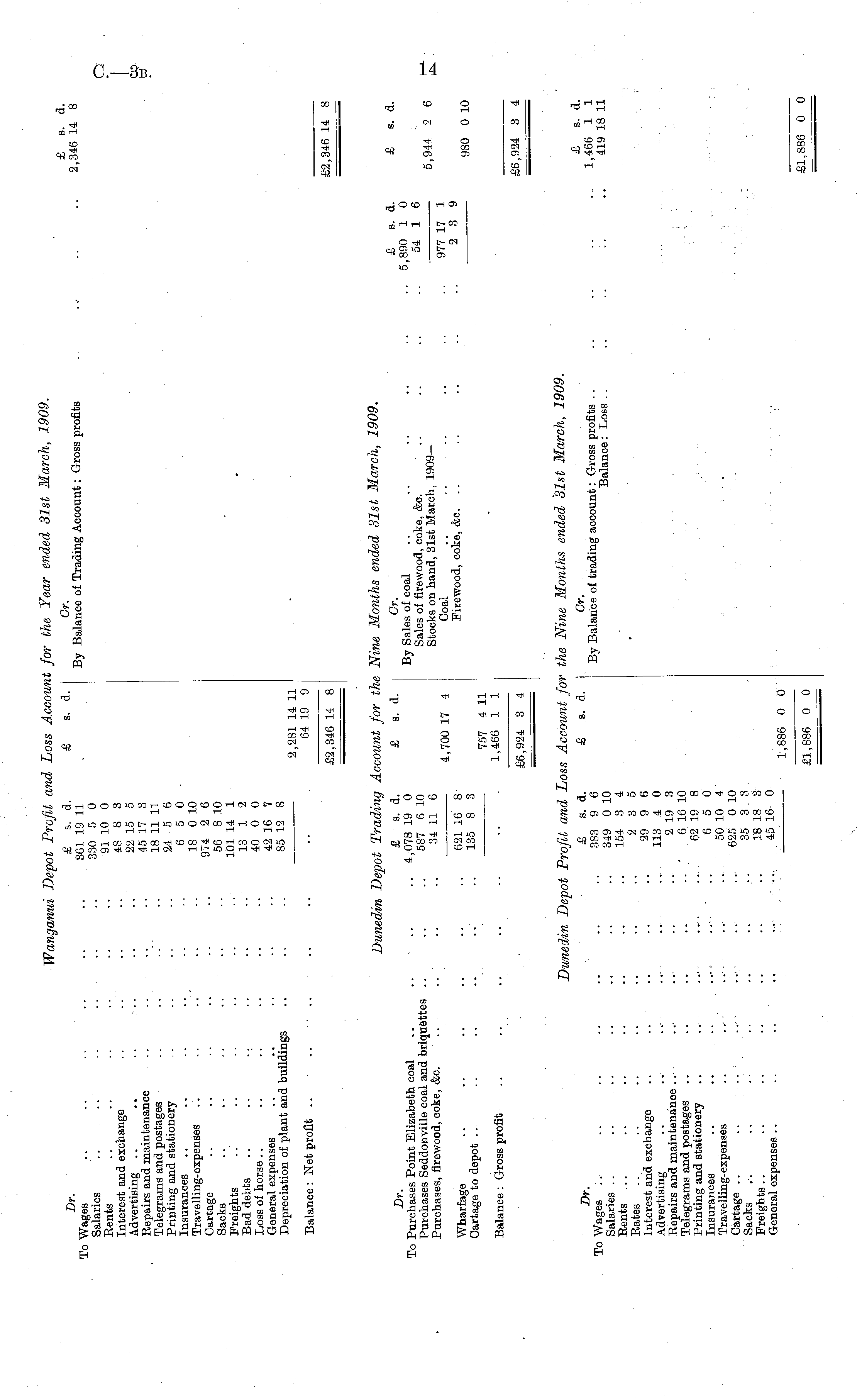 Wanganui Depot Profit and Loss Account for the Year ended 31st March, 1909. n , £ s. d. £ s. d. Or. f ?• d - „ w.. 361 19 11 .By Balance of Trading Account: Gross profits .. ..••• •• -4,34b 14 a Salaries .. •• • • •• •- •• 330 5 0 Rents 91 1° ° Interest and exchange .. .. • • ■ •*8 8 ° Advertising ......••■••• 22 15 5 Repairs and maintenance .. .. • • • •4517 3 Telegrams and postages .. .. •••• 18 11 c Printing and stationery .. .. • • ■ •24 5 6 Insurances .. .. ■• •■ ■■ •■ 650-Travelling-expenses .. .. .." ••■•18 0 10 Cartage 974 2 6 Sacks 56 8 10 Freights ........-•■• 101 14 1 Bad debts .. .. -••■ •• ■•' 13 a Loss of horse .. .. . • • ■ • ■ • •40 0 0 General expenses .. .. . • • • • •4216 7 Depreciation of plant and buildings ...... 85 12 8 „.„„., „ „ r 2,281 14 11 . • Balance: Net profit .. .. .. •••••• 6i 19 9 JM4cTI4~B £2,346 14 8 Dunedin Depot Trading Account for the Nine Months ended 31st March, 1909. Dr £ s. d. £ s. d. Cr. £ s- £ s. d. To Purchases Point Elizabeth coal 4,078 19 0 By Sales of coal 5,890 1 0 Purchases Seddonville coal and briquettes 587 6 10 Sales of firewood coke &c 54 1 b * Purchases, firewood, coke, &c. 34 11 6 Stocks on hand, 31st March, 1909- ' 4,700 17 4 Coal .. •• ■• •■ •• •■ »'' ll 1 Wharfage •• •• 62116 8 Firewood, coke, &c .. .. gBQ QIQ Cartage to depot .. .. .. •• •• ■■ liio a a Balance: Gross profit .. .. .. • • • • • • •1 > *66 1 1 M 4 3 4 £6,924 3 4 Dunedin Depot Profit and Loss Account for the Nine Months ended 31st March, 1909. Dr £ s. d. £ s. d. Cr. f s : d - TnWa „ ' .. .. 383 96 By Balance of trading account: Gross profits .. .. •■ •• •- l,4bb l l Sies ! 349 0 10 Balance: Loss .- •• 419 18 11 Rents 154 3 4 Rates ..........•■••235 Interest and exchange .. .. .. •• • •29 9 6 Advertising .. .. .. — • ■ • ■H3 * 0 Repairs and maintenance .. ............... ' 2 19 8 Telegrams and postages .. .. .. • • ■■• .' 616 10 Printing and stationery .. .. ........ 62 19 8 Insurances .. .. . ■•- • — • •6 5 0 Travelling-expenses .. ....... 50 10 4 , . Cartage .. .. .. .. .. • • ... 625 010 Sacks .. .. .- .. .. •• •• 35 3 3 Freights .. .. .. •• • • • ■ .. 18 18 3 General expenses .. .. .. •• ..... 45 16 0 v ■ 1,886 0 0 £1,886 0 0 £ X ' BB6 ° °