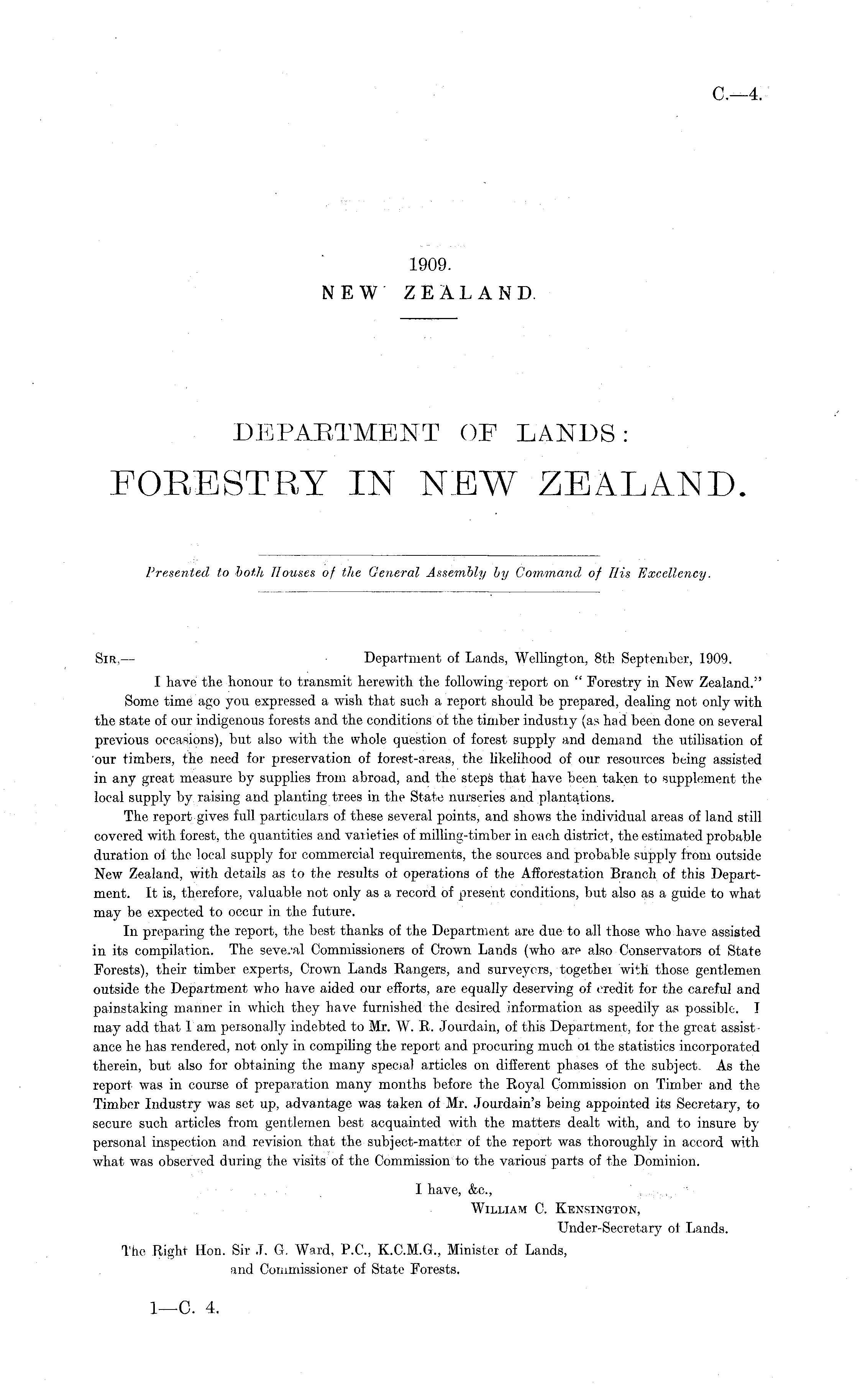 Sir, — Department of Lands, Wellington, Btfc September, 1909. I have the honour to transmit herewith the following report on " Forestry in New Zealand." Some time ago you expressed a wish that such a report should be prepared, dealing not only with the state of our indigenous forests and the conditions of the timber industiy (as had been done on several previous occasions), but also with the whole question of forest supply and demand the utilisation of our timbers, the need for preservation of forest-areas, the likelihood of our resources being assisted in any great measure by supplies from abroad, and the steps that have been taken to supplement the local supply by raising and planting trees in the State nurseries and plantations. The report gives full particulars of these several points, and shows the individual areas of land still covered with forest, the quantities and varieties of milling-timber in each district, the estimated probable duration of the local supply for commercial requirements, the sources and probable supply from outside New Zealand, with details as to the results of operations of the Afforestation Branch of this Department. It is, therefore, valuable not only as a record of present conditions, but also as a guide to what may be expected to occur in the future. In preparing the report, the best thanks of the Department are due to all those who have assisted in its compilation. The several Commissioners of Crown Lands (who are also Conservators of State Forests), their timber experts, Crown Lands Rangers, and surveyors, together with those gentlemen outside the Department who have aided our efforts, are equally deserving of credit for the careful and painstaking manner in which they have furnished the desired information as speedily as possible. T may add that 1 am personally indebted to Mr. W. R. Jourdain, of this Department, for the great assistance he has rendered, not only in compiling the report and procuring much ol the statistics incorporated therein, but also for obtaining the many special articles on different phases of the subject. As the report was in course of preparation many months before the Royal Commission on Timber and the Timber Industry was set up, advantage was taken of Mr. Jourdain's being appointed its Secretary, to secure such articles from gentlemen best acquainted with the matters dealt with, and to insure by personal inspection and revision that the subject-matter of the report was thoroughly in accord with what was observed during the visits of the Commission to the various parts of the Dominion. I have, &c, William C. Kensington, Under-Secretary of Lands. The Right Hon. Sir J. G. Ward, P.C., K.C.M.G., Minister of Lands, and Commissioner of State Forests.