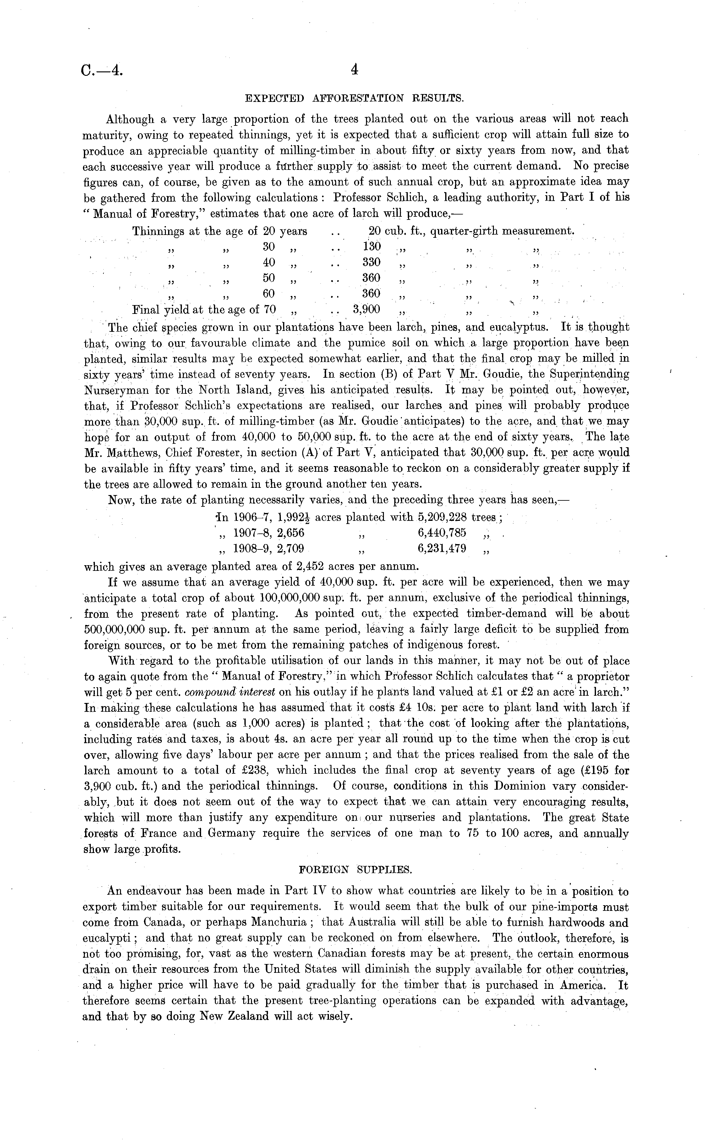 EXPECTED AFFORESTATION RESULTS. Although a very large proportion of the trees planted out on the various areas will not reach maturity, owing to repeated thinnings, yet it is expected that a sufficient crop will attain full size to produce an appreciable quantity of milling-timber in about fifty or sixty years from now, and that each successive year will produce a further supply to assist to meet the current demand. No precise figures can, of course, be given as to the amount of such annual crop, but an approximate idea may be gathered from the following calculations : Professor Schlich, a leading authority, in Part I of his " Manual of Forestry," estimates that one acre of larch will produce,— Thinnings at the age of 20 years .. 20 cub. ft., quarter-girth measurement. 30 „ ..." 130 „ 40 „ .. 330 „ 50 „ .. 360 „ 60 „ .. 360 „ „ ",...,, Final yield at the age of 70 „ . . 3,900 The chief species grown in our plantations have been larch, pines, and eucalyptus. It is thought that, owing to our favourable climate and the pumice soil on which a large proportion have been planted, similar results may be expected somewhat earlier, and that the final crop may be milled in sixty years' time instead of seventy years. In section (B) of Part V Mr. Goudie, the Superintending Nurseryman for the North Island, gives his anticipated results. It may be pointed out, however, that, if Professor Schlich's expectations are realised, our larches and pines will probably produce more than 30,000 sup. ft. of milling-timber (as Mr. Goudie' anticipates) to the acre, and that we may hope for an output of from 40,000 to 50,000 sup. ft. to the acre at the end of sixty years. The late Mr. Matthews, Chief Forester, in section (A)'of Part V, anticipated that 30,000 sup. ft. per acre would be available in fifty years' time, and it seems reasonable to reckon on a considerably greater supply if the trees are allowed to remain in the ground another ten years. Now, the rate of planting necessarily varies, and the preceding three years has seen,— •In 1906-7, 1,992J acres planted with 5,209,228 trees ; „ 1907-8, 2,656 „ 6,440,785 „ . „ 1908-9, 2,709 „ 6,231,479 „ which gives an average planted area of 2,452 acres per annum. If we assume that an average yield of 40,000 sup. ft. per acre will be experienced, then we may anticipate a total crop of about 100,000,000 sup. ft. per annum, exclusive of the periodical thinnings, from the present rate of planting. As pointed out, the expected timber-demand will be about 500,000,000 sup. ft. per annum at the same period, leaving a fairly large deficit to be supplied from foreign sources, or to be met from the remaining patches of indigenous forest. With regard to the profitable utilisation of our lands in this manner, it may not be out of place to again quote from the " Manual of Forestry," in which Professor Schlich calculates that " a proprietor will get 5 per cent, compound interest on his outlay if he plants land valued at £1 or £2 an acre' in larch." In making these calculations he has assumed that it costs £4 10s. per acre to plant land with larch if a considerable area (such as 1,000 acres) is planted ; that the cost of looking after the plantations, including rates and taxes, is about 4s. an acre per year all round up to the time when the crop is cut over, allowing five days' labour per acre per annum ; and that the prices realised from the sale of the larch amount to a total of £238, which includes the final crop at seventy years of age (£195 for 3,900 cub. ft.) and the periodical thinnings. Of course, conditions in this Dominion vary considerably, but it does not seem out of the way to expect that we can attain very encouraging results, which will more than justify any expenditure on our nurseries and plantations. The great State forests of France and Germany require the services of one man to 75 to 100 acres, and annually show large profits. FOREIGN SUPPLIES. An endeavour has been made in Part IV to show what countries are likely to be in a position to export timber suitable for our requirements. It would seem that the bulk of our pine-imports must come from Canada, or perhaps Manchuria ; that Australia will still be able to furnish hardwoods and eucalypti; and that no great supply can be reckoned on from elsewhere. The outlook, therefore, is not too promising, for, vast as the western Canadian forests may be at present, the certain enormous drain on their resources from the United States will diminish the supply available for other countries, and a higher price will have to be paid gradually for the timber that is purchased in America. It therefore seems certain that the present tree-planting operations can be expanded with advantage, and that by so doing New Zealand will act wisely.