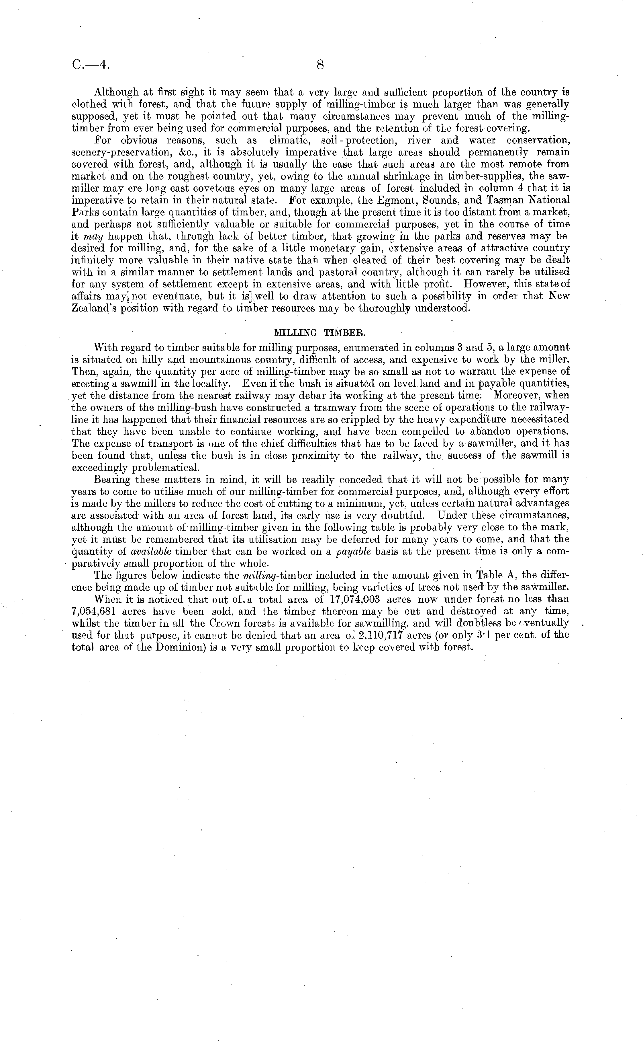 Although at first sight it may seem that a very large and sufficient proportion of the country is clothed with forest, and that the future supply of milling-timber is much larger than was generally supposed, yet it must be pointed out that many circumstances may prevent much of the millingtimber from ever being used for commercial purposes, and the retention of the forest covering. For obvious reasons, such as climatic, soil - protection, river and water conservation, scenery-preservation, &c, it is absolutely imperative that large areas should permanently remain covered with forest, and, although it is usually the case that such areas are the most remote from market and on the roughest country, yet, owing to the annual shrinkage in timber-supplies, the sawmiller may ere long cast covetous eyes on many large areas of forest included in column 4 that it is imperative to retain in their natural state. For example, the Egmont, Sounds, and Tasman National Parks contain large quantities of timber, and, though at the present time it is too distant from a market, and perhaps not sufficiently valuable or suitable for commercial purposes, yet in the course of time it may happen that, through lack of better timber, that growing in the parks and reserves may be desired for milling, and, for the sake of a little monetary gain, extensive areas of attractive country infinitely more valuable in their native state than when cleared of their best covering may be dealt with in a similar manner to settlement lands and pastoral country, although it can rarely be utilised for any system of settlement except in extensive areas, and with little profit. However, this state of affairs eventuate, but it is] well to draw attention to such a possibility in order that New Zealand's position with regard to timber resources may be thoroughly understood. MILLING TIMBER. With regard to timber suitable for milling purposes, enumerated in columns 3 and 5, a large amount is situated on hilly and mountainous country, difficult of access, and expensive to work by the miller. Then, again, the quantity per acre of milling-timber may be so small as not to warrant the expense of erecting a sawmill in the locality. Even if the bush is situated on level land and in payable quantities, yet the distance from the nearest railway may debar its working at the present time. Moreover, when the owners of the milling-bush have constructed a tramway from the scene of operations to the railwayline it has happened that their financial resources are so crippled by the heavy expenditure necessitated that they have been unable to continue working, and have been compelled to abandon operations. The expense of transport is one of the chief difficulties that has to be faced by a sawmiller, and it has been found that, unless the bush is in close proximity to the railway, the success of the sawmill is exceedingly problematical. Bearing these matters in mind, it will be readily conceded that it will not be possible for many years to come to utilise much of our milling-timber for commercial purposes, and, although every effort is made by the millers to reduce the cost of cutting to a minimum, yet, unless certain natural advantages are associated with an area of forest land, its early use is very doubtful. Under these circumstances, although the amount of milling-timber given in the following table is probably very close to the mark, yet it must be remembered that its utilisation may be deferred for many years to come, and that the quantity of available timber that can be worked on a payable basis at the present time is only a comparatively small proportion of the whole. The figures below indicate the milling-timber included in the amount given in Table A, the difference being made up of timber not suitable for milling, being varieties of trees not used by the sawmiller. When it is noticed that out of, a total area of 17,074,003 acres now under forest no less than 7,054,681 acres have been sold, and the timber thereon may be cut and destroyed at any time, whilst the timber in all the Crown forests is available for sawmilling, and will doubtless be < ventually used for that purpose, it cannot be denied that an area of 2,110,717 acres (or only 3 - l per cent, of the total area of the Dominion) is a very small proportion to keep covered with forest.