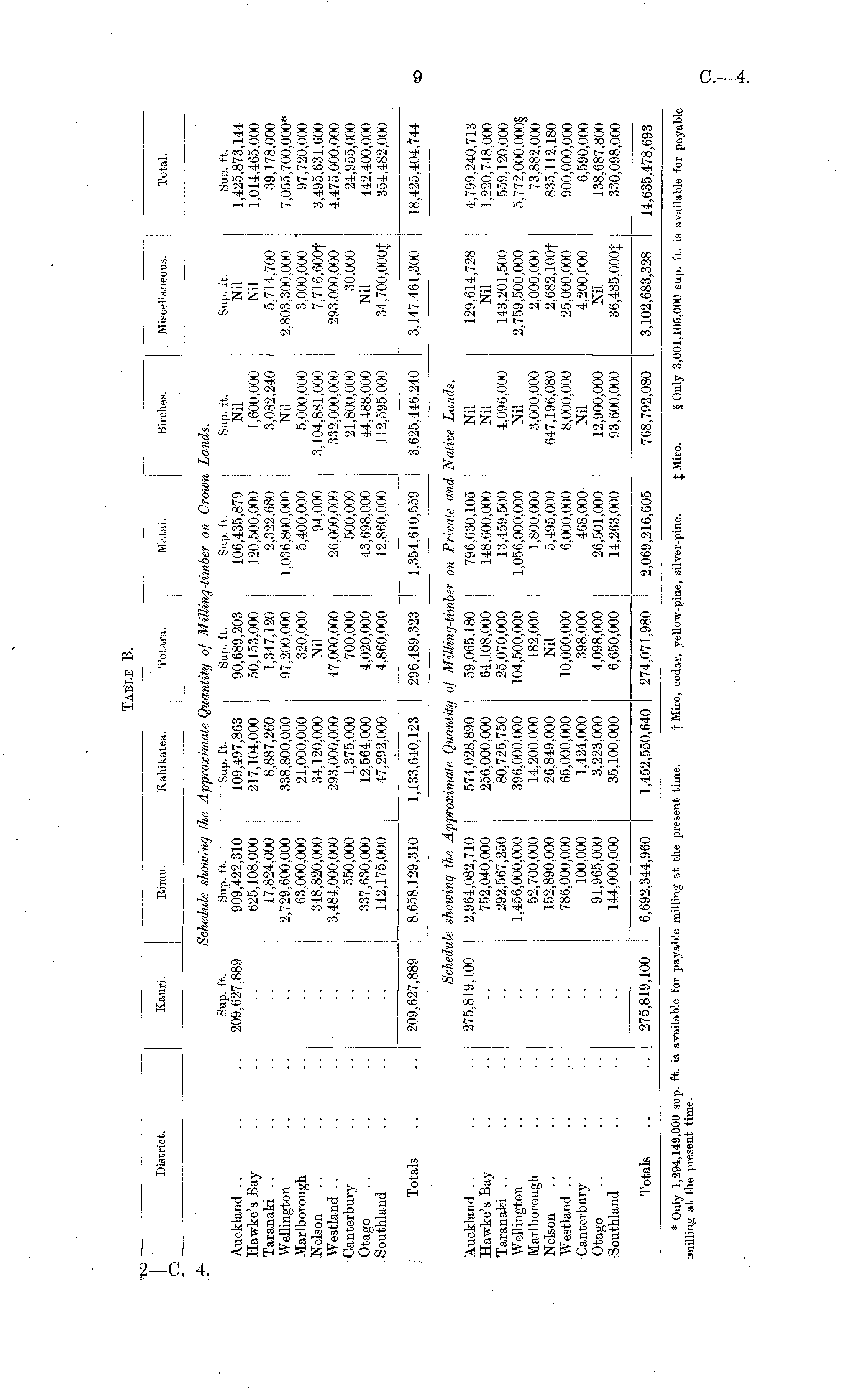 District. Kauri. Rimu. Kahikatea. Totara. Matai. Birches. Miscellaneous. Total. Auckland .. Hawke's Bay Taranaki .. Wellington Marlborough Nelson Westland .. Canterbury Otago Southland Sup. ft, 209,627,889 Schedule showing the Approximate Qu , Sup. ft, . Sup. ft, 909,422,310 109,497,863 625,108,000 217,104,000 17,824,000 8,887,260 2,729,600,000 338,800,000 63,000,000 21,000,000 348,820,000 34,120,000 3,484,000,000 293,000,000 550,000 1,375,000 337,630,000 12,564,000 142,175,000 47,292,000 mtity of Milling-timber on Crown Lands. Sup. ft. Sup. ft. Sup. ft. 90,689,203 106,435,879 Nil 50,153,000 120,500,000 1,600,000 1,347,120 2,322,680 3,082,240 97,200,000 1,036,800,000 Nil 320,000 5,400,000 5,000,000 Nil 94,000 3,104,881,000 47,000,000 26,000,000 332,000,000 700,000 500,000 21,800,000 4,020,000 43,698,000 44,488,000 4.860,000 12.860.000 112.595.000 Sup. ft. Nil Nil 5,714,700 2,803,300,000 3,000,000 ' 7.716,600f 293,000,000 30,000 Nil 34,700.000t Sup. ft, 1,425,873,144 1,014,465.000 39,178,000 7,055,700,000* 97,720,000 3,495,631,600 4,475,000,000 24,955,000 442,400,000 354.482,000 — Totals 209,627,889 8,658,129,310 1,133,640,123 296,489,323 1,354,610,559 3,625,446,240 3,147,461,300 18,425,404,744 liil.ln ahn/HVimn ttio A mcwr-fini.vcvvinia Clmrtvifniiu Auckland . . Hawke's Bay Taranaki .. Wellington Marlborough Nelson Westland . . Canterbury Otago , Southland bchea 275,819,100 Sched'i lute showing the Approximate Quantity 2,964,082,710 574,028,890 752,040,000 256,000,000 292,567,250 80,725,750 1,456,000,000 396,000,000 52,700,000 14,200,000 152,890,000 26,849,000 786,000,000 65,000,000 100,000 1,424,000 91,965,000 3,223,000 144,000,000 35,100,000 le showing the Ap' y iroximate Quantit of Milling-timber on Private and Native Lands. 275,819,100 2,964,082,710 752,040,000 292,567,250 1,456,000,000 52,700,000 152,890,000 786,000,000 100,000 91,965,000 144,000,000 574,028,890 256,000,000 80,725,750 396,000,000 14,200,000 26,849,000 65,000,000 1,424,000 3,223,000 35,100,000 59,065,180 796,630,105 Nil 64,108,000 148,600,000 Nil 25,070,000 13,459,500 4,096,000 104,500,000 1,056,000.000 Nil 182,000 1,800,000 3,000,000 Nil 5,495,000 647,196,080 10,000,000 6.000,000 8,000,000 398,000 468,000 Nil 4,098,000 26,501,000 12,900,000 6,650,000 14,263,000 93,600,000 129,614,728 Nil 143,201,500 2,759,500,000 2,000,000 2,682, 100f 25,000,000 4,200,000 Nil 36.485,000$ 4,799,240,713 1,220,748,000 559,120,000 5,772,000,000§ 73,882,000 835,112,180 900,000,000 6,590,000 138,687,800 330,098,000 _ : _ Totals 275,819,100 275,819,100 6,692,344,960 1,452,550,640 6,692,344,960 1,452,550,640 274,071,980 2,069,216,605 768,792,080 3,102,683,328 14,635,478,693 * Only 1,294,149,000 sup. ft. is available for payable milling at the present time, -'milling at the present time. t Miro, cedar, yellow-pine, silver-pine. J Miro. § Only 3,001,105,000 sup. ft. is available for payabli