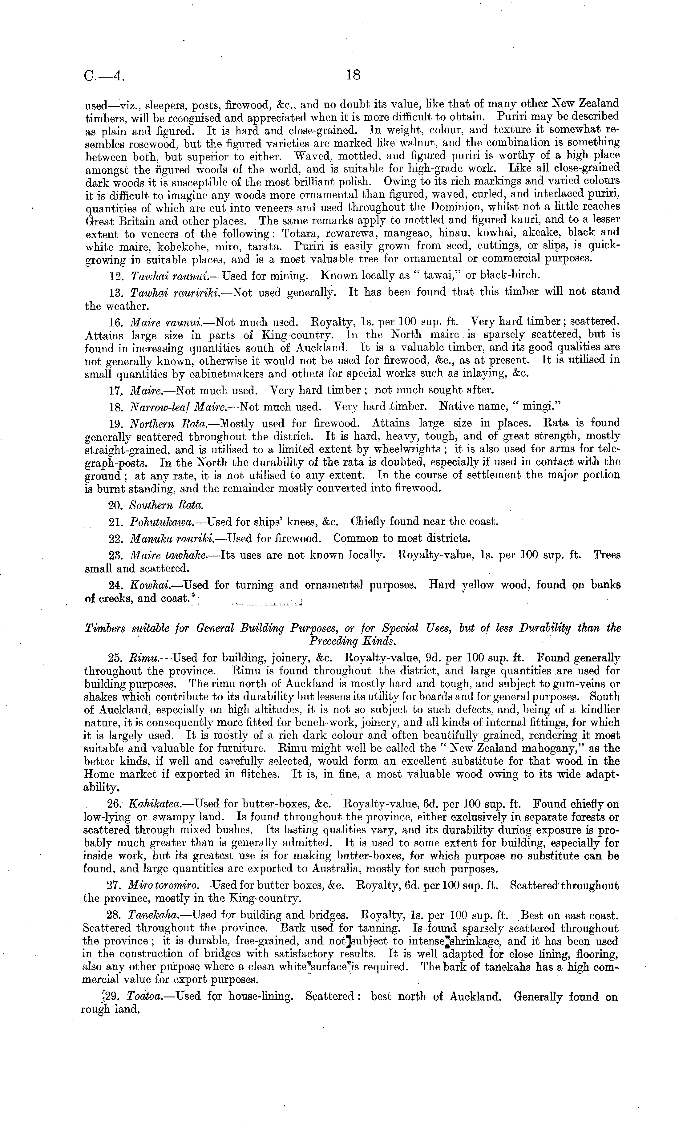 used —viz., sleepers, posts, firewood, &c, and no doubt its value, like that of many other New Zealand timbers, will be recognised and appreciated when it is more difficult to obtain. Puriri may be described as plain and figured. It is hard and close-grained. In weight, colour, and texture it somewhat resembles rosewood, but the figured varieties are marked like walnut, and the combination is something between both, but superior to either. Waved, mottled, and figured puriri is worthy of a high place amongst the figured woods of the world, and is suitable for high-grade work. Like all close-grained dark woods it is susceptible of the most brilliant polish. Owing to its rich markings and varied colours it is difficult to imagine any woods more ornamental than figured, waved, curled, and interlaced puriri, quantities of which are cut into veneers and used throughout the Dominion, whilst not a little reaches Great Britain and other places. The same remarks apply to mottled and figured kauri, and to a lesser extent to veneers of the following: Totara, rewarewa, mangeao, hinau, kowhai, akeake, black and white maire, kohekohe, miro, tarata. Puriri is easily grown from seed, cuttings, or slips, is quickgrowing in suitable places, and is a most valuable tree for ornamental or commercial purposes. 12. Tawhai raunui. —Used for mining. Known locally as " tawai," or black-birch. 13. Tawhai rauririki. —Not used generally. It has been found that this timber will not stand the weather. 16. Maire raunui. —Not much used. Royalty, Is. per 100 sup. ft. Very hard timber; scattered. Attains large size in parts of King-country. In the North maire is sparsely scattered, but is found in increasing quantities south of Auckland. It is a valuable timber, and its good qualities are not generally known, otherwise it would not be used for firewood, &c, as at present. It is utilised in small quantities by cabinetmakers and others for special works such as inlaying, &c. 17. Maire. —Not much used. Very hard timber ; not much sought after. 18. Narrow-leaf Maire. —Not much used. Very hard .timber. Native name, " mingi." 19. Northern Rata. —Mostly used for firewood. Attains large size in places. Rata is found generally scattered throughout the district. It is hard, heavy, tough, and of great strength, mostly straight-grained, and is utilised to a limited extent by wheelwrights ; it is also used for arms for tele-graph-posts. In the North the durability of the rata is doubted, especially if used in contact with the ground ; at any rate, it is not utilised to any extent. In the course of settlement the major portion is burnt standing, and the remainder mostly converted into firewood. 20. Southern Rota. 21. Pohutukawa. —Used for ships' knees, &c. Chiefly found near the coast. 22. Manuka rauriki. —Used for firewood. Common to most districts. 23. Maire tawhake. —lts uses are not known locally. Royalty-value, Is. per 100 sup. ft. Trees small and scattered. 24. Kowhai. —Used for turning and ornamental purposes. Hard yellow wood, found on banks of creeks, and coast. 1 Timbers suitable for General Building Purposes, or for Special Uses, but of less Durability than the Preceding Kinds. 25. Rimu. —Used for building, joinery, &c. Royalty-value, 9d. per 100 sup. ft. Found generally throughout the province. Rimu is found throughout the district, and large quantities are used for building purposes. The rimu north of Auckland is mostly hard and tough, and subject to gum-veins or shakes which contribute to its durability but lessens its utility for boards and for general purposes. South of Auckland, especially on high altitudes, it is not so subject to such defects, and, being of a kindlier nature, it is consequently more fitted for bench-work, joinery, and all kinds of internal fittings, for which it is largely used. It is mostly of a rich dark colour and often beautifully grained, rendering it most suitable and valuable for furniture. Rimu might well be called the " New Zealand mahogany," as the better kinds, if well and carefully selected, would form an excellent substitute for that wood in the Home market if exported in flitches. It is, in fine, a most valuable wood owing to its wide adaptability. 26. Kahikatea. —Used for butter-boxes, &c. Royalty-value, 6d. per 100 sup. ft. Found chiefly on low-lying or swampy land. Is found throughout the province, either exclusively in separate forests or scattered through mixed bushes. Its lasting qualities vary, and its durability during exposure is probably much greater than is generally admitted. It is used to some extent for building, especially for inside work, but its greatest use is for making butter-boxes, for which purpose no substitute can be found, and large quantities are exported to Australia, mostly for such purposes. 27. Miro toromiro. —Used for butter-boxes, &c. Royalty, 6d. per 100 sup. ft. Scattered'throughout the province, mostly in the King-country. 28. Tanekaha. —Used for building and bridges. Royalty, Is. per 100 sup. ft. Best on east coast. Scattered throughout the province. Bark used for tanning. Is found sparsely scattered throughout the province ; it is durable, free-grained, and to intense and it has been used in the construction of bridges with satisfactory results. It is well adapted for close lining, flooring, also any other purpose where a clean required. The bark of tanekaha has a high commercial value for export purposes. J29. Toatoa. —Used for house-hning. Scattered : best north of Auckland. Generally found on rough land.