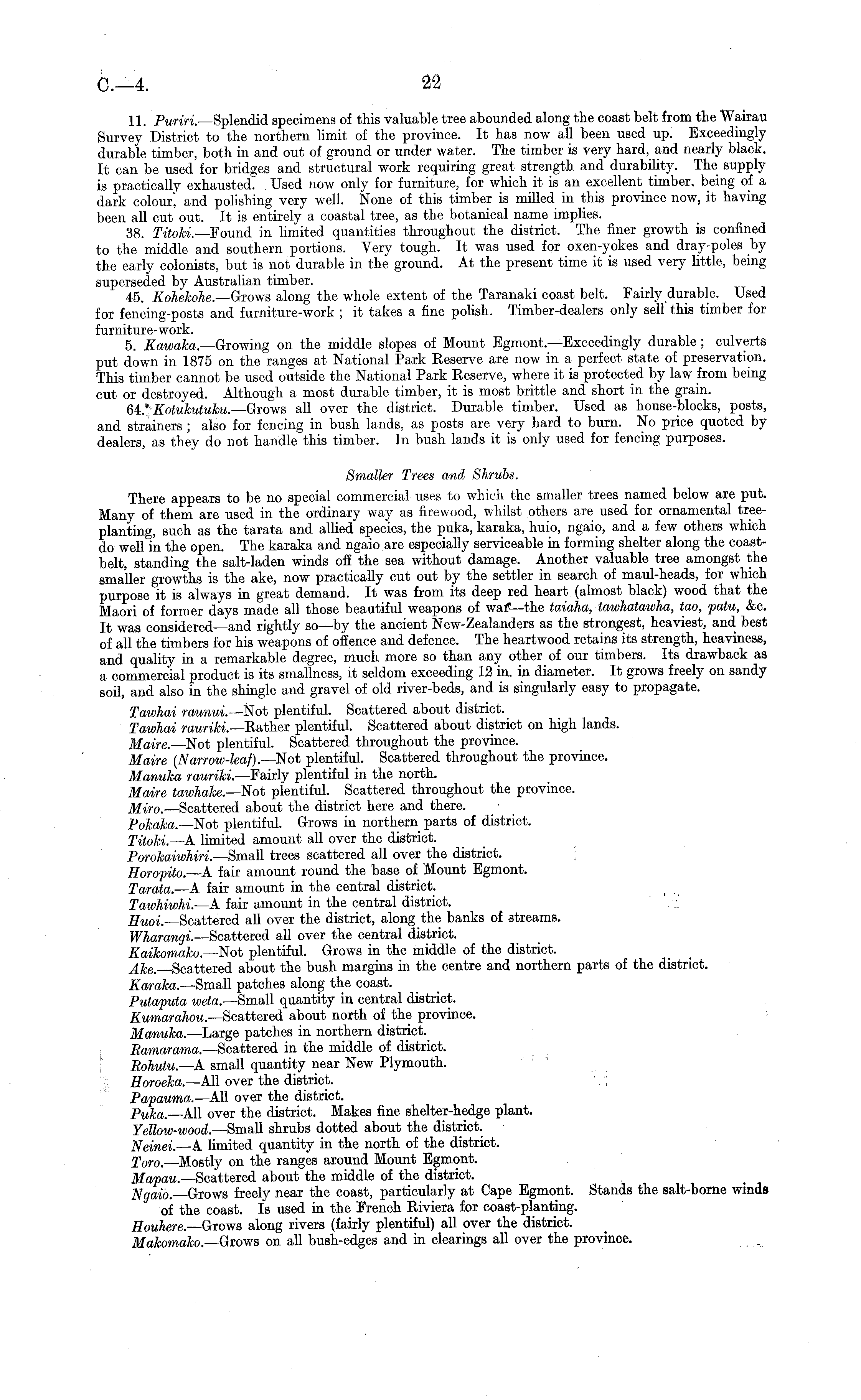 11. Puriri. —Splendid specimens of this valuable tree abounded along the coast belt from the Wairau Survey District to the northern limit of the province. It has now all been used up. Exceedingly durable timber, both in and out of ground or under water. The timber is very hard, and nearly black. It can be used for bridges and structural work requiring great strength and durability. The supply is practically exhausted. . Used now only for furniture, for which it is an excellent timber, being of a dark colour", and polishing very well. None of this timber is milled in this province now, it having been all cut out. It is entirely a coastal tree, as the botanical name implies. 38. Titoki.— Found in limited quantities throughout the district. The finer growth is confined to the middle and southern portions. Very tough. It was used for oxen-yokes and dray-poles by the early colonists, but is not durable in the ground. At the present time it is used very little, being superseded by Australian timber. 45. Kohekohe.— Grows along the whole extent of the Taranaki coast belt. Fairly durable. Used for fencing-posts and furniture-work ; it takes a fine polish. Timber-dealers only sell this timber for furniture-work. 5. Kawaka — Growing on the middle slopes of Mount Egmont.—Exceedingly durable ; culverts put down in 1875 on the ranges at National Park Reserve are now in a perfect state of preservation. This timber cannot be used outside the National Park Reserve, where it is protected by law from being cut or destroyed. Although a most durable timber, it is most brittle and short in the grain. 64.* Kotukutuku.— Grows all over the district. Durable timber. Used as house-blocks, posts, and strainers ; also for fencing in bush lands, as posts are very hard to burn. No price quoted by dealers, as they do not handle this timber. In bush lands it is only used for fencing purposes. Smaller Trees and Shrubs. There appears to be no special commercial uses to which the smaller trees named below are put. Many of them are used in the ordinary way as firewood, whilst others are used for ornamental treeplanting, such as the tarata and allied species, the puka, karaka, huio, ngaio, and a few others which do well in the open. The karaka and ngaio are especially serviceable in forming shelter along the coastbelt, standing the salt-laden winds off the sea without damage. Another valuable tree amongst the smaller growths is the ake, now practically cut out by the settler in search of maul-heads, for which purpose it is always in great demand. It was from its deep red heart (almost black) wood that the Maori of former days made all those beautiful weapons of waf—the taiaha, tawhatawha, too, patu, &c. It was considered—and rightly so—by the ancient New-Zealanders as the strongest, heaviest, and. best of all the timbers for his weapons of offence and defence. The heartwood retains its strength, heaviness, and quality in a remarkable degree, much more so than any other of our timbers. Its drawback as a commercial product is its smallness, it seldom exceeding 12 in. in diameter. It grows freely on sandy soil, and also in the shingle and gravel of old river-beds, and is singularly easy to propagate. Tawhai raunui.— Not plentiful. Scattered about district. Tawhai rauriki.—Rather plentiful. Scattered about district on high lands. Maire.— Not plentiful. Scattered throughout the province. Maire (Narrow-leaf).— Not plentiful. Scattered throughout the province. Manuka rauriki.— Fairly plentiful in the north. Maire tawhake.— Not plentiful. Scattered throughout the province. Miro. —Scattered about the district here and there. Pokaka— Not plentiful. Grows in northern parts of district. Titoki.—A limited amount all over the district. Porokaiwhiri. —Small trees scattered all over the district. ] Horopito. —A fair amount round the base of Mount Egmont. Tarata. —A fair amount in the central district. Tawhiwhi. —A fair amount in the central district. ' ; Huoi. —Scattered all over the district, along the banks of Btreams. Wharangi. —Scattered all over the central district. Kaikomako— Not plentiful. Grows in the middle of the district. Scattered about the bush margins in the centre and northern parts of the district. Karaka. —Small patches along the coast. Putaputa weta— Small quantity in central district. Kumarahou— Scattered about north of the province. Manuka.—Large patches in northern district Ramarama. —Scattered in the middle of district. I Rohutu.—A small quantity near New Plymouth. Horoeka. —All over the district. Papauma. —All over the district. Puka.— All over the district. Makes fine shelter-hedge plant. Yellow-wood. —Small shrubs dotted about the district. Neinei.—A limited quantity in the north of the district. Two. —Mostly on the ranges around Mount Egmont. Mapau.— Scattered about the middle of the district. Ngaio. Grows freely near the coast, particularly at Cape Egmont. Stands the salt-borne winds of the coast. Is used in the French Riviera for coast-planting. Houhere. —Grows along rivers (fairly plentiful) all over the district. Makomako— Grows on all bush-edges and in clearings all over the province.
