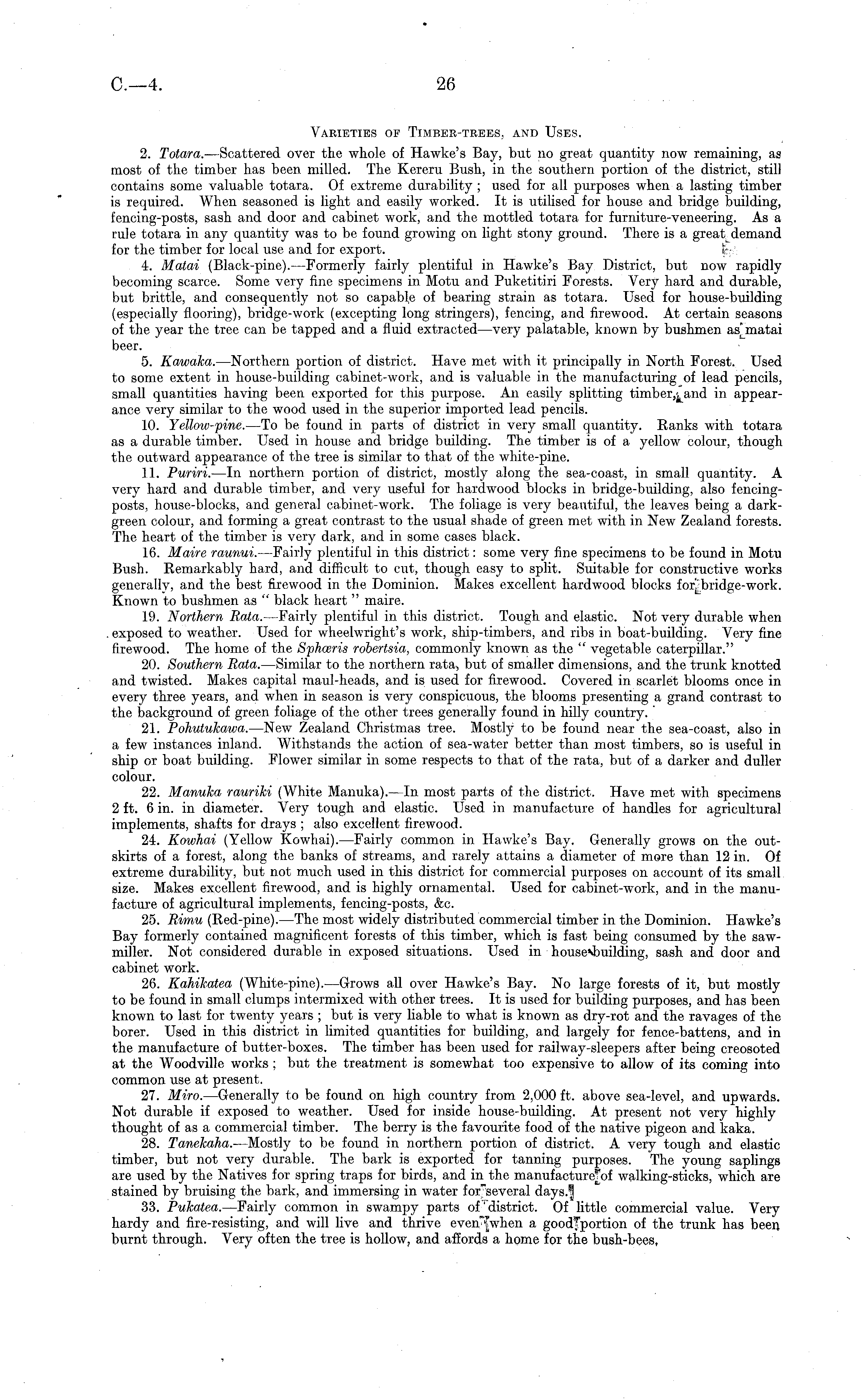 Varieties of Timber-trees, and Uses. 2. Totara. —Scattered over the whole of Hawke's Bay, but no great quantity now remaining, as most of the timber has been milled. The Kereru Bush, in the southern portion of the district, still contains some valuable totara. Of extreme durability ; used for all purposes when a lasting timber is required. When seasoned is light and easily worked. It is utilised for house and bridge building, fencing-posts, sash and door and cabinet work, and the mottled totara for furniture-veneering. As a rule totara in any quantity was to be found growing on light stony ground. There is a great t demand for the timber for local use and for export. t--4. Matai (Black-pine).—Formerly fairly plentiful in Hawke's Bay District, but now rapidly becoming scarce. Some very fine specimens in Motu and Puketitiri Forests. Very hard and durable, but brittle, and consequently not so capable of bearing strain as totara. Used for house-building (especially flooring), bridge-work (excepting long stringers), fencing, and firewood. At certain seasons of the year the tree can be tapped and a fluid extracted —very palatable, known by bushmen asjnatai beer. 5. Kawaka. —Northern portion of district. Have met with it principally in North Forest. Used to some extent in house-building cabinet-work, and is valuable in the manufacturing of lead pencils, small quantities having been exported for this purpose. An easily splitting in appearance very similar to the wood used in the superior imported lead pencils. 10. Yellow-pine. —To be found in parts of district in very small quantity. Ranks with totara as a durable timber. Used in house and bridge building. The timber is of a yellow colour, though the outward appearance of the tree is similar to that of the white-pine. 11. Puriri. —ln northern portion of district, mostly along the sea-coast, in small quantity. A very hard and durable timber, and very useful for hardwood blocks in bridge-building, also fencingposts, house-blocks, and general cabinet-work. The foliage is very beautiful, the leaves being a darkgreen colour, and forming a great contrast to the usual shade of green met with in New Zealand forests. The heart of the timber is very dark, and in some cases black. 16. Maire raunui. —Fairly plentiful in this district: some very fine specimens to be found in Motu Bush. Remarkably hard, and difficult to cut, though easy to split. Suitable for constructive works generally, and the best firewood in the Dominion. Makes excellent hardwood blocks for/bridge-work. Known to bushmen as " black heart" maire. 19. Northern Rata. —Fairly plentiful in this district. Tough and elastic. Not very durable when exposed to weather. Used for wheelwright's work, ship-timbers, and ribs in boat-building. Very fine firewood. The home of the Sphceris robertsia, commonly known as the " vegetable caterpillar." 20. Southern Rata. —Similar to the northern rata, but of smaller dimensions, and the trunk knotted and twisted. Makes capital maul-heads, and is used for firewood. Covered in scarlet blooms once in every three years, and when in season is very conspicuous, the blooms presenting a grand contrast to the background of green foliage of the other trees generally found in hilly country. 21. Pohutukawa. —New Zealand Christmas tree. Mostly to be found near the sea-coast, also in a few instances inland. Withstands the action of sea-water better than most timbers, so is useful in ship or boat building. Flower similar in some respects to that of the rata, but of a darker and duller colour. 22. Manuka rauriki (White Manuka). —In most parts of the district. Have met with specimens 2 ft. 6 in. in diameter. Very tough and elastic. Used in manufacture of handles for agricultural implements, shafts for drays ; also excellent firewood. 24. Kowhai (Yellow Kowhai). —Fairly common in Hawke's Bay. Generally grows on the outskirts of a forest, along the banks of streams, and rarely attains a diameter of more than 12 in. Of extreme durability, but not much used in this district for commercial purposes on account of its small size. Makes excellent firewood, and is highly ornamental. Used for cabinet-work, and in the manufacture of agricultural implements, fencing-posts, &c. 25. Rimu (Red-pine). —The most widely distributed commercial timber in the Dominion. Hawke's Bay formerly contained magnificent forests of this timber, which is fast being consumed by the sawmiller. Not considered durable in exposed situations. Used in housebuilding, sash and door and cabinet work. 26. Kahikatea (White-pine).—Grows all over Hawke's Bay. No large forests of it, but mostly to be found in small clumps intermixed with other trees. It is used for building purposes, and has been known to last for twenty years ; but is very liable to what is known as dry-rot and the ravages of the borer. Used in this district in limited quantities for building, and largely for fence-battens, and in the manufacture of butter-boxes. The timber has been used for railway-sleepers after being creosoted at the Woodville works ; but the treatment is somewhat too expensive to allow of its coming into common use at present. 27. Miro. —Generally to be found on high country from 2,000 ft. above sea-level, and upwards. Not durable if exposed to weather. Used for inside house-building. At present not very highly thought of as a commercial timber. The berry is the favourite food of the native pigeon and kaka. 28. Tanekaha. —Mostly to be found in northern portion of district. A very tough and elastic timber, but not very durable. The bark is exported for tanning purposes. The young saplings are used by the Natives for spring traps for birds, and in the walking-sticks, which are stained by bruising the bark, and immersing in water forseveral days.'J 33. Pukatea. —Fairly common in swampy parts of'district. Of little commercial value. Very hardy and fire-resisting, and will live and thrive even~|when a goodjp