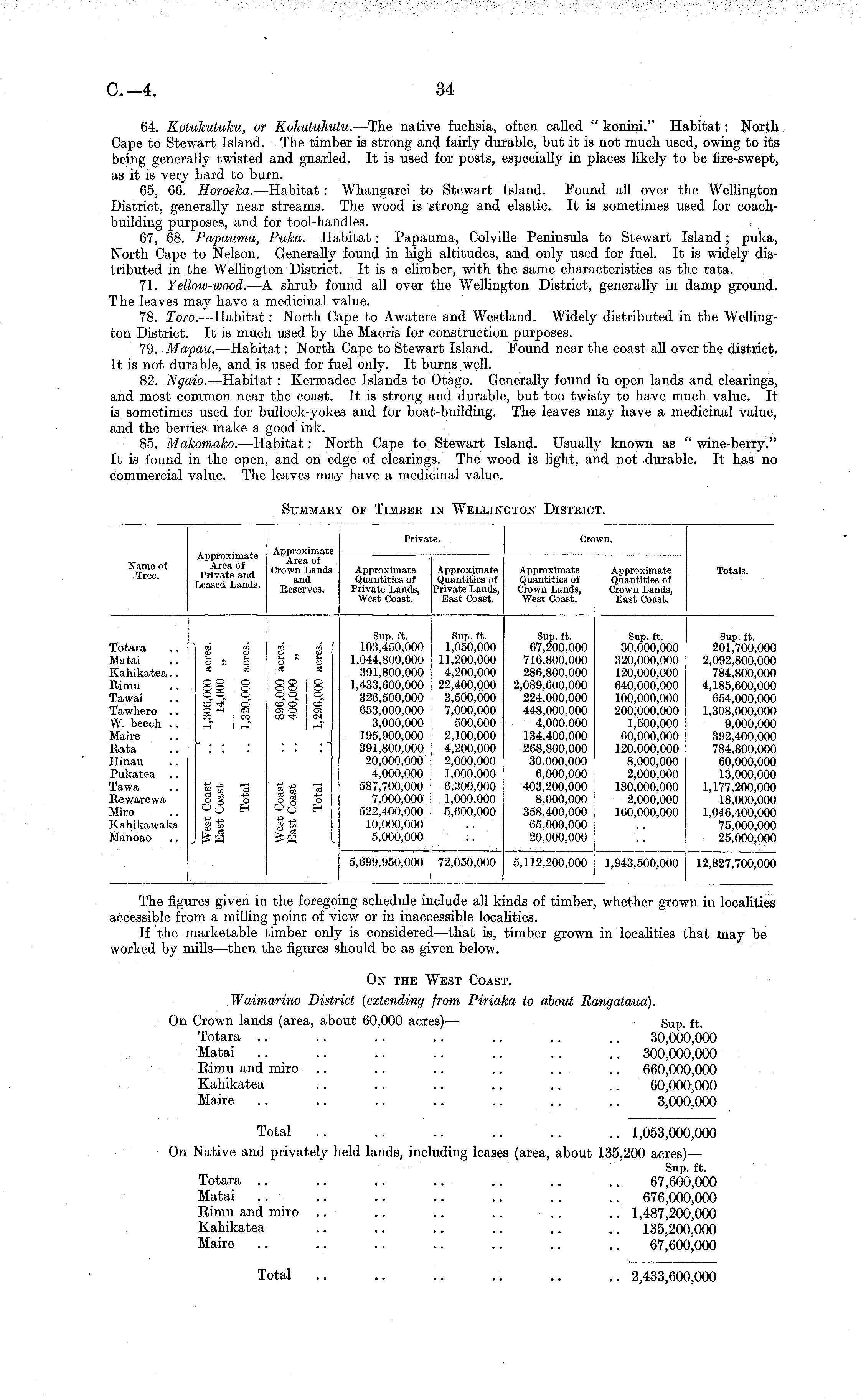 The figures given in the foregoing schedule include all kinds of timber, whether grown in localities accessible from a milling point of view or in inaccessible localities. If the marketable timber only is considered—that is, timber grown in localities that may be worked by mills—then the figures should be as given below. On the West Coast. Waimarino District (extending from Piriaka to about Rangataua). On Crown lands (area, about 60,000 acres) — Sup. ft. Totara .. .. .. .. .. .. .. 30,000,000 Matai .. .. .. .. .. .. .. 300,000,000 Rimu and miro .. .. .. .. .. .. 660,000,000 Kahikatea .. .. .. .. .. .. 60,000,000 Maire .. .. .. .. .. .. .. 3,000,000 Total .. .. .. .. .. .. 1,053,000,000 On Native and privately held lands, including leases (area, about 135,200 acres) — Sup. ft. Totara .. .. .. .. .. .. ... 67,600,000 Matai .. .. .. .. .. .. .. 676,000,000 Rimu and miro .. .. .. .. .. .. 1,487,200,000 Kahikatea .. .. .. .. .. .. 135,200,000 Maire .. .. .. .. .. .. .. 67,600,000 Total .. .. .. .. .. .. 2,433,600,000