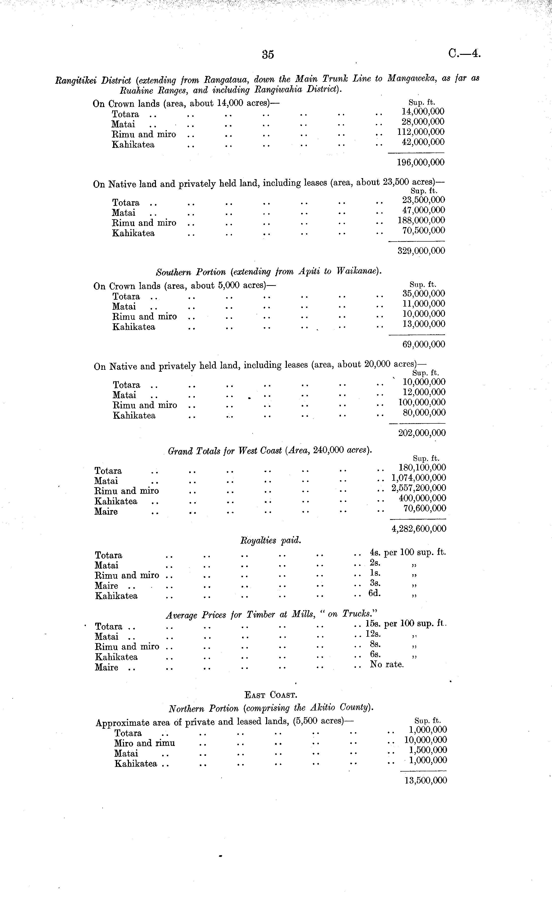 Rangitikei District (extending from Rangataua, down the Main Trunk Line to Mangaweka, as far as Ruahine Ranges, and including Rangiwahia District). On Crown lands (area, about 14,000 acres)— Sup. ft. Totara 14,000,000 Matai .. 28,000,000 Rimu and miro 112,000,000 Kahikatea •• 42,000,000 196,000,000 On Native land and privately held land, including leases (area, about 23,500 acres)— Sup. ft. Totara 23,500,000 Matai •• •• •• 47,000,000 Rimu and miro '.'. 188,000,000 Kahikatea 70,500,000 329,000,000 Southern Portion (extending from Apiti to Waikanae). On Crown lands (area, about 5,000 acres) — Sup. ft. Totara .. 35,000,000 Matai 11,000,000 Rimu and miro .. .. .. • • • • • • 10,000,000 Kahikatea •• •• 13,000,000 69,000,000 On Native and privately held land, including leases (area, about 20,000 acres) — Sup. ft. Totara ' 10,000,000 Matai • •• •• •■ 12,000,000 Rimu and miro '.'. 100,000,000 Kahikatea •• •• 80,000,000 202,000,000 Grand Totals for West Coast (Area, 240,000 acres). Sup. ft. Totara . •• •• •• •• 180,100,000 Matai '.'. 1,074,000,000 Rimu and miro 2,557,200,000 Kahikatea 400,000,000 Maire 70,600,000 4,282,600,000 Royalties paid. Totara 4s. per 100 sup. ft. Matai .. . • • • • • • • .. 2s. „ Rimu and miro .. .. • • • • • • .. Is. „ Maire .... .. .. • • • • .. 3s. ~ Kahikatea .. .. • • • • • • .. 6d. „ Average Prices for Timber at Mills, " on Trucks." ■ Totara 15s. per 100 sup. ft. Matai .. .. • • • • • • • • • • l 2s - Rimu and miro .. .. • • • • • • .. Bs. ~ Kahikatea .. .. • • • • • • .. 6s. „ Maire No rate. East Coast. Northern Portion (comprising the Akitio County). Approximate area of private and leased lands, (5,500 acres) — Sup. ft. Totara 1,000,000 Miro and rimu 10,000,000 Matai L500.000 Kahikatea 1.000.000 13,500,000