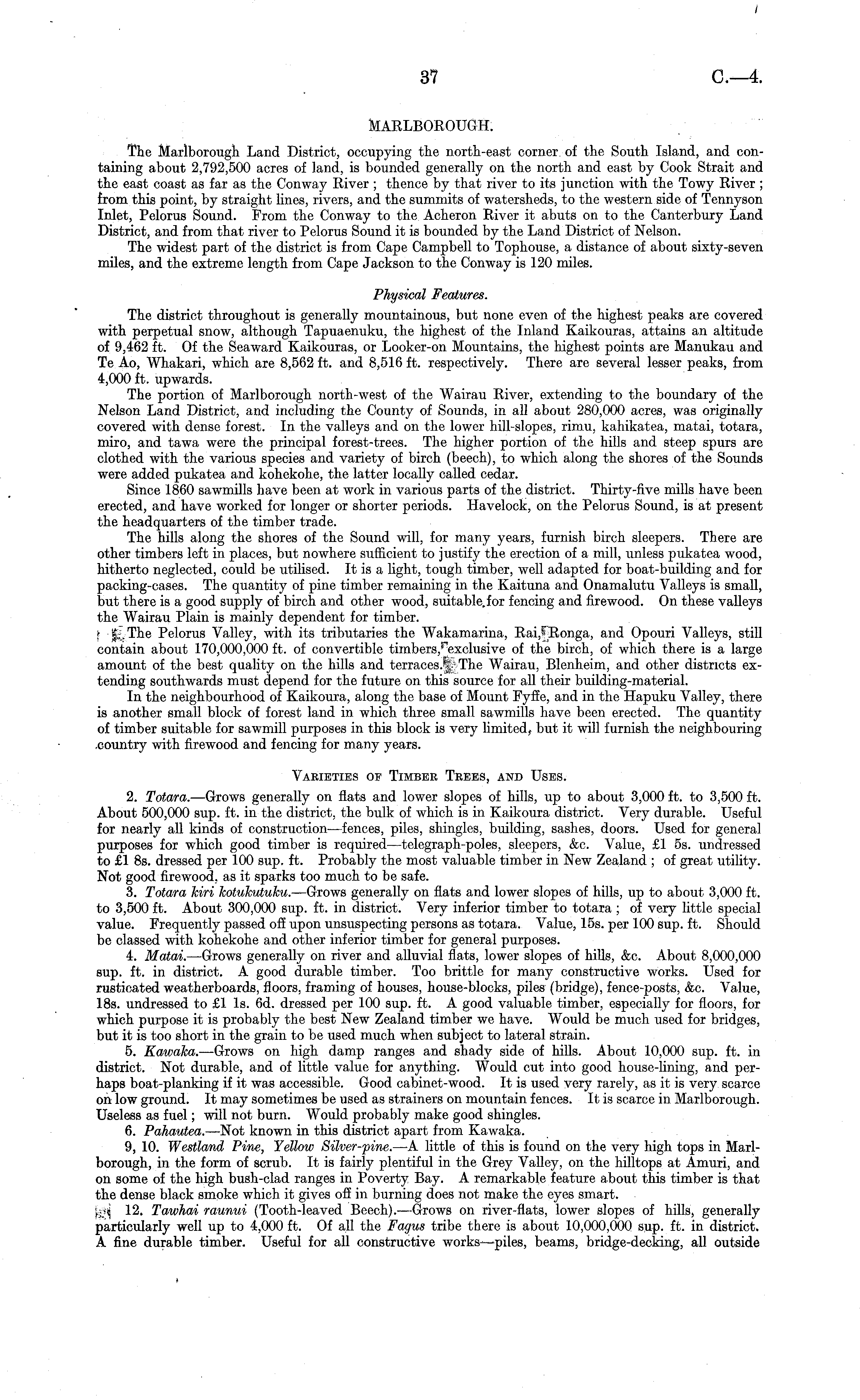 MARLBOROUGH. The Marlborough Land District, occupying the north-east corner, of the South Island, and containing about 2,792,500 acres of land, is bounded generally on the north and east by Cook Strait and the east coast as far as the Conway River ; thence by that river to its junction with the Towy River ; from this point, by straight lines, rivers, and the summits of watersheds, to the western side of Tennyson Inlet, Pelorus Sound. From the Conway to the Acheron River it abuts on to the Canterbury Land District, and from that river to Pelorus Sound it is bounded by the Land District of Nelson. The widest part of the district is from Cape Campbell to Tophouse, a distance of about sixty-seven miles, and the extreme length from Cape Jackson to the Conway is 120 miles. Physical Features. The district throughout is generally mountainous, but none even of the highest peaks are covered with perpetual snow, although Tapuaenuku, the highest of the Inland Kaikouras, attains an altitude of 9,462 ft. Of the Seaward Kaikouras, or Looker-on Mountains, the highest points are Manukau and Te Ao, Whakari, which are 8,562 ft. and 8,516 ft. respectively. There are several lesser peaks, from 4,000 ft. upwards. The portion of Marlborough north-west of the Wairau River, extending to the boundary of the Nelson Land District, and including the County of Sounds, in all about 280,000 acres, was originally covered with dense forest. In the valleys and on the lower hill-slopes, rimu, kahikatea, matai, totara, miro, and tawa were the principal forest-trees. The higher portion of the hills and steep spurs are clothed with the various species and variety of birch (beech), to which along the shores of the Sounds were added pukatea and kohekohe, the latter locally called cedar. Since 1860 sawmills have been at work in various parts of the district. Thirty-five mills have been erected, and have worked for longer or shorter periods. Havelock, on the Pelorus Sound, is at present the headquarters of the timber trade. The hills along the shores of the Sound will, for many years, furnish birch sleepers. There are other timbers left in places, but nowhere sufficient to justify the erection of a mill, unless pukatea wood, hitherto neglected, could be utilised. It is a light, tough timber, well adapted for boat-building and for packing-cases. The quantity of pine timber remaining in the Kaituna and Onamalutu Valleys is small, but there is a good supply of birch and other wood, suitable, for fencing and firewood. On these valleys the Wairau Plain is mainly dependent for timber. \ Pelorus Valley, with its tributaries the Wakamarina, and Opouri Valleys, still contain about 170,000,000 ft. of convertible timbers, r exclusive of the birch, of which there is a large amount of the best quality on the hills and terraces.!;.. Tie Wairau, Blenheim, and other districts extending southwards must depend for the future on this source for all their building-material. In the neighbourhood of Kaikoura, along the base of Mount Fyffe, and in the Hapuku Valley, there is another small block of forest land in which three small sawmills have been erected. The quantity of timber suitable for sawmill purposes in this block is very limited, but it will furnish the neighbouring .country with firewood and fencing for many years. Varieties of Timber Trees, and Uses. 2. Totara. —Grows generally on flats and lower slopes of hills, up to about 3,000 ft. to 3,500 ft. About 500,000 sup. ft. in the district, the bulk of which is in Kaikoura district. Very durable. Useful for nearly all kinds of construction —fences, piles, shingles, building, sashes, doors. Used for general purposes for which good timber is required —telegraph-poles, sleepers, &c. Value, £1 ss. undressed to £1 Bs. dressed per 100 sup. ft. Probably the most valuable timber in New Zealand ; of great utility. Not good firewood, as it sparks too much to be safe. 3. Totara kiri kotukutuku. —Grows generally on flats and lower slopes of hills, up to about 3,000 ft. to 3,500 ft. About 300,000 sup. ft. in district. Very inferior timber to totara ; of very little special value. Frequently passed off upon unsuspecting persons as totara. Value, 15s. per 100 sup. ft. Should be classed with kohekohe and other inferior timber for general purposes. 4. Matai. —Grows generally on river and alluvial flats, lower slopes of hills, &c. About 8,000,000 sup. ft. in district. A good durable timber. Too brittle for many constructive works. Used for rusticated weatherboards, floors, framing of houses, house-blocks, piles (bridge), fence-posts, &c. Value, 18s. undressed to £1 Is. 6d. dressed per 100 sup. ft. A good valuable timber, especially for floors, for which purpose it is probably the best New Zealand timber we have. Would be much used for bridges, but it is too short in the grain to be used much when subject to lateral strain. 5. Kawaka. —Grows on high damp ranges and shady side of hills. About 10,000 sup. ft. in district. Not durable, and of little value for anything. Would cut into good house-lining, and perhaps boat-planking if it was accessible. Good cabinet-wood. It is used very rarely, as it is very scarce on low ground. It may sometimes be used as strainers on mountain fences. It is scarce in Marlborough. Useless as fuel; will not burn. Would probably make good shingles. 6. Pahautea. —Not known in this district apart from Kawaka. 9, 10. Westland Pine, Yellow Silver-pine. —A little of this is found on the very high tops in Marlborough, in the form of scrub. It is fairly plentiful in the Grey Valley, on the hilltops at Amuri, and on some of the high bush-clad ranges in Poverty Bay. A remarkable feature about this timber is that the dense black smoke which it gives off in burning does not make the eyes smart. \s\ 12. Tawhai raunui (Tooth-leaved Beech). —Grows on river-flats, lower slopes of hills, generally particularly well up to 4,000 ft. Of all the Fagus tribe there is about 10,000,000 su