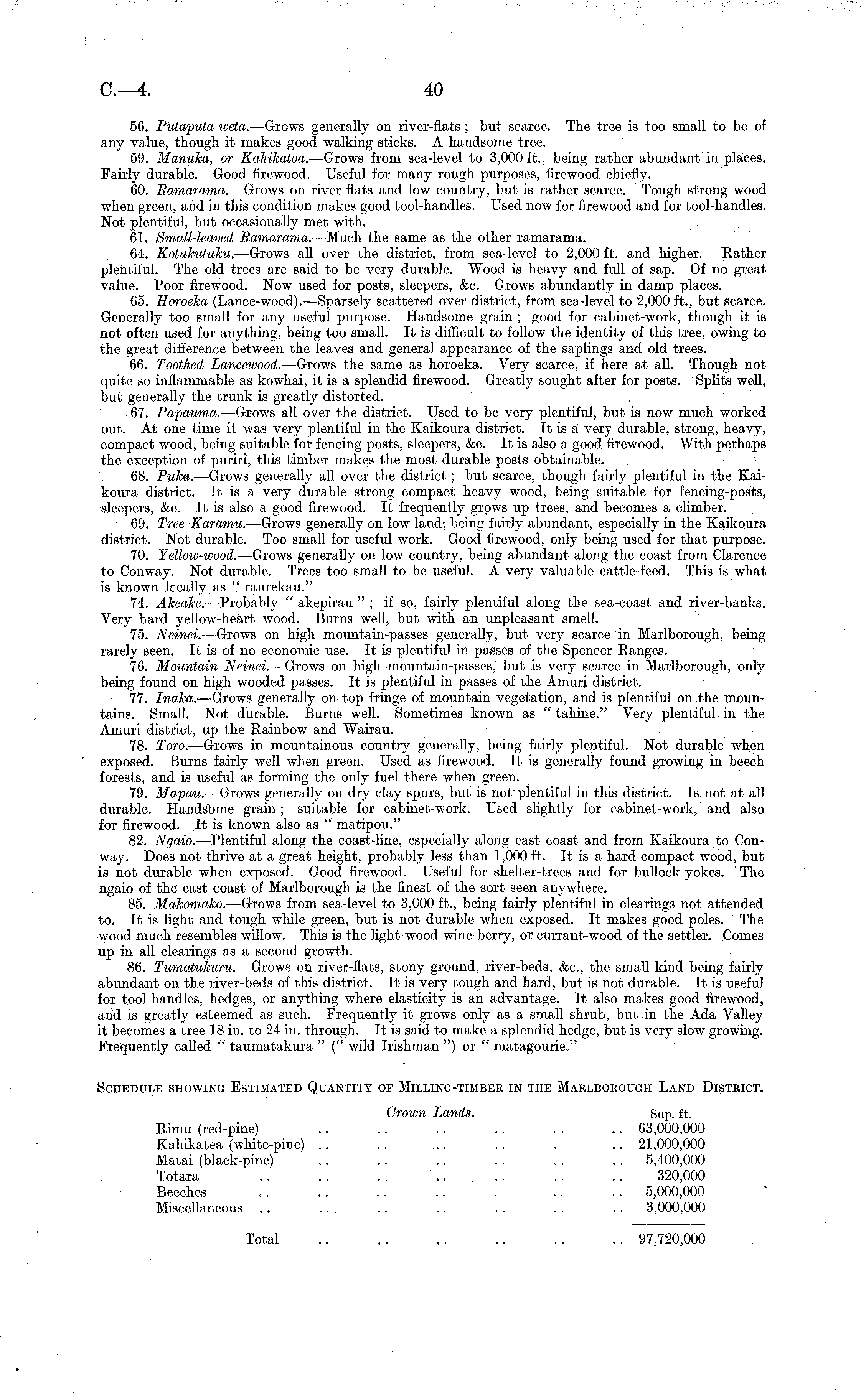 56. Putaputa weta. —Grows generally on river-flats ; but scarce. The tree is too small to be of any value, though it makes good walking-sticks. A handsome tree. 59. Manuka, or Kahikatoa. —Grows from sea-level to 3,000 ft., being rather abundant in places. Fairly durable. Good firewood. Useful for many rough purposes, firewood chiefly. 60. Ramarama. —Grows on river-flats and low country, but is rather scarce. Tough strong wood when green, arid in this condition makes good tool-handles. Used now for firewood and for tool-handles. Not plentiful, but occasionally met with. 61. Small-leaved Ramarama. —Much the same as the other ramarama. 64. Kotukutuku.- —Grows all over the district, from sea-level to 2,000 ft. and higher. Rather plentiful. The old trees are said to be very durable. Wood is heavy and full of sap. Of no great value. Poor firewood. Now used for posts, sleepers, &c. Grows abundantly in damp places. 65. Horoeka (Lance-wood). —Sparsely scattered over district, from sea-level to 2,000 ft., but scarce. Generally too small for any useful purpose. Handsome grain ; good for cabinet-work, though it is not often used for anything, being too small. It is difficult to follow the identity of this tree, owing to the great difference between the leaves and general appearance of the saplings and old trees. 66. Toothed Lancewood. —Grows the same as horoeka. Very scarce, if here at all. Though not quite so inflammable as kowhai, it is a splendid firewood. Greatly sought after for posts. Splits well, but generally the trunk is greatly distorted. 67. Papauma. —Grows all over the district. Used to be very plentiful, but is now much worked out. At one time it was very plentiful in the Kaikoura district. It is a very durable, strong, heavy, compact wood, being suitable for fencing-posts, sleepers, &c. It is also a good firewood. With perhaps the exception of puriri, this timber makes the most durable posts obtainable. 68. Puka. —Grows generally all over the district; but scarce, though fairly plentiful in the Kaikoura district. It is a very durable strong compact heavy wood, being suitable for fencing-posts, sleepers, &c. It is also a good firewood. It frequently grows up trees, and becomes a climber. 69. Tree Karamu. —Grows generally on low land; being fairly abundant, especially in the Kaikoura district. Not durable. Too small for useful work. Good firewood, only being used for that purpose. 70. Yellow-wood. —Grows generally on low country, being abundant along the coast from Clarence to Conway. Not durable. Trees too small to be useful. A very valuable cattle-feed. This is what is known lccally as " raurekau." 74. Akeake. —Probably " akepirau " ; if so, fairly plentiful along the sea-coast and river-banks. Very hard yellow-heart wood. Burns well, but with an unpleasant smell. 75. Neinei. —Grows on high mountain-passes generally, but very scarce in Marlborough, being rarely seen. It is of no economic use. It is plentiful in passes of the Spencer Ranges. 76. Mountain Neinei. —Grows on high mountain-passes, but is very scarce in Marlborough, only being found on high wooded passes. It is plentiful in passes of the Amuri district. 77. Inaka. —Grows generally on top fringe of mountain vegetation, and is plentiful on the mountains. Small. Not durable. Burns well. Sometimes known as " tahine." Very plentiful in the Amuri district, up the Rainbow and Wairau. 78. Toro. —Grows in mountainous country generally, being fairly plentiful. Not durable when exposed. Burns fairly well when green. Used as firewood. It is generally found growing in beech forests, and is useful as forming the only fuel there when green. 79. Mapau. —Grows generally on dry clay spurs, but is not/plentiful in this district. Is not at all durable. Handsome grain ; suitable for cabinet-work. Used slightly for cabinet-work, and also for firewood. It is known also as " matipou." 82. Ngaio. —Plentiful along the coast-line, especially along east coast and from Kaikoura to Conway. Does not thrive at a great height, probably less than 1,000 ft. It is a hard compact wood, but is not durable when exposed. Good firewood. Useful for shelter-trees and for bullock-yokes. The ngaio of the east coast of Marlborough is the finest of the sort seen anywhere. 85. Makomako. —Grows from sea-level to 3,000 ft., being fairly plentiful in clearings not attended to. It is light and tough while green, but is not durable when exposed. It makes good poles. The wood much resembles willow. This is the light-wood wine-berry, or currant-wood of the settler. Comes up in all clearings as a second growth. 86. Tumatukuru. —Grows on river-flats, stony ground, river-beds, &c, the small kind being fairly abundant on the river-beds of this district. It is very tough and hard, but is not durable. It is useful for tool-handles, hedges, or anything where elasticity is an advantage. It also makes good firewood, and is greatly esteemed as such. Frequently it grows only as a small shrub, but in the Ada Valley it becomes a tree 18 in. to 24 in. through. It is said to make a splendid hedge, but is very slow growing. Frequently called " taumatakura " (" wild Irishman ") or " matagourie." Schedule showing Estimated Quantity op Milling-timber in the Marlborough Land District. Crown Lands. Sup. ft. Rimu (red-pine) .. .. .. .. .. .. 63,000,000 Kahikatea (white-pine) .. .. .. .. .. . . 21,000,000 Matai (black-pine) .. .. .. .. .. .. 5,400,000 Totara .. .. .. .. .. .. .. 320,000 Beeches .. .. .. .. . . . . .. 5,000,000 Miscellaneous .. .. . . .. .. 3,000,000 Total .. .. ~ .. .. .. 97,720,000