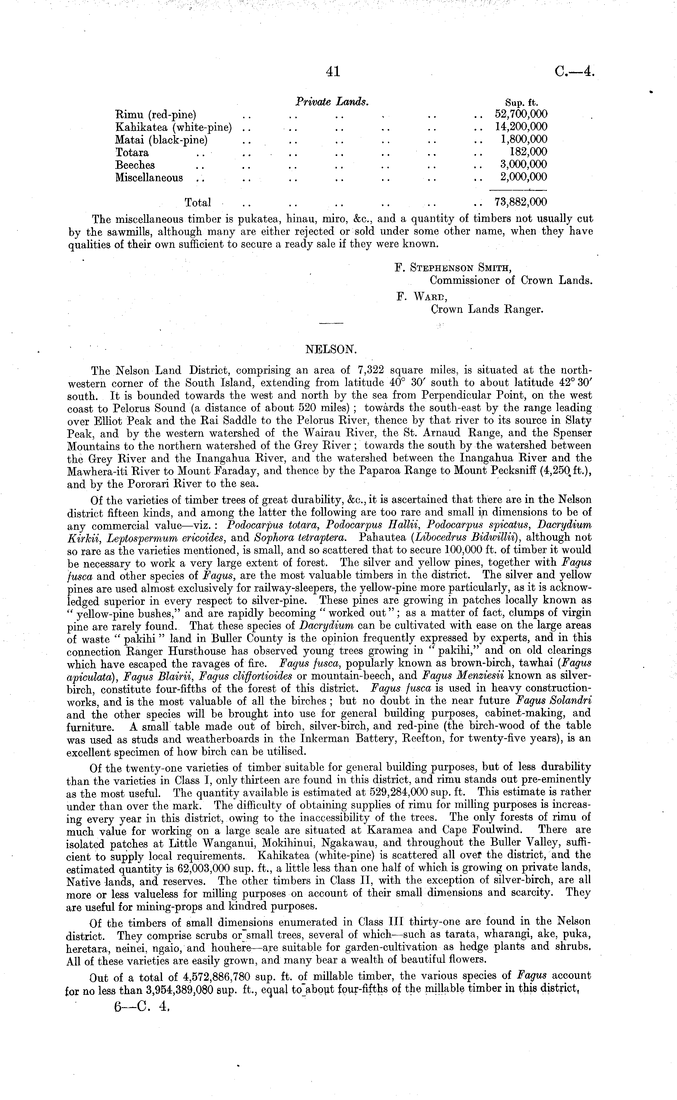 Private Lands. Sup. ft. Rimu (red-pine) .. .. .. . .. .. 52,700,000 Kahikatea (white-pine) .. .. .. .. 14,200,000 Matai (black-pine) .. .. .. .. .. .. 1,800,000 Totara .. .. .. .. .. .. .. 182,000 Beeches .. .. .. .. .. .. .. 3,000,000 Miscellaneous .. .. .. .. .. .. .. 2,000,000 Total .. .. .. .. .. .. 73,882,000 The miscellaneous timber is pukatea, hinau, miro, &c, and a quantity of timbers not usually cut by the sawmills, although many are either rejected or sold under some other name, when they have qualities of their own sufficient to secure a ready sale if they were known. F. Stephenson Smith, Commissioner of Crown Lands. F. Ward, Crown Lands Ranger.