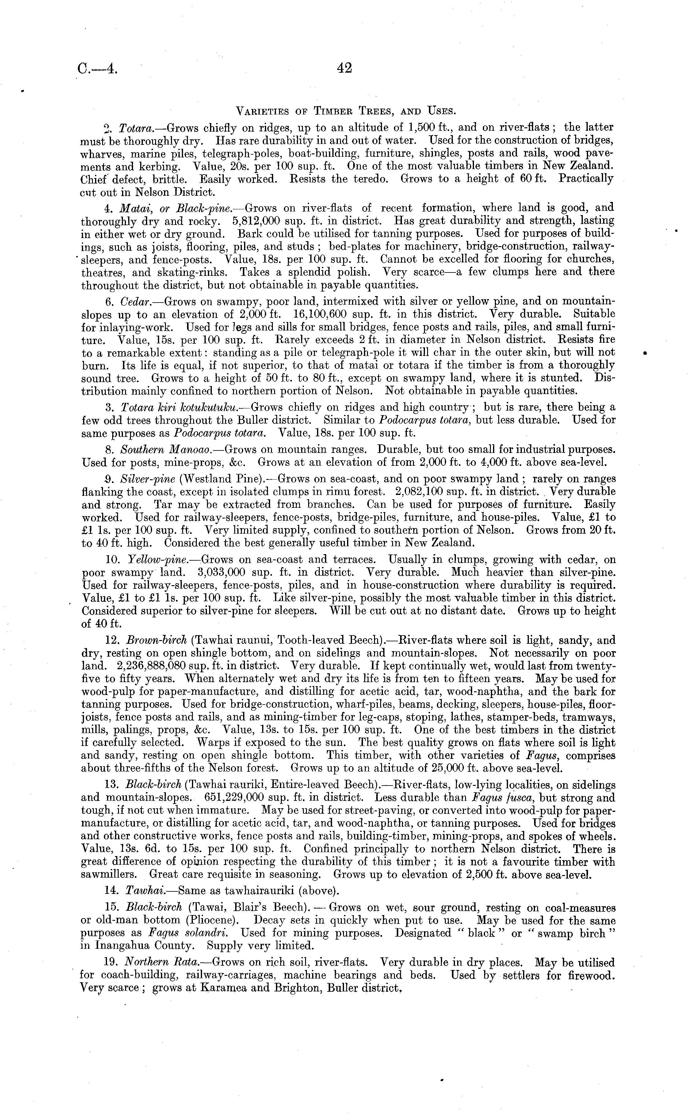 Varieties op Timber Trees, and Uses. 2. Totara. —Grows chiefly on ridges, up to an altitude of 1,500 ft., and on river-flats ; the latter must be thoroughly dry. Has rare durability in and out of water. Used for the construction of bridges, wharves, marine piles, telegraph-poles, boat-building, furniture, shingles, posts and rails, wood pavements and kerbing. Value, 20s. per 100 sup. ft. One of the most valuable timbers in New Zealand. Chief defect, brittle. Easily worked. Resists the teredo. Grows to a height of 60 ft. Practically cut out in Nelson District. 4. Matai, or Black-pine. —Grows on river-flats of recent formation, where land is good, and thoroughly dry and rocky. 5,812,000 sup. ft. in district. Has great durability and strength, lasting in either wet or dry ground. Bark could be utilised for tanning purposes. Used for purposes of buildings, such as joists, flooring, piles, and studs ; bed-plates for machinery, bridge-construction, railwaysleepers, and fence-posts. Value, 18s. per 100 sup. ft. Cannot be excelled for flooring for churches, theatres, and skating-rinks. Takes a splendid polish. Very scarce —a few clumps here and there throughout the district, but not obtainable in payable quantities. 6. Cedar. —Grows on swampy, poor land, intermixed with silver or yellow pine, and on mountainslopes up to an elevation of 2,000 ft. 16,100,600 sup. ft. in this district. Very durable. Suitable for inlaying-work. Used for legs and sills for small bridges, fence posts and rails, piles, and small furniture. Value, 15s. per 100 sup. ft. Rarely exceeds 2 ft. in diameter in Nelson district. Resists fire to a remarkable extent: standing as a pile or telegraph-pole it will char in the outer skin, but will not burn. Its life is equal, if not superior, to that of matai or totara if the timber is from a thoroughly sound tree. Grows to a height of 50 ft. to 80 ft., except on swampy land, where it is stunted. Distribution mainly confined to northern portion of Nelson. Not obtainable in payable quantities. 3. Totara kiri kotukutuku. —Grows chiefly on ridges and high country ; but is rare, there being a few odd trees throughout the Buller district. Similar to Podocarpus totara, but less durable. Used for same purposes as Podocarpus totara. Value, 18s. per 100 sup. ft. 8. Southern Manoao. —Grows on mountain ranges. Durable, but too small for industrial purposes. Used for posts, mine-props, &c. Grows at an elevation of from 2,000 ft. to 4,000 ft. above sea-level. 9. Silver-pine (Westland Pine). —Grows on sea-coast, and on poor swampy land ; rarely on ranges flanking the coast, except in isolated clumps in rimu forest. 2,082,100 sup. ft. in district. . Very durable and strong. Tar may be extracted from branches. Can be used for purposes of furniture. Easily worked. Used for railway-sleepers, fence-posts, bridge-piles, furniture, and house-piles. Value, £1 to £1 Is. per 100 sup. ft. Very limited supply, confined to southern portion of Nelson. Grows from 20 ft. to 40 ft. high. Considered the best generally useful timber in New Zealand. 10. Yellow-pine. —Grows on sea-coast and terraces. Usually in clumps, growing with cedar, on poor swampy land. 3,033,000 sup. ft. in district. Very durable. Much heavier than silver-pine. Used for railway-sleepers, fence-posts, piles, and in house-construction where durability is required. Value, £1 to £1 Is. per 100 sup. ft. Like silver-pine, possibly the most valuable timber in this district. Considered superior to silver-pine for sleepers. Will be cut out at no distant date. Grows up to height of 40 ft. 12. Brown-birch (Tawhai raunui, Tooth-leaved Beech). —River-flats where soil is light, sandy, and dry, resting on open shingle bottom, and on sidelings and mountain-slopes. Not necessarily on poor land. 2,236,888,080 sup. ft. in district. Very durable. If kept continually wet, would last from twentyfive to fifty years. When alternately wet and dry its life is from ten to fifteen years. May be used for wood-pulp for paper-manufacture, and distilling for acetic acid, tar, wood-naphtha, and the bark for tanning purposes. Used for bridge-construction, wharf-piles, beams, decking, sleepers, house-piles, floorjoists, fence posts and rails, and as mining-timber for leg-caps, stoping, lathes, stamper-beds, tramways, mills, palings, props, &c. Value, 13s. to 15s. per 100 sup. ft. One of the best timbers in the district if carefully selected. Warps if exposed to the sun. The best quality grows on flats where soil is light and sandy, resting on open shingle bottom. This timber, with other varieties of Fagus, comprises about three-fifths of the Nelson forest. Grows up to an altitude of 25,000 ft. above sea-level. 13. Black-birch (Tawhai rauriki, Entire-leaved Beech). —River-flats, low-lying localities, on sidelings and mountain-slopes. 651,229,000 sup. ft. in district. Less durable than Fagus fusca, but strong and tough, if not cut when immature. May be used for street-paving, or converted into wood-pulp for papermanufacture, or distilling for acetic acid, tar, and wood-naphtha, or tanning purposes. Used for bridges and other constructive works, fence posts and rails, building-timber, mining-props, and spokes of wheels. Value, 13s. 6d. to 15s. per 100 sup. ft. Confined principally to northern Nelson district. There is great difference of opinion respecting the durability of this timber ; it is not a favourite timber with sawmillers. Great care requisite in seasoning. Grows up to elevation of 2,500 ft. above sea-level. 14. Tawhai. —Same as tawhairauriki (above). 15. Black-birch (Tawai, Blair's Beech). — Grows on wet, sour ground, resting on coal-measures or old-man bottom (Pliocene). Decay sets in quickly when put to use. May be used for the same purposes as Fagus solandri. Used for mining purposes. Designated " black " or " swamp birch " in Inangahua County. Supply very limited. 19. Northern Rata. —Grows on ri.ch soil, river-flats. Very durable in dry 