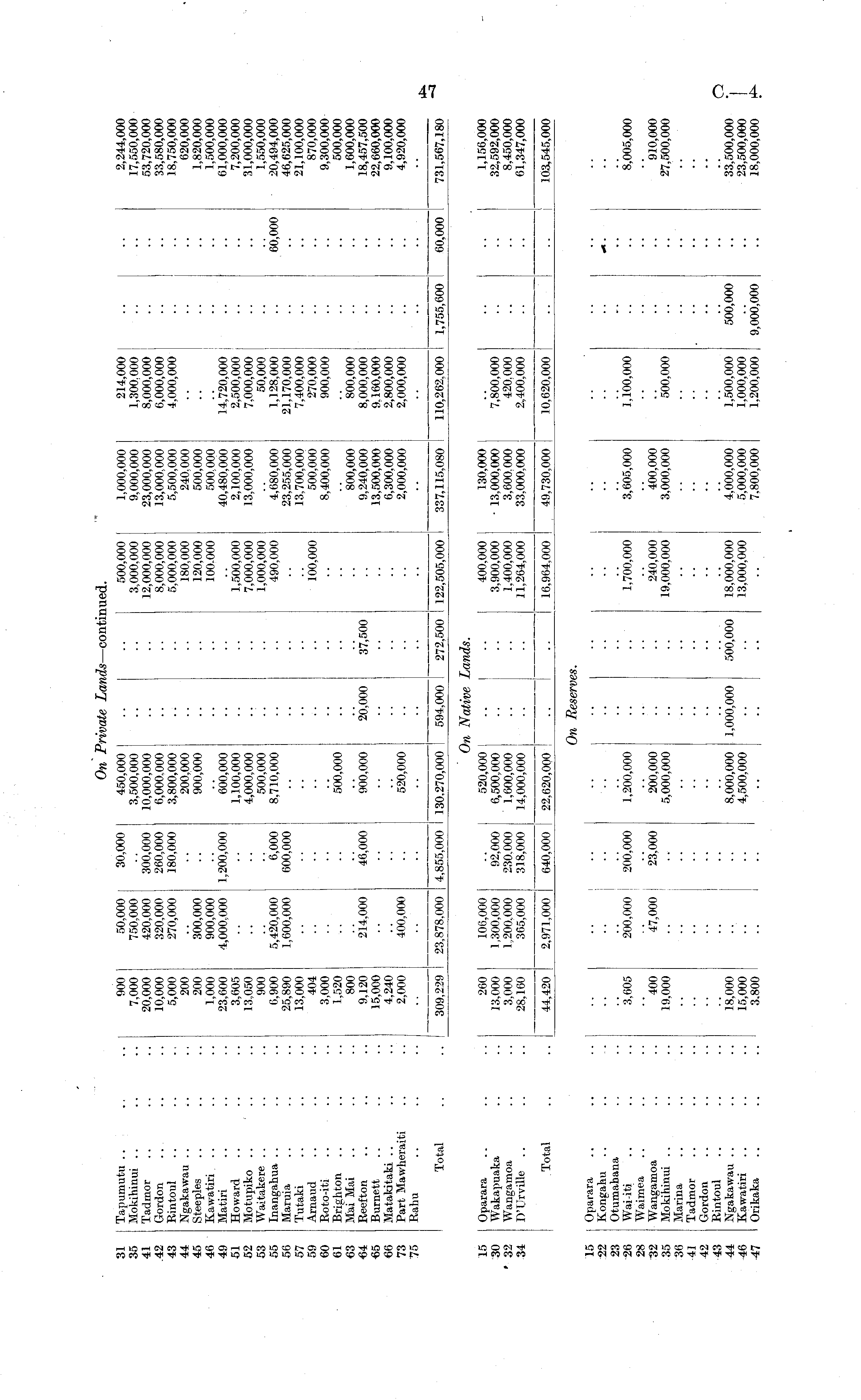 On P 'rivate Lan ,ds —contii ued. 31 Tapumutu .. 35 Mokihinui .. 41 Tadmor .42 Gordon 43 Rintoul 44 Ngakawau .. 45 Steeples 46 Kawatiri 49 Matiri 51 Howard 52 Motupiko .. 53 Waitakere .. 55 Inangahua .. 56 Maruia 57 Tutaki 59 Arnaud 60 Roto-iti 61 Brighton .. 63 Mai Mai •64 Reefton 65 Burnett 66 Matakitaki .. 73 Part Mawheraiti 75 Rahu / '' 900 7,000 20.000 10,000 5,000 200 200 1,000 23,600 3,605 13,050 900 6,900 25,890 13,000 404 3,000 1,520 800 9,120 15,000 4.240 2,000 900 7,000 20.000 10,000 5,000 200 200 1,000 23,600 3,605 13,050 900 6,900 25,890 13,000 404 3,000 1,520 800 9,120 15,000 4,240 2,000 50,000 750,000 | 420,000 320,000 ! 270,000 300,000 900,000 4,000,000 5,420,000 1,600,000 30,000 j 300,000 260,000 180,000 1,200,000 6,000 600,000 450,000 3,500,000 10,000,000 6,000.000 3,800,000 200,000 900,000 600,000 1,100,000 4,000,000 500,000 8,710,000 ! •• I 500,000 3,000,000 12,000,000 8,000,000 5,000,000 180,000 120,000 100.000 1,500,000 7,000,000 1,000,000 490,000 1,000,000 9,000,000 23,000,000 13,000,000 5,500,000 240.000 500,000 500.000 40,480,000 2,100,000 13.000,000 4,680,000 23,255,000 13,700,000 500,000 8,400,000 214,000 1,300.000 8,000,000 6,000,000 4,000,000 14,720,000 2,500,000 7,000,000 50,000 1,128,000 21,170,000 7,400,000 270,000 900,000 60,000 2,244,000 17,550,000 53,720,000 33,580,000 18,750,000 620,000 1,820,000 1,500,000 61,000,000 7,200,000 31,000,000 1,550,000 20,494,000 46,625,000 21,100,000 870,000 9,300,000 500,000 1,600,000 18,457,500 22,660,000 9,100,000 4,920,000 i - •' 100,000 500,000 214,000 46,000 900,000 20,000 37,500 800,000 9,240,000 13,500,000 6,300,000 2,000,000 800,000 8,000,000 9.160,000 2,800,000 2,000,000 400,000 520,000 ■ •• Total 309,229 309,229 23,878,000 4,855,000 130,270,000 594,000 272,500 122,505,000 337,115,080 110,262,000 1,755,600 60,000 731,567,180 15 Oparara 30 Wakapuaka 32 Wangamoa 34 D'Urville .. Total 260 13,000 3,000 28,160 44,420 On Native Lands. 106,000 1,300,000 1,200.000 365,000 92,000 230.000 318,000 520,000 .. | 6,500,000 1,600,000 14,000,000 400.000 3,900,000 1,400,000 11,264,000 130,000 • 13,000,000 3,600.000 33,000,000 49,730,000 1,156,000 7,800,000 .. .. 32,592,000 420.000 .. .. 8,450,000 2,400,000 .. .. 61,347,000 10,620,000 .. .. 103,545,000 44,420 2,971,000 640,000 22,620,000 16,964,000 49,730,000 15 Oparara 22 Kongahu 23 Otumahana 26 Wai-iti 28 Waimea 32 Wangamoa 35 Mokihinui .. 36 Jlarina 41 Tadmor 42 Gordon 43 Rintoul 44 Ngakawau .. 46 Kawatiri 47 Orikaka 3,605 400 19,000 18,000 15,000 3.800 On Reserves. i ■• ! ■ i . 3,605 200,000 200,000 1,200,000 1,700,000 3,605,000 1,100,000 8,005,000 400 19,000 47,000 23,000 200,000 5,000,000 240,000 19,000,000 400,000 3,000,000 500,000 910,000 27,500,000 18,000 15,000 3.800 8,000,000 4,500,000 1,000,000 500,000 18,000,000 13,000,000 4,000,000 5,000,000 7,800,000 1,500,000 1,000,000 1,200,000 500,000 33,500,000 23,500,000 18,000,000 I 9,000,000