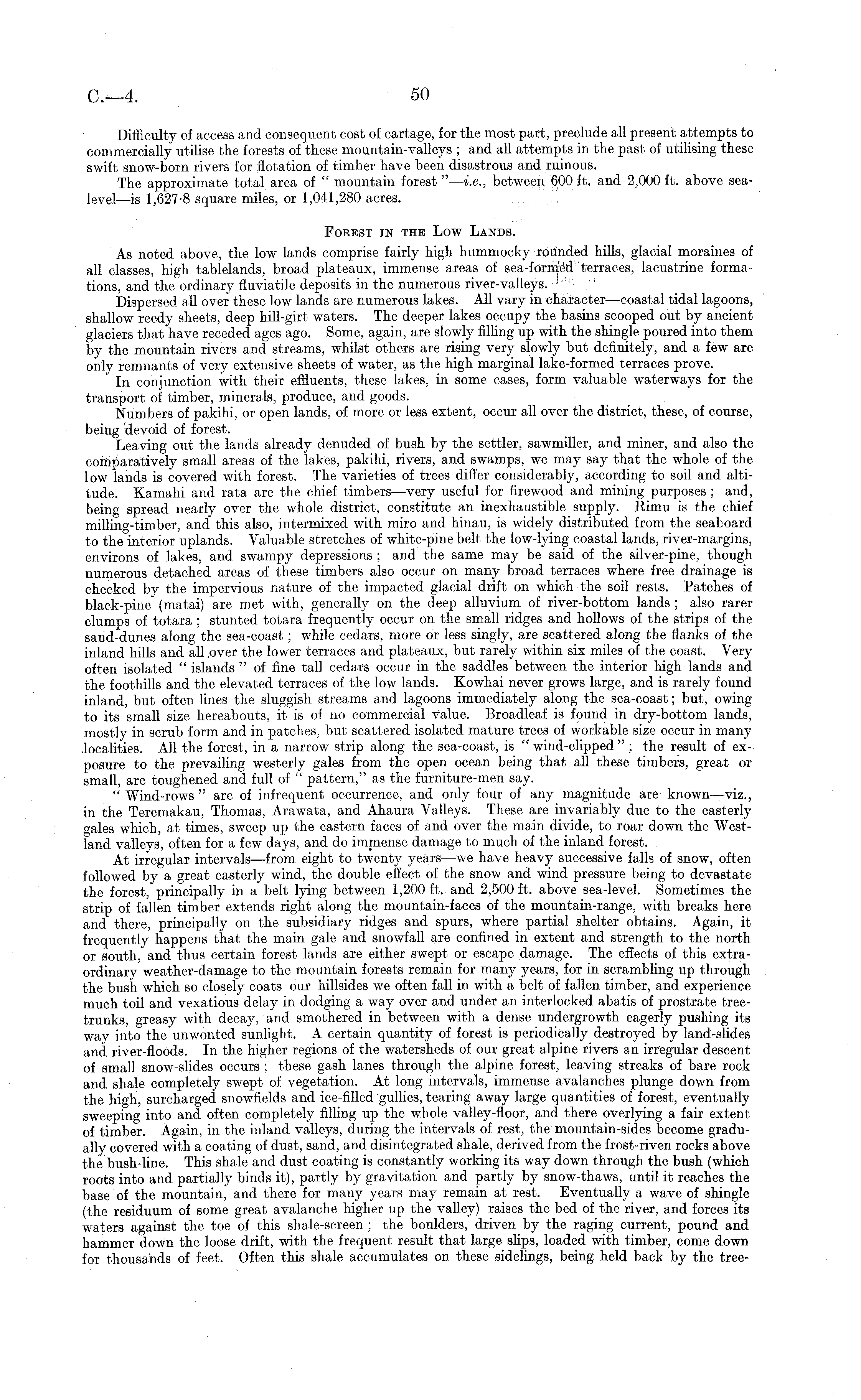 Difficulty of access and consequent cost of cartage, for the most part, preclude all present attempts to commercially utilise the forests of these mountain-valleys ; and all attempts in the past of utilising these swift snow-born rivers for flotation of timber have been disastrous and ruinous. The approximate total area of " mountain forest " — i.e., between 600 ft. and 2,000 ft. above sealevel —is 1,627-8 square miles, or 1,041,280 acres. Forest in the Low Lands. As noted above, the low lands comprise fairly high hummocky rounded hills, glacial moraines of all classes, high tablelands, broad plateaux, immense areas of sea-formed terraces, lacustrine formations, and the ordinary fluviatile deposits in the numerous river-valleys. ! Dispersed all over these low lands are numerous lakes. All vary in character —coastal tidal lagoons, shallow reedy sheets, deep hill-girt waters. The deeper lakes occupy the basins scooped out by ancient glaciers that have receded ages ago. Some, again, are slowly filling up with the shingle poured into them by the mountain rivers and streams, whilst others are rising very slowly but definitely, and a few are only remnants of very extensive sheets of water, as the high marginal lake-formed terraces prove. In conjunction with their effluents, these lakes, in some cases, form valuable waterways for the transport of timber, minerals, produce, and goods. Numbers of pakihi, or open lands, of more or less extent, occur all over the district, these, of course, being devoid of forest. Leaving out the lands already denuded of bush by the settler, sawmiller, and miner, and also the comparatively small areas of the lakes, pakihi, rivers, and swamps, we may say that the whole of the low lands is covered with forest. The varieties of trees differ considerably, according to soil and altitude. Kamahi and rata are the chief timbers —very useful for firewood and mining purposes ; and, being spread nearly over the whole district, constitute an inexhaustible supply. Rimu is the chief milling-timber, and this also, intermixed with miro and hinau, is widely distributed from the seaboard to the interior uplands. Valuable stretches of white-pine belt the low-lying coastal lands, river-margins, environs of lakes, and swampy depressions ; and the same may be said of the silver-pine, though numerous detached areas of these timbers also occur on many broad terraces where free drainage is checked by the impervious nature of the impacted glacial drift on which the soil rests. Patches of black-pine (matai) are met with, generally on the deep alluvium of river-bottom lands ; also rarer clumps of totara ; stunted totara frequently occur on the small ridges and hollows of the strips of the sand-dunes along the sea-coast; while cedars, more or less singly, are scattered along the flanks of the inland hills and all .over the lower terraces and plateaux, but rarely within six miles of the coast. Very often isolated " islands " of fine tall cedars occur in the saddles between the interior high lands and the foothills and the elevated terraces of the low lands. Kowhai never grows large, and is rarely found inland, but often lines the sluggish streams and lagoons immediately along the sea-coast; but, owing to its small size hereabouts, it is of no commercial value. Broadleaf is found in dry-bottom lands, mostly in scrub form and in patches, but scattered isolated mature trees of workable size occur in many .localities. All the forest, in a narrow strip along the sea-coast, is " wind-clipped " ; the result of exposure to the prevailing westerly gales from the open ocean being that all these timbers, great or small, are toughened and full of " pattern," as the furniture-men say. " Wind-rows " are of infrequent occurrence, and only four of any magnitude are known—viz., in the Teremakau, Thomas, Arawata, and Ahaura Valleys. These are invariably due to the easterly gales which, at times, sweep up the eastern faces of and over the main divide, to roar down the Westland valleys, often for a few days, and do immense damage to much of the inland forest. At irregular intervals —from eight to twenty years —we have heavy successive falls of snow, often followed by a great easterly wind, the double effect of the snow and wind pressure being to devastate the forest, principally in a belt lying between 1,200 ft. and 2,500 ft. above sea-level. Sometimes the strip of fallen timber extends right along the mountain-faces of the mountain-range, with breaks here and there, principally on the subsidiary ridges and spurs, where partial shelter obtains. Again, it frequently happens that the main gale and snowfall are confined in extent and strength to the north or south, and thus certain forest lands are either swept or escape damage. The effects of this extraordinary weather-damage to the mountain forests remain for many years, for in scrambling up through the bush which so closely coats our hillsides we often fall in with a belt of fallen timber, and experience much toil and vexatious delay in dodging a way over and under an interlocked abatis of prostrate treetrunks, greasy with decay, and smothered in between with a dense undergrowth eagerly pushing its way into the unwonted sunlight. A certain quantity of forest is periodically destroyed by land-slides and river-floods. In the higher regions of the watersheds of our great alpine rivers an irregular descent of small snow-slides occurs ; these gash lanes through the alpine forest, leaving streaks of bare rock and shale completely swept of vegetation. At long intervals, immense avalanches plunge down from the high, surcharged snowfields and ice-filled gullies, tearing away large quantities of forest, eventually sweeping into and often completely filling up the whole valley-floor, and there overlying a fair extent of timber. Again, in the inland valleys, during the intervals of rest, the mountain-sides become gradually covered with a coating of dust, sand, a