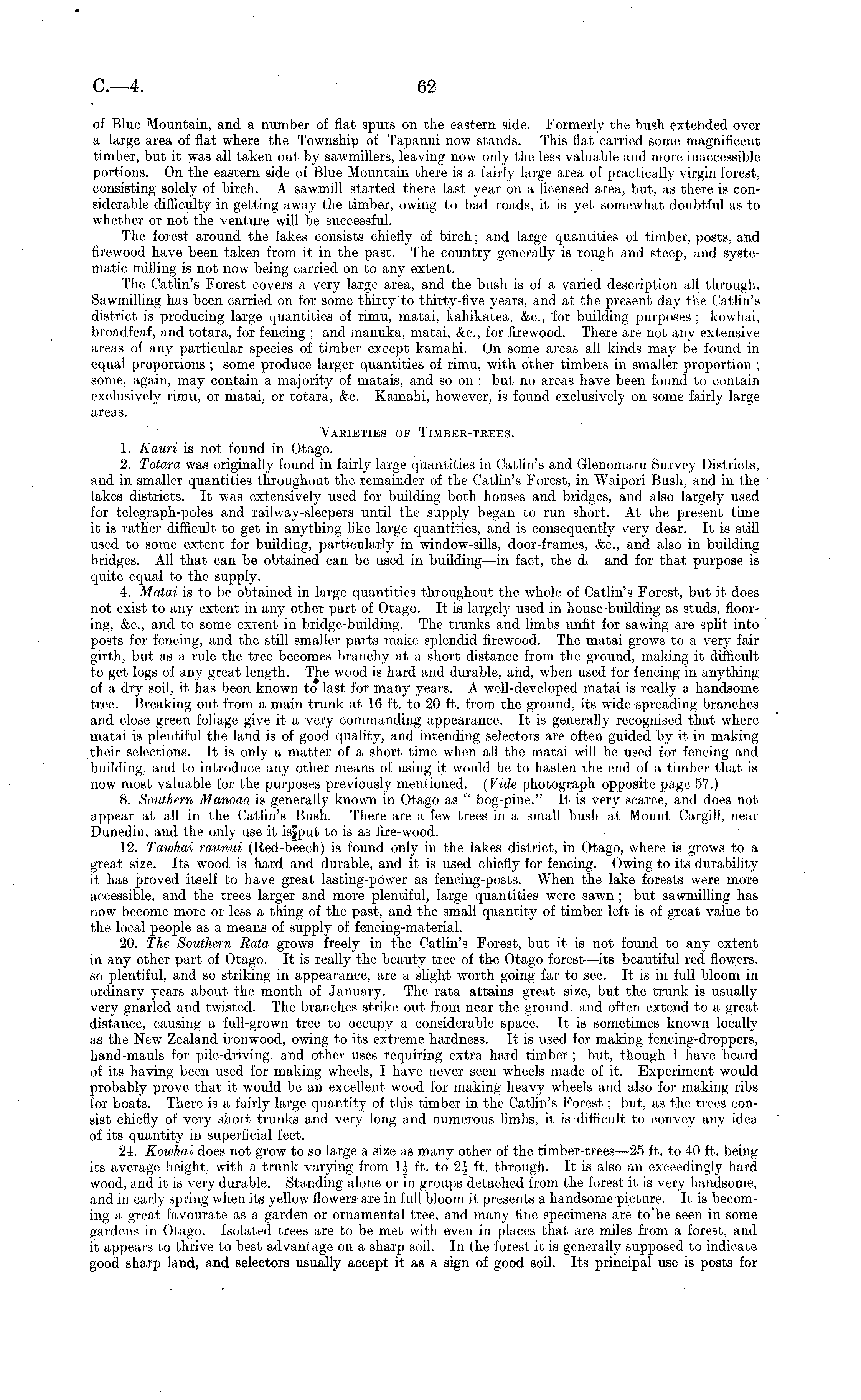 of Blue Mountain, and a number of flat spurs on the eastern side. Formerly the bush extended over a large area of flat where the Township of Tapanui now stands. This flat carried some magnificent timber, but it was all taken out by sawmillers, leaving now only the less valuable and more inaccessible portions. On the eastern side of Blue Mountain there is a fairly large area of practically virgin forest, consisting solely of birch. A sawmill started there last year on a licensed area, but, as there is considerable difficulty in getting away the timber, owing to bad roads, it is yet somewhat doubtful as to whether or not the venture will be successful. The forest around the lakes consists chiefly of birch; and large quantities of timber, posts, and firewood have been taken from it in the past. The country generally is rough and steep, and systematic milling is not now being carried on to any extent. The Catlin's Forest covers a very large area, and the bush is of a varied description all through. Sawmilling has been carried on for some thirty to thirty-five years, and at the present day the Catlin's district is producing large quantities of rimu, matai, kahikatea, &c, for building purposes ; kowhai, broadfeaf, and totara, for fencing ; and manuka, matai, &c, for firewood. There are not any extensive areas of any particular species of timber except kamahi. On some areas all kinds may be found in equal proportions ; some produce larger quantities of rimu, with other timbers in smaller proportion ; some, again, may contain a majority of matais, and so on : but no areas have been found to contain exclusively rimu, or matai, or totara, &c. Kamahi, however, is found exclusively on some fairly large areas. Varieties of Timber-trees. 1. Kauri is not found in Otago. 2. Totara was originally found in fairly large quantities in Catlin's and Glenomaru Survey Districts, and in smaller quantities throughout the remainder of the Catlin's Forest, in Waipori Bush, and in the lakes districts. It was extensively used for building both houses and bridges, and also largely used for telegraph-poles and railway-sleepers until the supply began to run short. At the present time it is rather difficult to get in anything like large quantities, and is consequently very dear. It is still used to some extent for building, particularly in window-sills, door-frames, &c, and also in building bridges. All that can be obtained can be used in building—in fact, the d\ and for that purpose is quite equal to the supply. 4. Matai is to be obtained in large quantities throughout the whole of Catlin's Forest, but it does not exist to any extent in any other part of Otago. It is largely used in house-building as studs, flooring, &c, and to some extent in bridge-building. The trunks and limbs unfit for sawing are split into posts for fencing, and the still smaller parts make splendid firewood. The matai grows to a very fair girth, but as a rule the tree becomes branchy at a short distance from the ground, making it difficult to get logs of any great length. The wood is hard and durable, and, when used for fencing in anything of a dry soil, it has been known to last for many years. A well-developed matai is really a handsome tree. Breaking out from a main trunk at 16 ft. to 20 ft. from the ground, its wide-spreading branches and close green foliage give it a very commanding appearance. It is generally recognised that where matai is plentiful the land is of good quality, and intending selectors are often guided by it in making their selections. It is only a matter of a short time when all the matai will be used for fencing and building, and to introduce any other means of using it would be to hasten the end of a timber that is now most valuable for the purposes previously mentioned. (Vide photograph opposite page 57.) 8. Southern Manoao is generally known in Otago as " bog-pine." It is very scarce, and does not appear at all in the Catlin's Bush. There are a few trees in a small bush at Mount Cargill, near Dunedin, and the only use it is|put to is as fire-wood. 12. Tawhai raunui (Red-beech) is found only in the lakes district, in Otago, where is grows to a great size. Its wood is hard and durable, and it is used chiefly for fencing. Owing to its durability it has proved itself to have great lasting-power as fencing-posts. When the lake forests were more accessible, and the trees larger and more plentiful, large quantities were sawn ; but sawmilling has now become more or less a thing of the past, and the small quantity of timber left is of great value to the local people as a means of supply of fencing-material. 20. The Southern Rata grows freely in the Catlin's Forest, but it is not found to any extent in any other part of Otago. It is really the beauty tree of the Otago forest—its beautiful red flowers, so plentiful, and so striking in appearance, are a slight worth going far to see. It is in full bloom in ordinary years about the month of January. The rata attains great size, but the trunk is usually very gnarled and twisted. The branches strike out from near the ground, and often extend to a great distance, causing a full-grown tree to occupy a considerable space. It is sometimes known locally as the New Zealand ironwood, owing to its extreme hardness. It is used for making fencing-droppers, hand-mauls for pile-driving, and other uses requiring extra hard timber ; but, though I have heard of its having been used for making wheels, I have never seen wheels made of it. Experiment would probably prove that it would be an excellent wood for making heavy wheels and also for making ribs for boats. There is a fairly large quantity of this timber in the Catlin's Forest; but, as the trees consist chiefly of very short trunks and very long and numerous limbs, it is difficult to convey any idea of its quantity in superficial feet. 24. Kowhai does not grow to so large a size as many other of the timber-trees—2s ft. to 40 ft. being its a