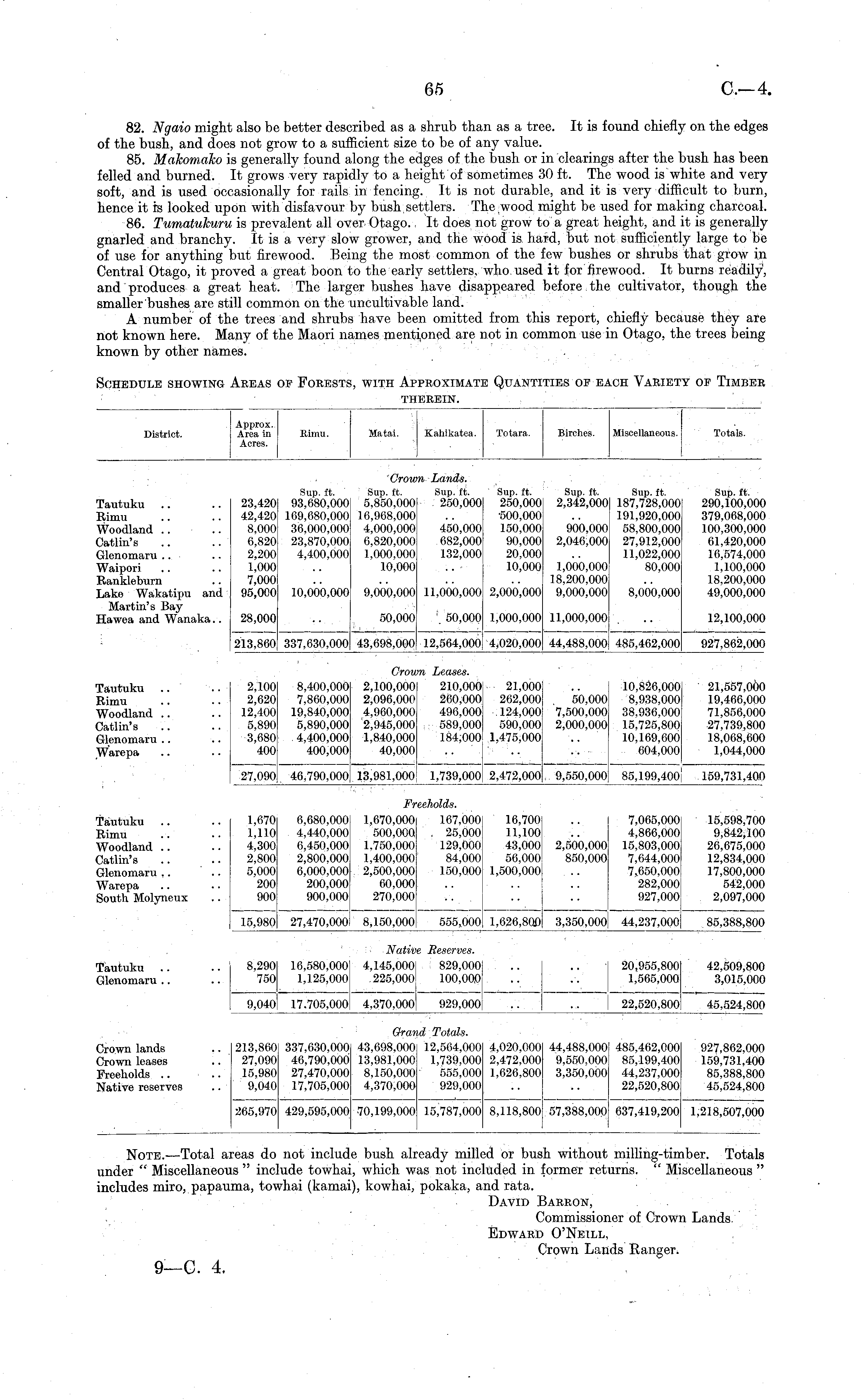 Note. —Total areas do not include bush already milled or bush without milling-timber. Totals under " Miscellaneous " include towhai, which was not included in former returns. " Miscellaneous " includes miro, papauma, towhai (kamai), kowhai, pokaka, and rata. David Barron, ~ Commissioner of Crown Lands. Edward O'Neill, Crown Lands Ranger.
