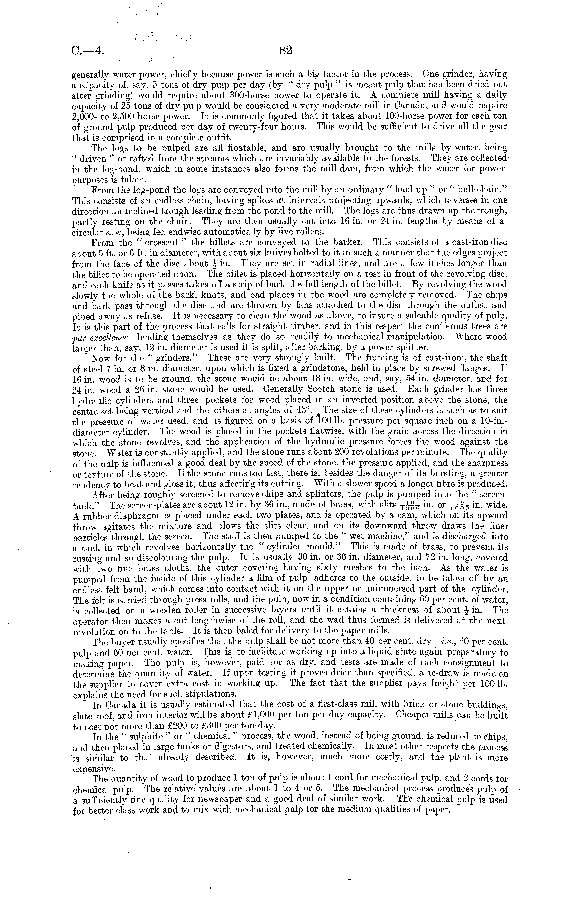 generally water-power, chiefly because power is such a big factor in the process. One grinder, having a capacity of, say, 5 tons of dry pulp per day (by " dry pulp " is meant pulp that has been dried out after grinding) would require about 300-horse power to operate it. A complete mill having a daily capacity of 25 tons of dry pulp would be considered a very moderate mill in Canada, and would require 2,000- to 2,500-horse power. It is commonly figured that it takes about 100-horse power for each ton of ground pulp produced per day of twenty-four hours. This would be sufficient to drive all the gear that is comprised in a complete outfit. The logs to be pulped are all floatable, and are usually brought to the mills by water, being " driven "or rafted from the streams which are invariably available to the forests. They are collected in the log-pond, which in some instances also forms the mill-dam, from which the water for power purposes is taken. From the log-pond the logs are conveyed into the mill by an ordinary " haul-up " or " bull-chain." This consists of an endless chain, having spikes set intervals projecting upwards, which taverses in one direction an inclined trough leading from the pond to the mill. The logs are thus drawn up the trough, partly resting on the chain. They are then usually cut into 16 in. or 24 in. lengths by means of a circular saw, being fed endwise automatically by live rollers. From the "crosscut" the billets are conveyed to the barker. This consists of a cast-iron disc about 5 ft. or 6 ft. in diameter, with about six knives bolted to it in such a manner that the edges project from the face of the disc about |- in. They are set in radial lines, and are a few inches longer than the billet to be operated upon. The billet is placed horizontally on a rest in front of the revolving disc, and each knife as it passes takes off a strip of bark the full length of the billet. By revolving the wood slowly the whole of the bark, knots, and bad places in the wood are completely removed. The chips and bark pass through the disc and are thrown by fans attached to the disc through the outlet, and piped away as refuse. It is necessary to clean the wood as above, to insure a saleable quality of pulp. It is this part of the process that calls for straight timber, and in this respect the coniferous trees are par excellence —lending themselves as they do so readily to mechanical manipulation. Where wood larger than, say, 12 in. diameter is used it is split, after barking, by a power splitter. Now for the " grinders." These are very strongly built. The framing is of cast-ironi, the shaft of steel 7 in. or 8 in. diameter, upon which is fixed a grindstone, held in place by screwed flanges. If 16 in. wood is to be ground, the stone would be about 18 in. wide, and, say, 54 in. diameter, and for 24 in. wood a26 in. stone would be used. Generally Scotch stone is used. Each grinder has three hydraulic cylinders and three pockets for wood placed in an inverted position above the stone, the centre set being vertical and the others at angles of 45°. The size of these cylinders is such as to suit the pressure of water used, and is figured on a basis of 100 lb. pressure per square inch on a 10-in.--diameter cylinder. The wood is placed in the pockets flatwise, with the grain across the direction in which the stone revolves, and the application of the hydraulic pressure forces the wood against the stone. Water is constantly applied, and the stone runs about 200 revolutions per minute. The quality of the pulp is influenced a good deal by the speed of the stone, the pressure applied, and the sharpness or texture of the stone. If the stone runs too fast, there is, besides the danger of its bursting, a greater tendency to heat and gloss it, thus affecting its cutting. With, a slower speed a longer fibre is produced. After being roughly screened to remove chips and splinters, the pulp is pumped into the " screentank." The screen-plates are about 12 in. by 36 in., made of brass, with slits T ±i? w in. or T^v in. wide. A rubber diaphragm is placed under each two plates, and is operated by a cam, which on its upward throw agitates the mixture and blows the slits clear, and on its downward throw draws the finer particles through the screen. The stuff is then pumped to the " wet machine," and is discharged into a tank in which revolves horizontally the " cylinder mould." This is made of brass, to prevent its rusting and so discolouring the pulp. It is usually 30 in. or 36 in. diameter, and 72 in. long, covered with two fine brass cloths, the outer covering having sixty meshes to the inch. As the water is pumped from the inside of this cylinder a film of pulp adheres to the outside, to be taken off by an endless felt band, which comes into contact with it on the upper or unimmersed part of the cylinder. The felt is carried through press-rolls, and the pulp, now in a condition containing 60 per cent, of water, is collected on a wooden roller in successive layers until it attains a thickness of about \ in. The operator then makes a cut lengthwise of the roll, and the wad thus formed is delivered at the next revolution on to the table. It is then baled for delivery to the paper-mills. The buyer usually specifies that the pulp shall be not more than 40 per cent, dry — i.e., 40 per cent, pulp and 60 per cent, water. This is to facilitate working up into a liquid state again preparatory to making paper. The pulp is, however, paid for as dry, and tests are made of each consignment to determine the quantity of water. If upon testing it proves drier than specified, a re-draw is made on the supplier to cover extra cost in working up. The fact that the supplier pays freight per 100 lb. explains the need for such stipulations. In Canada it is usually estimated that the cost of a first-class mill with brick or stone buildings, slate roof, and iron interior will be about £1,000 per ton per day capacity. Cheaper m