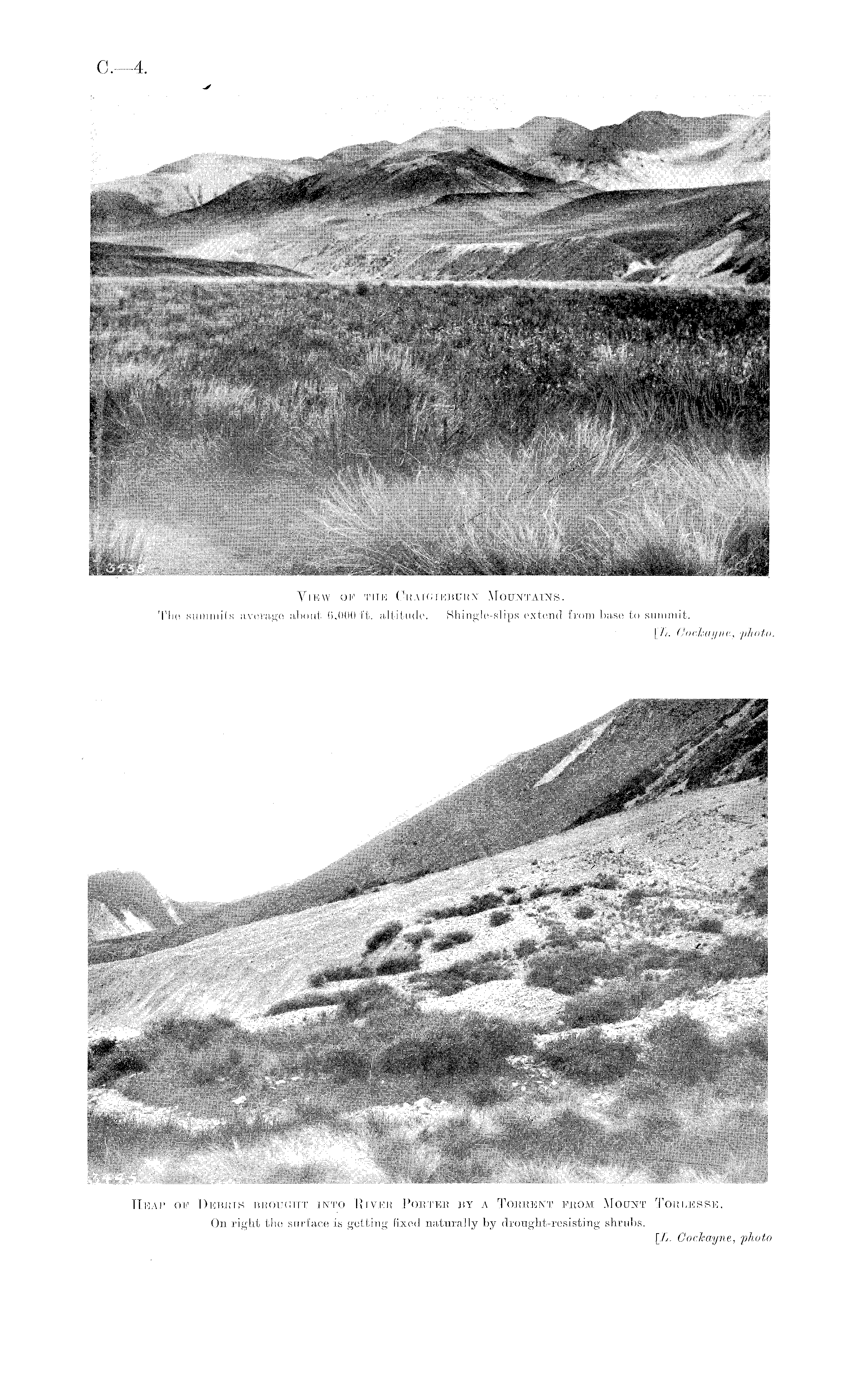 The summits average about 6,000 ft. altitude. Shingle-slips extend from base to summit. [Z-. Cockayne, photo.