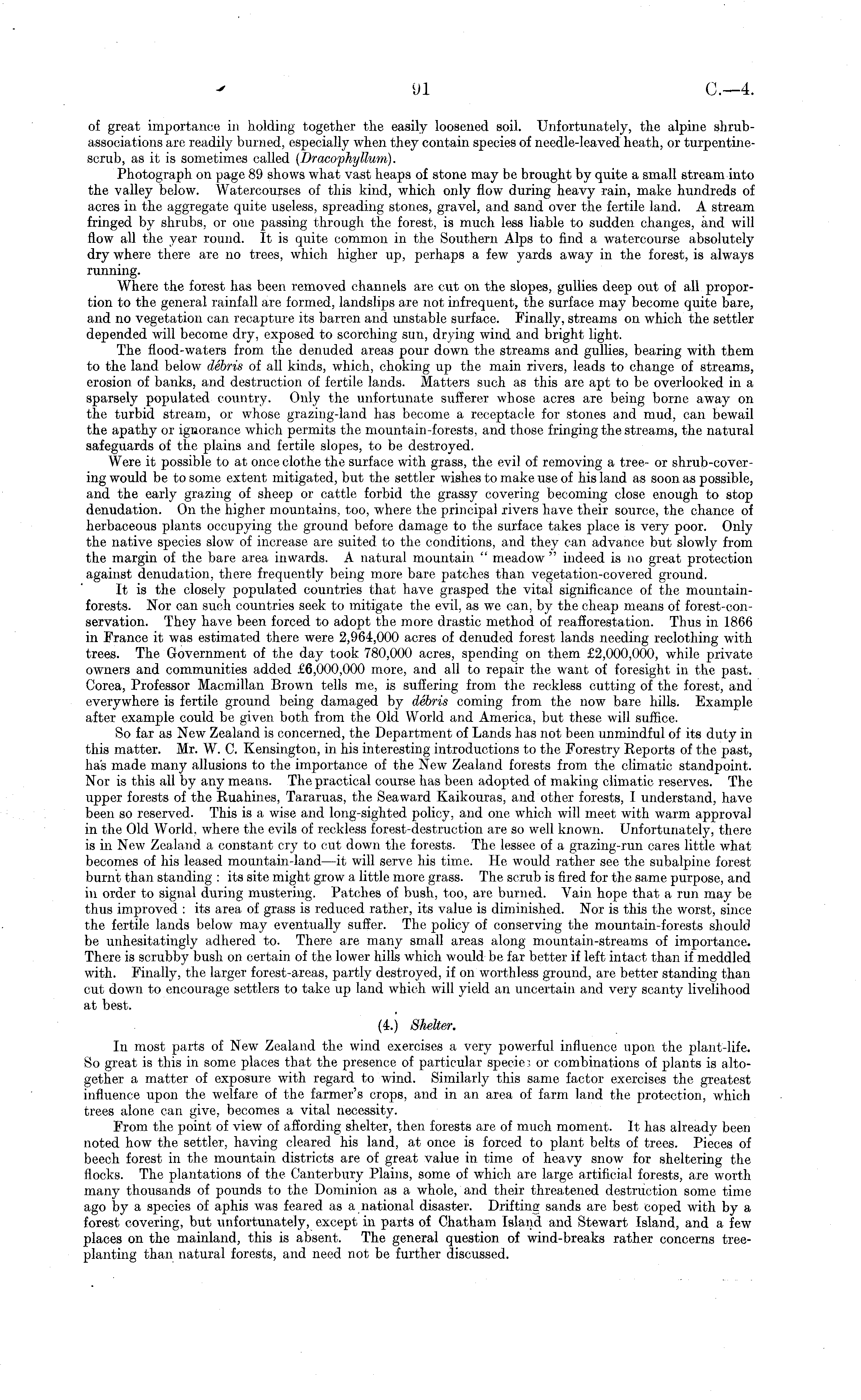 of great importance in holding together the easily loosened soil. Unfortunately, the alpine shrubassociations are readily burned, especially when they contain species of needle-leaved heath, or turpentinescrub, as it is sometimes called (Dracophyllum). Photograph on page 89 shows what vast heaps of stone may be brought by quite a small stream into the valley below. Watercourses of this kind, which only flow during heavy rain, make hundreds of acres in the aggregate quite useless, spreading stones, gravel, and sand over the fertile land. A stream fringed by shrubs, or one passing through the forest, is much less liable to sudden changes, and will flow all the year round. It is quite common in the Southern Alps to find a watercourse absolutely dry where there are no trees, which higher up, perhaps a few yards away in the forest, is always running. Where the forest has been removed channels are cut on the slopes, gullies deep out of all proportion to the general rainfall are formed, landslips are not infrequent, the surface may become quite bare, and no vegetation can recapture its barren and unstable surface. Finally, streams on which the settler depended will become dry, exposed to scorching sun, drying wind and bright light. The flood-waters from the denuded areas pour down the streams and gullies, bearing with them to the land below debris of all kinds, which, choking up the main rivers, leads to change of streams, erosion of banks, and destruction of fertile lands. Matters such as this are apt to be overlooked in a sparsely populated country. Only the unfortunate sufferer whose acres are being borne away on the turbid stream, or whose grazing-land has become a receptacle for stones and mud, can bewail the apathy or ignorance which permits the mountain-forests, and those fringing the streams, the natural safeguards of the plains and fertile slopes, to be destroyed. Were it possible to at once clothe the surface with grass, the evil of removing a tree- or shrub-cover-ing would be to some extent mitigated, but the settler wishes to make use of his land as soon as possible, and the early grazing of sheep or cattle forbid the grassy covering becoming close enough to stop denudation. On the higher mountains, too, where the principal rivers have their source, the chance of herbaceous plants occupying the ground before damage to the surface takes place is very poor. Only the native species slow of increase are suited to the conditions, and they can advance but slowly from the margin of the bare area inwards. A natural mountain " meadow " indeed is no great protection against denudation, there frequently being more bare patches than vegetation-covered ground. It is the closely populated countries that have grasped the vital significance of the mountainforests. Nor can such countries seek to mitigate the evil, as we can, by the cheap means of forest-con-servation. They have been forced to adopt the more drastic method of reafforestation. Thus in 1866 in France it was estimated there were 2,964,000 acres of denuded forest lands needing reclothing with trees. The Government of the day took 780,000 acres, spending on them £2,000,000, while private owners and communities added £6,000,000 more, and all to repair the want of foresight in the past. Corea, Professor Macmillan Brown tells me, is suffering- from the reckless cutting of the forest, and everywhere is fertile ground being damaged by debris coming from the now bare hills. Example after example could be given both from the Old World and America, but these will suffice. So far as New Zealand is concerned, the Department of Lands has not been unmindful of its duty in this matter. Mr. W. C. Kensington, in his interesting introductions to the Forestry Reports of the past, has made many allusions to the importance of the New Zealand forests from the climatic standpoint. Nor is this all by any means. The practical course has been adopted of making climatic reserves. The upper forests of the Ruahines, Tararuas, the Seaward Kaikouras, and other forests, I understand, have been so reserved. This is a wise and long-sighted policy, and one which will meet with warm approval in the Old World, where the evils of reckless forest-destruction are so well known. Unfortunately, there is in New Zealand a constant cry to cut down the forests. The lessee of a grazing-run cares little what becomes of his leased mountain-land—it will serve his time. He would rather see the subalpine forest burnt than standing : its site might grow a little more grass. The scrub is fired for the same purpose, and in order to signal during mustering. Patches of bush, too, are burned. Vain hope that a run may be thus improved : its area of grass is reduced rather, its value is diminished. Nor is this the worst, since the fertile lands below may eventually suffer. The policy of conserving the mountain-forests should be unhesitatingly adhered to. There are many small areas along mountain-streams of importance. There is scrubby bush on certain of the lower hills which would be far better if left intact than if meddled with. Finally, the larger forest-areas, partly destroyed, if on worthless ground, are better standing than cut down to encourage settlers to take up land which will yield an uncertain and very scanty livelihood at best. (4.) Shelter. In most parts of New Zealand the wind exercises a very powerful influence upon the plant-life. So great is this in some places that the presence of particular specie? or combinations of plants is altogether a matter of exposure with regard to wind. Similarly this same factor exercises the greatest influence upon the welfare of the farmer's crops, and in an area of farm land the protection, which trees alone can give, becomes a vital necessity. From the point of view of affording shelter, then forests are of much moment. It has already been noted how the settler, having cleared his land, at once is forced to plant belts of trees. Pieces of be
