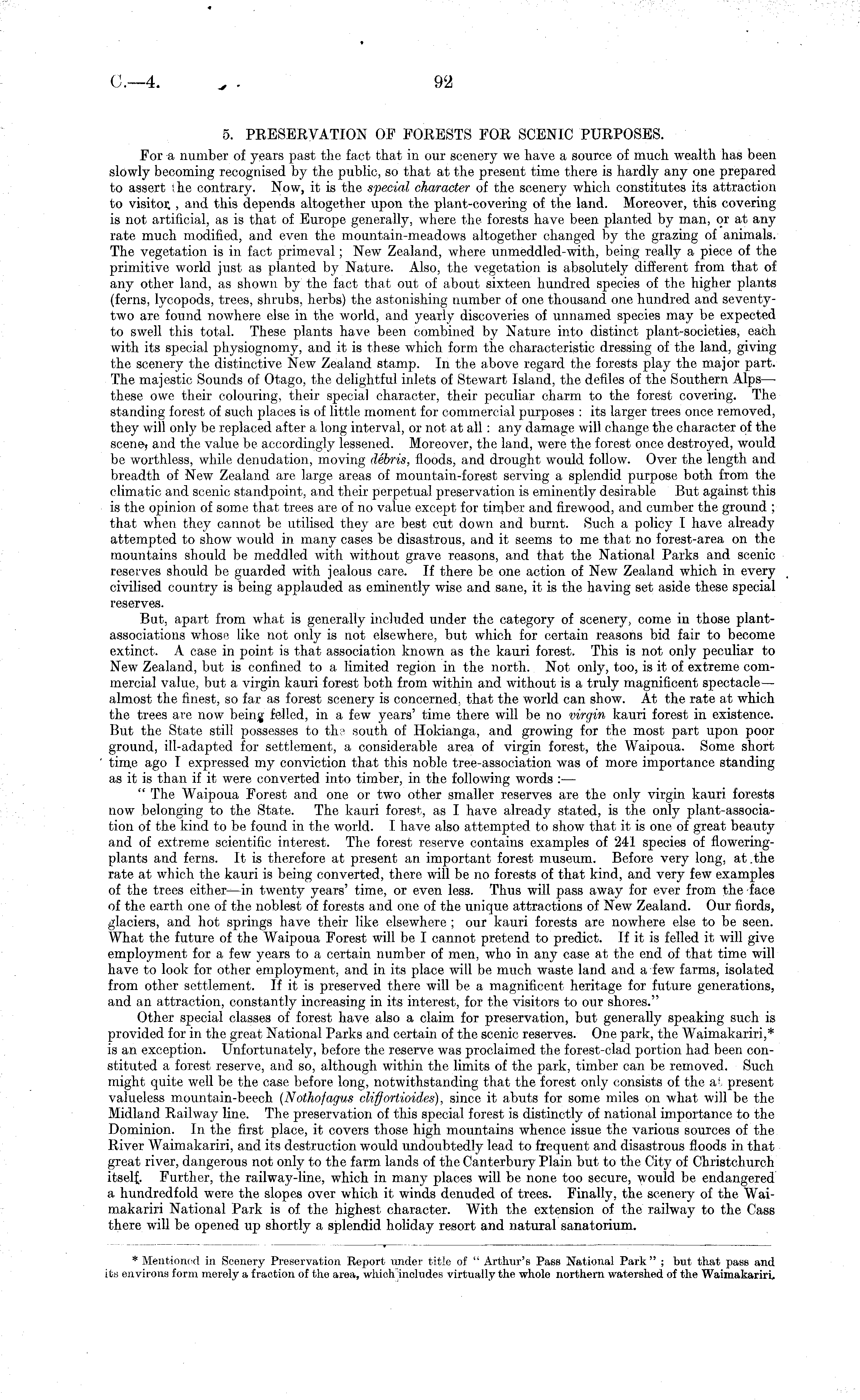 5. PRESERVATION OF FORESTS FOR SCENIC PURPOSES. For a number of years past the fact that in our scenery we have a source of much wealth has been slowly becoming recognised by the public, so that at the present time there is hardly any one prepared to assert she contrary. Now, it is the special character of the scenery which constitutes its attraction to visitor. , and this depends altogether upon the plant-covering of the land. Moreover, this covering is not artificial, as is that of Europe generally, where the forests have been planted by man, or at any rate much modified, and even the mountain-meadows altogether changed by the grazing of animals. The vegetation is in fact primeval; New Zealand, where unmeddled-with, being really a piece of the primitive world just as planted by Nature. Also, the vegetation is absolutely different from that of any other land, as shown by the fact that out of about sixteen hundred species of the higher plants (ferns, lycopods, trees, shrubs, herbs) the astonishing number of one thousand one hundred and seventytwo are found nowhere else in the world, and yearly discoveries of unnamed species may be expected to swell this total. These plants have been combined by Nature into distinct plant-societies, each with its special physiognomy, and it is these which form the characteristic dressing of the land, giving the scenery the distinctive New Zealand stamp. In the above regard the forests play the major part. The majestic Sounds of Otago, the delightful inlets of Stewart Island, the defiles of the Southern Alps — these owe their colouring, their special character, their peculiar charm to the forest covering. The standing forest of such places is of little moment for commercial purposes : its larger trees once removed, they will only be replaced after a long interval, or not at all: any damage will change the character of the scene, and the value be accordingly lessened. Moreover, the land, were the forest once destroyed, would be worthless, while denudation, moving debris, floods, and drought would follow. Over the length and breadth of New Zealand are large areas of mountain-forest serving a splendid purpose both from the climatic and scenic standpoint, and their perpetual preservation is eminently desirable But against this is the opinion of some that trees are of no value except for timber and firewood, and cumber the ground ; that when they cannot be utilised they are best cut down and burnt. Such a policy I have already attempted to show would in many cases be disastrous, and it seems to me that no forest-area on the mountains should be meddled with without grave reasons, and that the National Parks and scenic reserves should be guarded with jealous care. If there be one action of New Zealand which in every civilised country is being applauded as eminently wise and sane, it is the having set aside these special reserves. But, apart from what is generally included under the category of scenery, come in those plantassociations whose like not only is not elsewhere, but which for certain reasons bid fair to become extinct. A case in point is that association known as the kauri forest. This is not only peculiar to New Zealand, but is confined to a limited region in the north. Not only, too, is it of extreme commercial value, but a virgin kauri forest both from within and without is a truly magnificent spectacle— almost the finest, so far as forest scenery is concerned, that the world can show. At the rate at which the trees are now being felled, in a few years' time there will be no virgin kauri forest in existence. But the State still possesses to th;> south of Hokianga, and growing for the most part upon poor ground, ill-adapted for settlement, a considerable area of virgin forest, the Waipoua. Some short time ago I expressed my conviction that this noble tree-association was of more importance standing as it is than if it were converted into timber, in the following words : — " The Waipoua Forest and one or two other smaller reserves are the only virgin kauri forests now belonging to the State. The kauri forest, as I have already stated, is the only plant-associa-tion of the kind to be found in the world. I have also attempted to show that it is one of great beauty and of extreme scientific interest. The forest reserve contains examples of 241 species of floweringplants and ferns. It is therefore at present an important forest museum. Before very long, at the rate at which the kauri is being converted, there will be no forests of that kind, and very few examples of the trees either —in twenty years' time, or even less. Thus will pass away for ever from the face of the earth one of the noblest of forests and one of the unique attractions of New Zealand. Our fiords, glaciers, and hot springs have their like elsewhere ; our kauri forests are nowhere else to be seen. What the future of the Waipoua Forest will be I cannot pretend to predict. If it is felled it will give employment for a few years to a certain number of men, who in any case at the end of that time will have to look for other employment, and in its place will be much waste land and a few farms, isolated from other settlement. If it is preserved there will be a magnificent heritage for future generations, and an attraction, constantly increasing in its interest, for the visitors to our shores." Other special classes of forest have also a claim for preservation, but generally speaking such is provided for in the great National Parks and certain of the scenic reserves. One park, the Waimakariri,* is an exception. Unfortunately, before the reserve was proclaimed the forest-clad portion had been constituted a forest reserve, and so, although within the limits of the park, timber can be removed. Such might quite well be the case before long, notwithstanding that the forest only consists of the at present valueless mountain-beech (Nothofagus cliffortioides), since it abuts for some miles on what