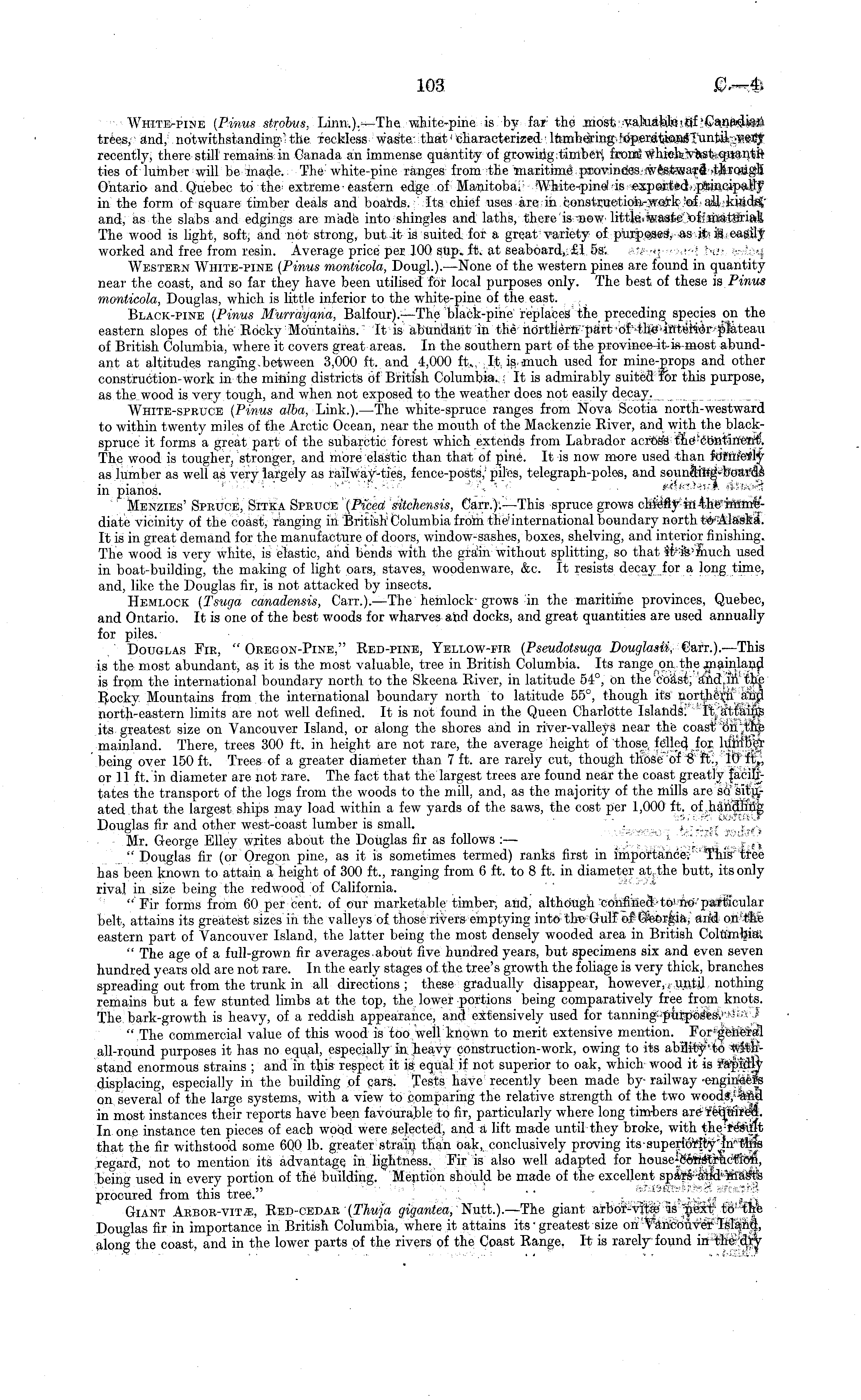 White-pine (Pinus strobus, Linn.).—The white-pine is by far the most valuable of Canacliari trees, and, notwithstanding" the reckless waste that• characterized lumbering .operations -until very recently, there still remains in Canada an immense quantity of growing timber, from; which vast,q.iiantit ties of lumber will be made. The white-pine ranges from the maritime provinces westward through Ontario and Quebec to extreme eastern edge of Manitoba. White-pine is expoitsdj.principaflf in the form of square timber deals and boards. ■ Its chief uses are in construction-work .'of all kiadsj and, as the slabs and edgings are made into shingles and laths, there is ~now< little waste of roatotiali The wood is light, soft, and not strong, but it is suited for a great variety of purposes, as it is easily worked and free from resin. Average price per 100 sup., ft. at seaboard,. £1 ss: . Western White-pine (Pinus monticola, Dough). —None of the western pines are found in quantity near the coast, and so far they have been utilised for local purposes only. The best of these is Pinus monticola, Douglas, which is little inferior to the white-pine of the east. Black-pine (Pinus Murrayana, Balfour). —The black-pine replaces the preceding species on the eastern slopes of the Rocky Mountains. It is abundant in the northernpart of the interior plateau of British Columbia, where it covers great areas. In the southern part of the province-it-is-most abundant at altitudes ranging. between 3,000 ft. and 4,000 ft., It is,much used for mine-props and other construction-work in the mining districts of British Columbia. It is admirably suited for this purpose, as the wood is very tough, and when not exposed to the weather does not easily decay. White-spruce (Pinus alba, Link.). —The white-spruce ranges from Nova Scotia north-westward to within twenty miles of the Arctic Ocean, near the mouth of the Mackenzie River, and with the blackspruce it forms a great part of the subarctic forest which extends from Labrador across the'continertt. The wood is tougher, stronger, and more elastic than that of pine. It is now more used than formerly as lumber as well as very largely as railway-ties, fence-posts, piles, telegraph-poles, and sounding-boards in pianos. Menzies' Spruce, Sitka Spruce (Picect sitchensis, Carr.). —This spruce grows chiefly in the immediate vicinity of the coast, ranging in British Columbia from thelnternational boundary north to Alaska. It is in great demand for the manufacture of doors, window-sashes, boxes, shelving, and interior finishing. The wood is very white, is elastic, and bends with the grain without splitting, so that iM's'-much used in the making of light oars, staves, wooden ware, &c. It resists decay for a long time, and, like the Douglas fir, is not attacked by insects. Hemlock (Tsuga canadensis, Carr.). —The hemlock grows in the maritime provinces, Quebec, and Ontario. It is one of the best woods for wharves and docks, and great quantities are used annually for piles. Douglas Fir, " Oregon-Pine," Red-pine, Yellow-fir (Pseudotsuga Douglasii, Carr.). —This is the most abundant, as it is the most valuable, tree in British Columbia. Its range on the mainland is from the international boundary north to the Skeena River, in latitude 54°, on the'coast, and. in the Rocky Mountains from the international boundary north to latitude 55°, though its northern north-eastern limits are not well defined. It is not found in the Queen Charlotte Islands. It attains its greatest size on Vancouver Island, or along the shores and in river-valleys near the coast on the mainland. There, trees 300 ft. in height are not rare, the average height of those, felled for lumber being over 150 ft. Trees of a greater diameter than 7 ft. are rarely cut, though those of 8 ft., 10 ft,, or 11 ft. in diameter are not rare. The fact that the largest trees are found near the coast greatly facilitates the transport of the logs from the woods to the mill, and, as the majority of the mills are so situated that the largest ships may load within a few yards of the saws, the cost per 1,000 ft. of handling Douglas fir and other west-coast lumber is small. Mr. George Elley writes about the Douglas fir as follows : — " Douglas fir (or Oregon pine, as it is sometimes termed) ranks first in importance. This tree has been known to attain a height of 300 ft., ranging from 6 ft. to 8 ft. in diameter at.the butt, its only rival in size being the redwood of California. " Fir forms from 60 per cent, of our marketable timber, and, although confined-to'no particular belt, attains its greatest sizes in the valleys of those rivers emptying into the Gulf of Georgia, arid on the eastern part of Vancouver Island, the latter being the most densely wooded area in British Columbia; " The age of a full-grown fir averages.about five hundred years, but specimens six and even seven hundred years old are not rare. In the early stages of the tree's growth the foliage is very thick, branches spreading out from the trunk in all directions ; these gradually disappear, however, until nothing remains but a few stunted limbs at the top, the lower portions being comparatively free from knots. The bark-growth is heavy, of a reddish appearance, and extensively used for tanning purposes. " The commercial value of this wood is too well known to merit extensive mention. For general all-round purposes it has no equal, especially in heavy construction-work, owing to its ability'to withstand enormous strains ; and in this respect it is equal if not superior to oak, which wood it is rapidly displacing, especially in the building of cars. Tests have recently been made by- railway -engineers on several of the large systems, with a view to comparing the relative strength of the two woods, -arid in most instances their reports have been favourable to fir, particularly where long tim-bers are- recpiirecL In one instance ten pieces of each wood were selected, a
