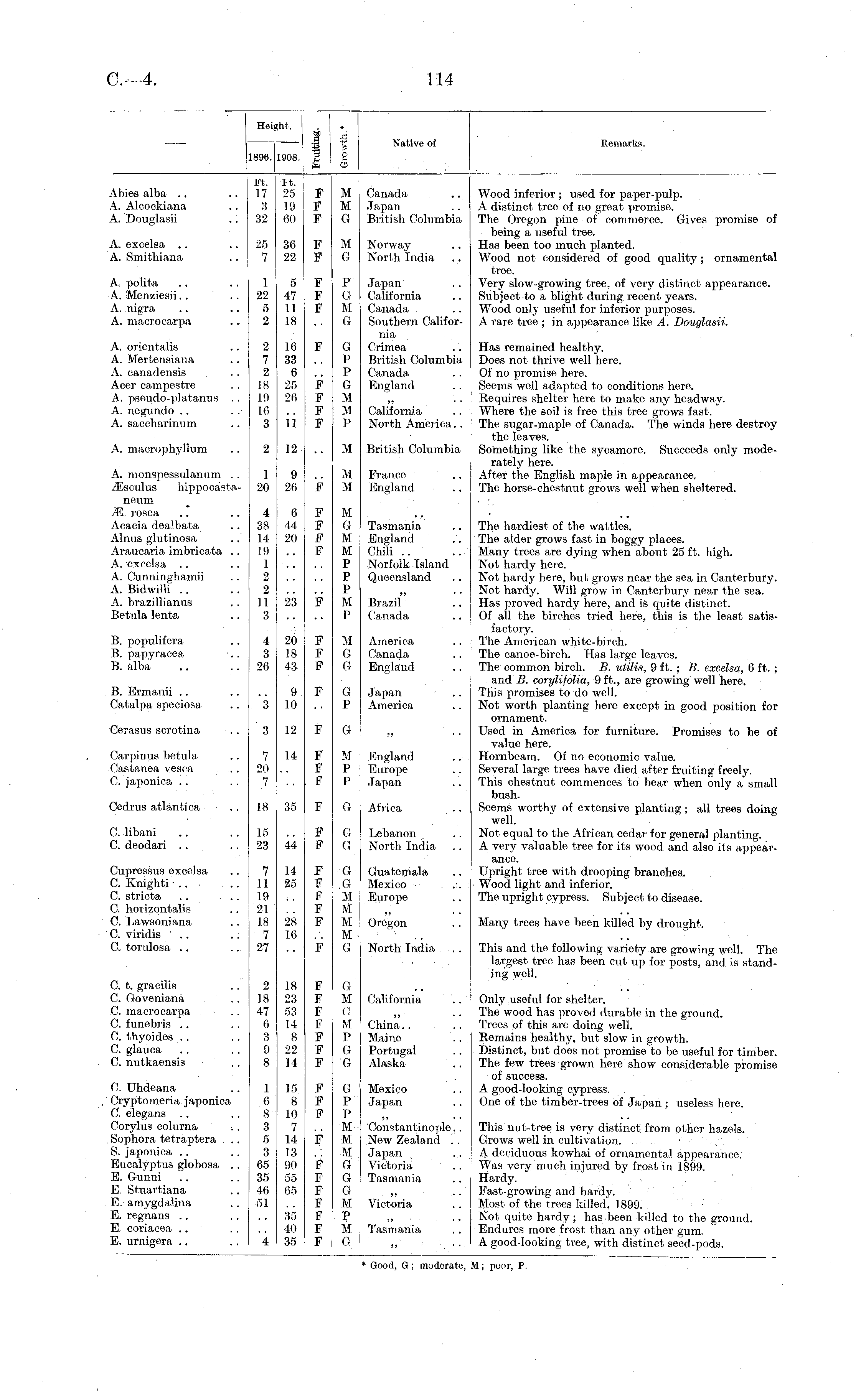 Height. I I TH HH E 1896. 1908. Native of Remarks. Abies alba A. Alcockiana A. Douglasii Ft, 17 3 32 Tt. 25 19 60 F F F M M G Canada Japan British Columbia Wood inferior ; used for paper-pulp. A distinct tree of no great promise. The Oregon pine of commerce. Gives promise of being a useful tree. Has been too much planted. Wood not considered of good quality ; ornamental tree. Very slow-growing tree, of very distinct appearance. Subject to a blight during recent years. Wood only useful for inferior purposes. A rare tree ; in appearance like A. Douglasii. A. excelsa A. Smithiana 25 7 36 22 F M G Norway North India A. polita A. Menziesii.. A. nigra A. macrocarpa 1 22 5 2 5 47 11 18 F F F P G M G Japan California Canada Southern California Crimea British Columbia Canada England A. orientalis A. Mertensiana A. canadensis Acer campestre A. pseudo-platanus . . A. negundo A. saecharinum 2 7 2 18 19 16 3 10 33 6 25 26 F F F F F G P P G M M P Has remained healthy. Does not thrive well here. Of no promise here. Seems well adapted to conditions here. Requires shelter here to make any headway. Where the soil is free this tree grows fast. The sugar-maple of Canada. The winds here destroy the leaves. Something like the sycamore. Succeeds only moderately here. After the English maple in appearance. The horse-chestnut grows well when sheltered. ii California North America. . A. macrophyllum 2 12 M British Columbia A. monspessulanum . . /Esculus hippocastaneum ,E„ rosea Acacia dealbata Alnus glutinosa Araucaria imbricata .. A. excelsa A. Cunninghamii A. Bidwilli .. A, brazillianus Betula lenta 1 20 4 38 14 19 1 2 2 11 3 9 26 6 44 20 F F V F F M M M G M M P P P M P France England Tasmania England Chili .. Norfolk Island Queensland The hardiest of the wattles. The alder grows fast in boggy places. Many trees are dying when about 25 ft. high. Not hardy here. Not hardy here, but grows near the sea in Canterbury. Not hardy. Will grow in Canterbury near the sea. Has proved hardy here, and is quite distinct. Of all the birches tried here, this is the least satisfactory. The American white-birch. The canoe-birch. Has large leaves. The common birch. B. utilis, 9 ft. ; B. excelsa, 6 ft. ; and B. corylifolia, 9ft., are growing well here. This promises to do well. Not worth planting here except in good position for ornament. Used in America for furniture. Promises to be of value here. Hornbeam. Of no economic value. Several large trees have died after fruiting freely. This chestnut commences to bear when only a small bush. 23 F Brazil Canada B. populifera B. papyracea B. alba 4 3 21 i 20 18 43 F F I-' M G G America Canada England B. Ermanii Catalpa speciosa 3 9 10 F G l> Japan America Cerasus sorotina 3 12 F G Carpinus betula Castanea vesca C. japonica 7 20 7 14 V F F M P P England Europe Japan Cedrus atlantica 18 35 F G Africa Seems worthy of extensive planting ; all trees doing well. Not equal to the African cedar for general planting. A very valuable tree for its wood and also its appearance. Upright tree with drooping branches. Wood light and inferior. The upright cypress. Subject to disease. C. libani C. deodari 15 23 44 F F G G Lebanon North India Cupressus excelsa C. Knighti •.-. C. stricta C. horizontalis C. Lawsoniana C. viridis C. torulosa 7 11 19 21 18 7 27 14 25 28 16 F F F F F K G .G M M iVI M G Guatemala Mexico Europe Oregon Many trees have been killed by drought. North India This and the following variety are growing well. The largest tree has been cut up for posts, and is standing well. C. t. gracilis C. Goveniana C. macrocarpa C. funebris C. thyoides C. glauca C. nutkaensis 2 IS 47 6 3 9 8 18 23 53 14 8 22 14 K F F F F F F G M G M P G G California China Maine Portugal Alaska Only useful for shelter. The wood has proved durable in the ground. Trees of this are doing well. Remains healthy, but slow in growth. Distinct, but does not promise to be useful for timber. The few trees grown here show considerable promise of success. A good-looking cypress. One of the timber-trees of Japan ; useless here. C. Uhdeana Cryptomeria japonica C elegans Corylus colurna Sophora tetraptera S. japonica Eucalyptus globosa .. E. Gunni E, Stuartiana E. amygdalina E. regnans E. coriacea E. urnigera .. 1 6 8 3 5 3 65 35 46 51 15 8 10 7 14 13 90 55 65 F F F F F V F F F F F G P P M M M G G G M P M G Mexico Japan Constantinople.. Now Zealand .. Japan Victoria Tasmania This nut-tree is very distinct from other hazels. Grows well in cultivation. A deciduous kowhai of ornamental appearance. Was very much injured by frost in 1899. Hardy. Fast-growing and hardy. Most of the trees killed, 1899. Not quite hardy; has been killed to the ground. Endures more frost than any other gum. A good-looking tree, with distinct seed-pods. 35 40 35 Victoria Tasmania 4 * Good, G ; moderate. M; toor, P,