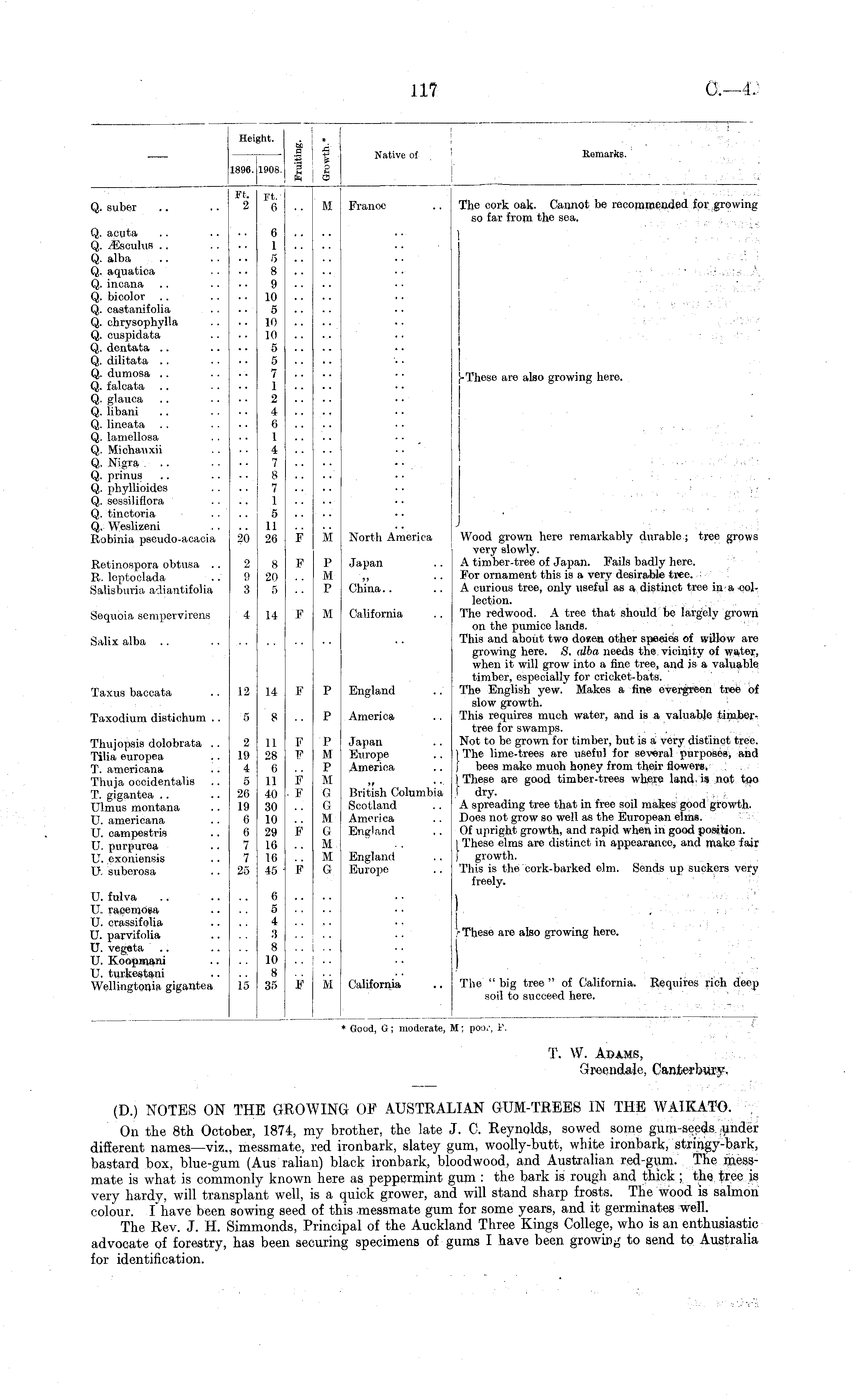 (D.) NOTES ON THE GROWING OF AUSTRALIAN GUM-TREES IN THE WAIKATO. On the Bth October, 1874, my brother, the late J. C. Reynolds, sowed some gum-seeds, under different names—viz., messmate, red ironbark, slatey gum, woolly-butt, white ironbark, stringy-bark, bastard box, blue-gum (Aus ralian) black ironbark, blood wood, and Australian red-gum. The messmate is what is commonly known here as peppermint gum : the bark is rough and thick ; the tree is very hardy, will transplant well, is a quick grower, and will stand sharp frosts. The wood is salmon colour, fhave been sowing seed of this messmate gum for some years, and it germinates well. The Rev. J. H. Simmonds, Principal of the Auckland Three Kings College, who is an enthusiastic advocate of forestry, has been securing specimens of gums I have been growing to send to Australia for identification.