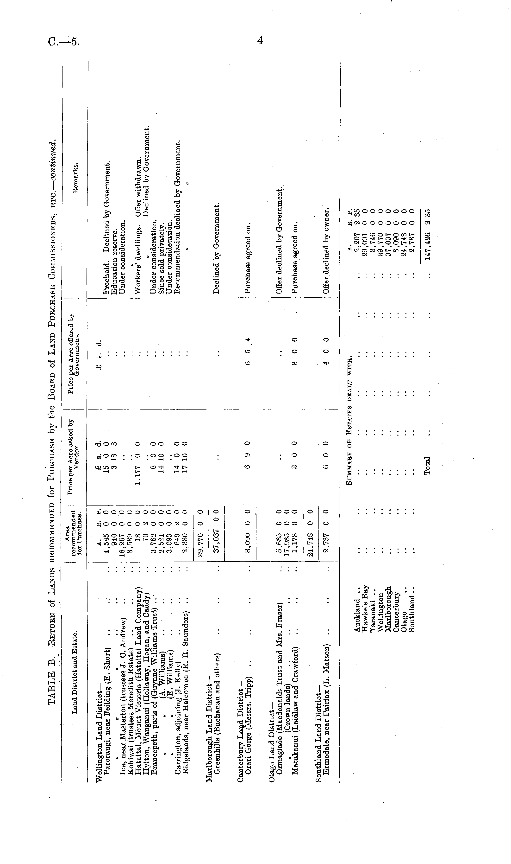 Land District and Estate. Area recommended for Purchase, i Price per Acre asked by Vendor. Price per Acre offered by Government. Remarks. Wellington Land District — Parorangi, near Feilding (E. Short) A. B. P. 4,585 0 0 940 0 0 18,267 0 0 3,539 0 0 13 0 0 70 2 0 3,762 0 0 2,521 0 0 3,093 0 0 649 2 0 2,330 0 0 £ s. d. 15 0 0 3 18 3 £ s. d. lea, near Masterton (trustees J. C. Andrew) Kohiwai (trustees Meredith Estate) Hataitai, Mount Victoria (Hataitai Land Company) Hylton, Wanganui (Hollaway, Hogan, and Caddy) Brancepeth, parts of (Guynne Williams Trust) .. (A. Williams) (E. Williams) Carrington, adjoining (J. Kelly) Ridgelands, near Halcombe (E. B. Saunders) .. Freehold. Declined by Government. Education reserve. Under consideration. 1,177 0 0 Workers' dwellings. Offer withdrawn. » Declined by Government. Under consideration. Since sold privately. Under consideration. Recommendation declined by Government. 8 0 0 14 10 0 14 0 0 17 10 0 Marlborough Land District — Greenhills (Buchanan and others) 39,770 0 0 37,037 0 0 Declined by Government. Canterbury Land District — Orari Gorge (Messrs. Tripp) 8,090 0 0 6 9 0 6 5 4 Purchase agreed on. Otago Land District — Ormaglade (Macdonalds Trust and Mrs. Praser) „ (Crown lands) Matakanui (Laidlaw and Crawford) 5,635 0 0 17,935 0 0 1,178 0 0 24,748 0 0 2,737 0 0 Offer declined by Government. 3 0 0 3 0 0 Purchase agreed on. Southland Land District — Ermedale, near Fairfax (L. Matson) 6 0 0 4 0 0 Offer declined by owner.