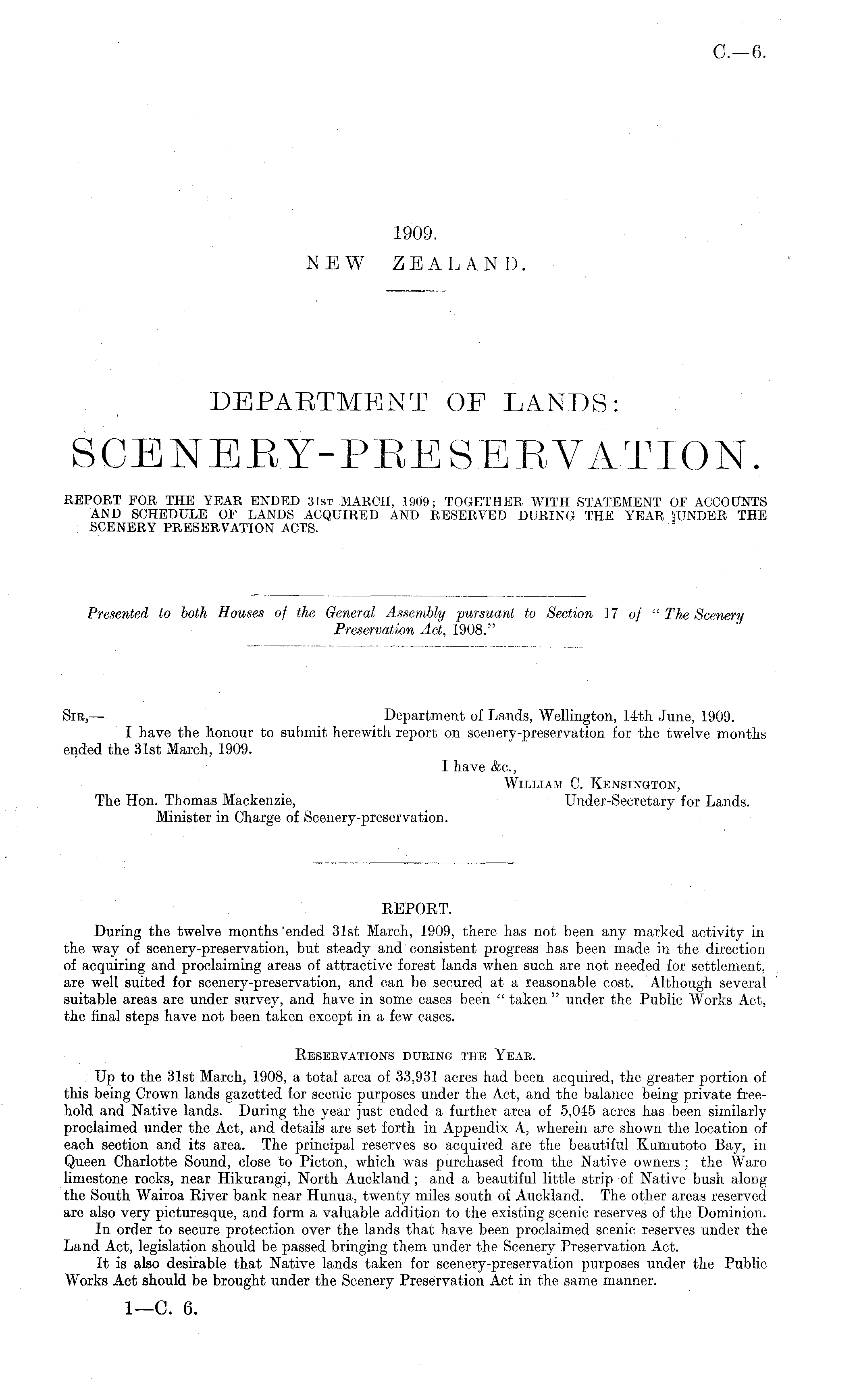 DEPARTMENT OF LANDS: SCENERY-PRESERVATION. REPORT FOR THE YEAR ENDED 31st MARCH, 1909; TOGETHER WITH STATEMENT OF ACCOUNTS AND SCHEDULE OF LANDS ACQUIRED AND RESERVED DURING THE YEAR UNDER THE SCENERY PRESERVATION ACTS.