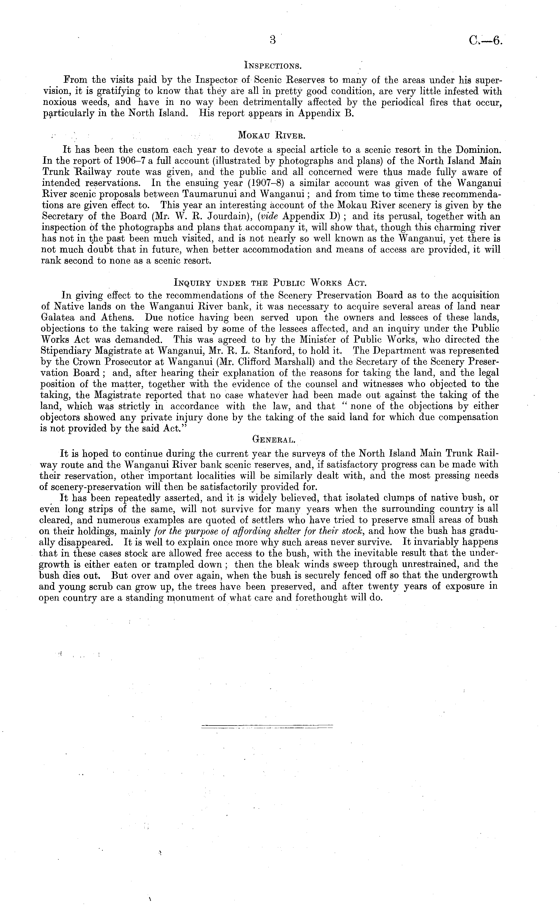 Inspections. From the visits paid by the Inspector of Scenic Reserves to many of the areas under his supervision, it is gratifying to know that they are all in pretty good condition, are very little infested with noxious weeds, and have in no way been detrimentally affected by the periodical fires that occur, particularly in the North Island. His report appears in Appendix B. ;■■.',: MOKAU RIVER. It has been the custom each year to devote a special article to a scenic resort in the Dominion. In the report of 1906-7 a full account (illustrated by photographs and plans) of the North Island Main Trunk Railway route was given, and the public and all concerned were thus made fully aware of intended reservations. In the ensuing year (1907-8) a similar account was given of the Wanganui River scenic proposals between Taumarunui and Wanganui; and from time to time these recommendations are given effect to. This year an interesting account of the Mokau River scenery is given by the Secretary of the Board (Mr. W. R. Jourdain), (vide Appendix D) ; and its perusal, together with an inspection of the photographs and plans that accompany it, will show that, though this charming river has not in the past been much visited, and is not nearly so well known as the Wanganui, yet there is not much doubt that in future, when better accommodation and means of access are provided, it will rank second to none as a scenic resort. Inquiry under the Public Works Act. In giving effect to the recommendations of the Scenery Preservation Board as to the acquisition of Native lands on the Wanganui River bank, it was necessary to acquire several areas of land near Galatea and Athens. Due notice having been served upon the owners and lessees of these lands, objections to the taking were raised by some of the lessees affected, and an inquiry under the Public Works Act was demanded. This was agreed to by the Minister of Public Works, who directed the Stipendiary Magistrate at Wanganui, Mr. R. L. Stanford, to hold it. The Department was represented by the Crown Prosecutor at Wanganui (Mr. Clifford Marshall) and the Secretary of the Scenery Preservation Board ; and, after hearing their explanation of the reasons for taking the land, and the legal position of the matter, together with the evidence of the counsel and witnesses who objected to the taking, the Magistrate reported that no case whatever had been made out against the taking of the land, which was strictly in accordance with the law, and that " none of the objections by either objectors showed any private injury done by the taking of the said land for which due compensation is not provided by the said Act." General. It is hoped to continue during the current year the surveys of the North Island Main Trunk Railway route and the Wanganui River bank scenic reserves, and, if satisfactory progress can be made with their reservation, other important localities will be similarly dealt with, and the most pressing needs of scenery-preservation will then be satisfactorily provided for. It has been repeatedly asserted, and it is widely believed, that isolated clumps of native bush, or even long strips of the same, will not survive for many years when the surrounding country is all cleared, and numerous examples are quoted of settlers who have tried to preserve small areas of bush on their holdings, mainly for the pur-pose of affording shelter for their stock, and how the bush has gradually disappeared. It is well to explain once more why such areas never survive. It invariably happens that in these cases stock are allowed free access to the bush, with the inevitable result that the undergrowth is either eaten or trampled down ; then the bleak winds sweep through unrestrained, and the bush dies out. But over and over again, when the bush is securely fenced off so that the undergrowth and young scrub can grow up, the trees have been preserved, and after twenty years of exposure in open country are a standing monument of what care and forethought will do.