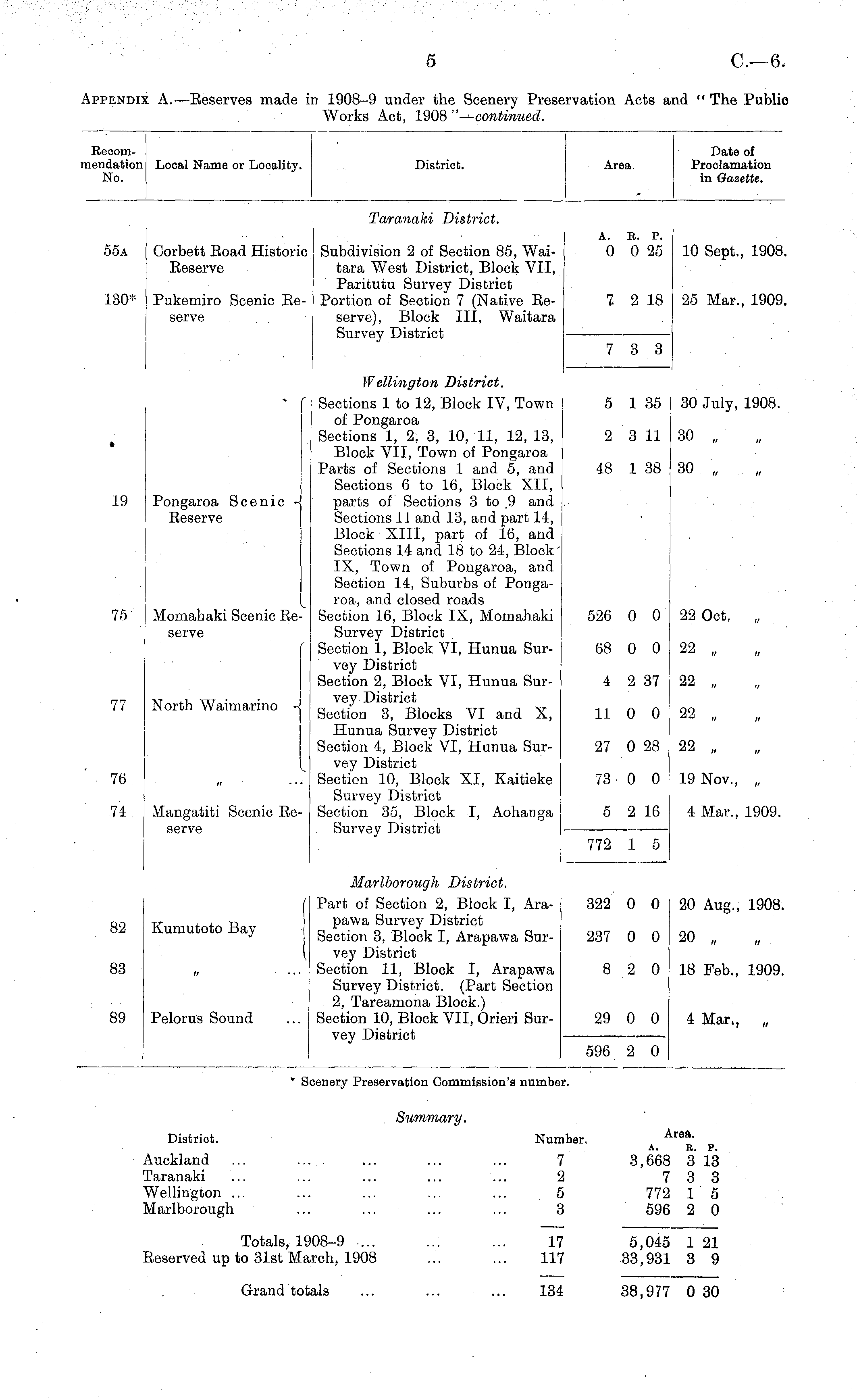 Appendix A.—Reserves made in 1908-9 under the Scenery Preservation Acts and "The Public Works Act, 1908"— continued.