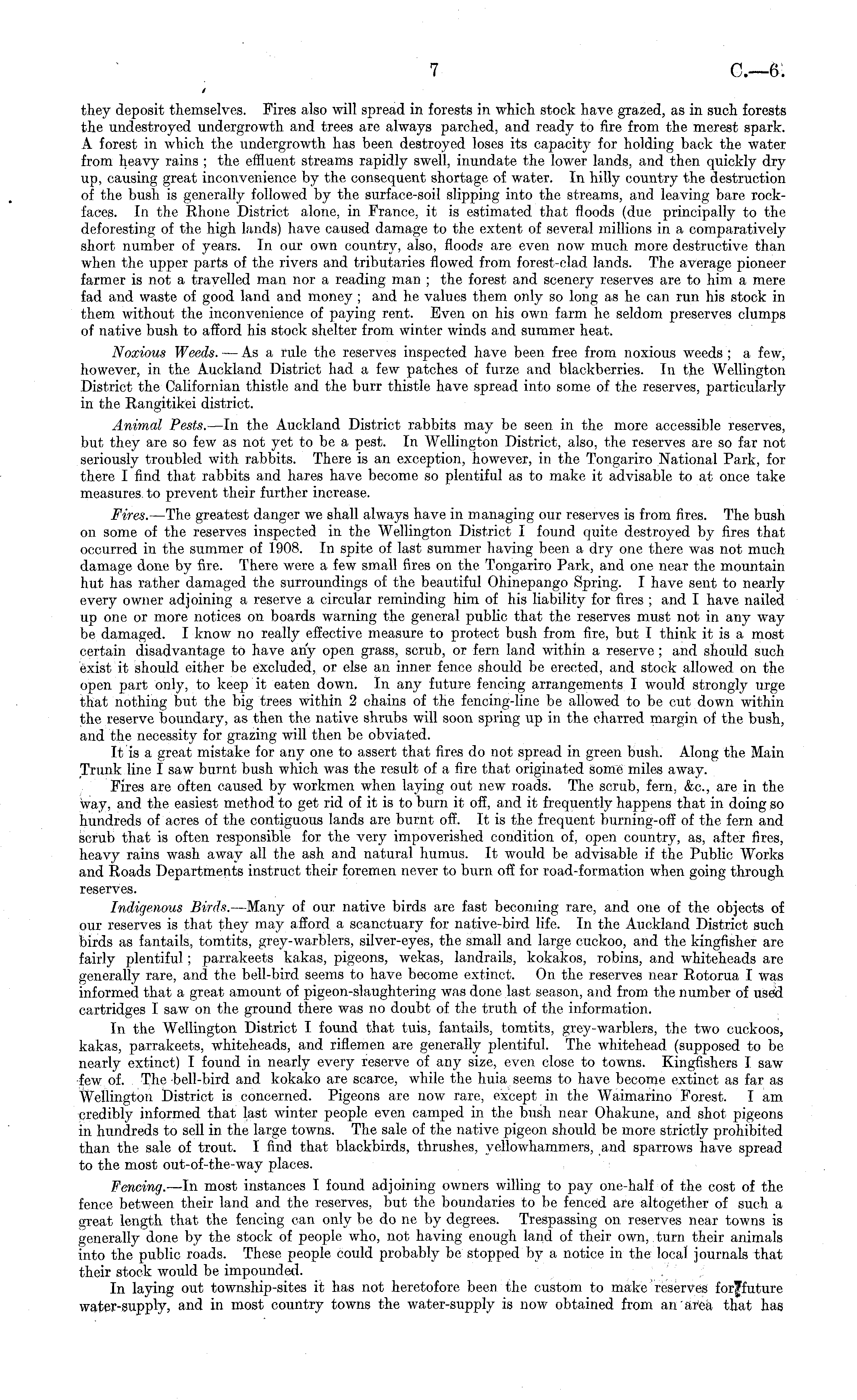 they deposit themselves. Fires also will spread in forests in which stock have grazed, as in such forests the undestroyed undergrowth and trees are always parched, and ready to fire from the merest spark. A forest in which the undergrowth has been destroyed loses its capacity for holding back the water from heavy rains ; the effluent streams rapidly swell, inundate the lower lands, and then quickly dry up, causing great inconvenience by the consequent shortage of water. In hilly country the destruction of the bush is generally followed by the surface-soil slipping into the streams, and leaving bare rockfaces. In the Rhone District alone, in France, it is estimated that floods (due principally to the deforesting of the high lands) have caused damage to the extent of several millions in a comparatively short number of years. In our own country, also, floods are even now much more destructive than when the upper parts of the rivers and tributaries flowed from forest-clad lands. The average pioneer farmer is not a travelled man nor a reading man ; the forest and scenery reserves are to him a mere fad and waste of good land and money ; and he values them only so long as he can run his stock in them without the inconvenience of paying rent. Even on his own farm he seldom preserves clumps of native bush to afford his stock shelter from winter winds and summer heat. Noxious Weeds. —As a rule the reserves inspected have been free from noxious weeds ; a few, however, in the Auckland District had a few patches of furze and blackberries. In the Wellington District the Californian thistle and the burr thistle have spread into some of the reserves, particularly in the Rangitikei district. Animal Pests. —ln the Auckland District rabbits may be seen in the more accessible reserves, but they are so few as not yet to be a pest. In Wellington District, also, the reserves are so far not seriously troubled with rabbits. There is an exception, however, in the Tongariro National Park, for there I find that rabbits and hares have become so plentiful as to make it advisable to at once take measures, to prevent their further increase. Fires. —The greatest danger we shall always have in managing our reserves is from fires. The bush on some of the reserves inspected in the Wellington District I found quite destroyed by fires that occurred in the summer of 1908. In spite of last summer having been a dry one there was not much damage done by fire. There were a few small fires on the Tongariro Park, and one near the mountain hut has rather damaged the surroundings of the beautiful Ohinepango Spring. I have sent to nearly every owner adjoining a reserve a circular reminding him of his liability for fires ; and I have nailed up one or more notices on boards warning the general public that the reserves must not in any way be damaged. I know no really effective measure to protect bush from fire, but I think it is a most certain disadvantage to have any open grass, scrub, or fern land within a reserve ; and should such exist it should either be excluded, or else an inner fence should be erected, and stock allowed on the open part only, to keep it eaten down. In any future fencing arrangements I would strongly urge that nothing but the big trees within 2 chains of the fencing-line be allowed to be cut down within the reserve boundary, as then the native shrubs will soon spring up in the charred margin of the bush, and the necessity for grazing will then be obviated. It is a great mistake for any one to assert that fires do not spread in green bush. Along the Main Trunk line I saw burnt bush which was the result of a fire that originated some miles away. Fires are often caused by workmen when laying out new roads. The scrub, fern, &c, are in the way, and the easiest method to get rid of it is to burn it off, and it frequently happens that in doing so hundreds of acres of the contiguous lands are burnt off. It is the frequent burning-off of the fern and scrub that is often responsible for the very impoverished condition of, open country, as, after fires, heavy rains wash away all the ash and natural humus. It would be advisable if the Public Works and Roads Departments instruct their foremen never to burn off for road-formation when going through reserves. Indigenous Birds. —Many of our native birds are fast becoming rare, and one of the objects of our reserves is that they may afford a scanctuary for native-bird life. In the Auckland District such birds as fantails, tomtits, grey-warblers, silver-eyes, the small and large cuckoo, and the kingfisher are fairly plentiful; parrakeets kakas, pigeons, wekas, landrails, kokakos, robins, and whiteheads are generally rare, and the bell-bird seems to have become extinct. On the reserves near Rotorua I was informed that a great amount of pigeon-slaughtering was done last season, and from the number of used cartridges I saw on the ground there was no doubt of the truth of the information. In the Wellington District I found that tuis, fantails, tomtits, grey-warblers, the two cuckoos, kakas, parrakeets, whiteheads, and riflemen are generally plentiful. The whitehead (supposed to be nearly extinct) I found in nearly every reserve of any size, even close to towns. Kingfishers I saw few of. The bell-bird and kokako are scarce, while the huia seems to have become extinct as far as Wellington District is concerned. Pigeons are now rare, except in the Waimarino Forest. lam credibly informed that last winter people even camped in the bush near Ohakune, and shot pigeons in hundreds to sell in the large towns. The sale of the native pigeon should be more strictly prohibited than the sale of trout. I find that blackbirds, thrushes, yellowhammers, and sparrows have spread to the most out-of-the-way places. Fencing. —In most instances I found adjoining owners willing to pay one-half of the cost of the fence between their land and the reserves, but the boundaries to be fenced are altogethe