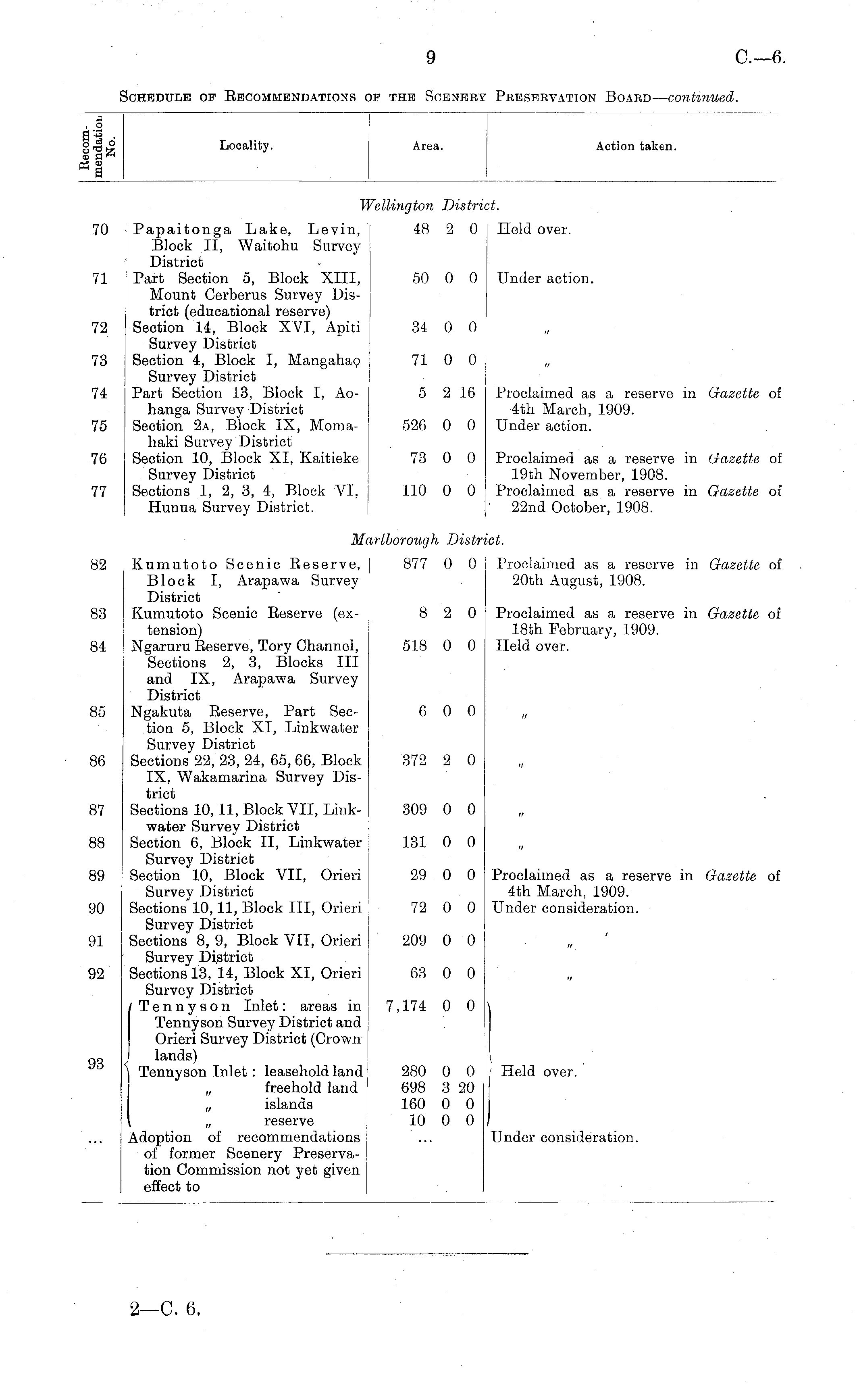i o a'-s • o* o M a Locality. Area. Action taken. Wellington Distrii H. 70 Papaitonga Lake, Levin, Block II, Waitohu Survey District Part Section 5, Block XIII, Mount Cerberus Survey District (educational reserve) Section 14, Block XVI, Apiti Survey District Section 4, Block I, Mangahao Survey District Part Section 13, Block I, Aohanga Survey District Section 2a, Block IX, Momahaki Survey District Section 10, Block XI, Kaitieke Survey District Sections 1, 2, 3, 4, Block VI, Hunua Survey District. 48 2 0 Held over. 71 50 0 0 Under action. 72 34 0 0 73 71 0 0 74 5 2 16 Proclaimed as a reserve in Gazette of 4th March, 1909. Under action. 75 526 0 0 76 77 73 0 0 110 0 0 Proclaimed as a reserve in Gazette of 19th November, 1908. Proclaimed as a reserve in Gazette of ' 22nd October, 1908. M< \rlborough Distn 'ct. 85 86 87 88 82 83 84 Kumutoto Scenic Reserve, Block I, Arapawa Survey District Kumutoto Scenic Reserve (extension) Ngaruru Reserve, Tory Channel, Sections 2, 3, Blocks III and IX, Arapawa Survey District Ngakuta Reserve, Part Section 5, Block XI, Linkwater Survey District Sections 22, 23, 24, 65, 66, Block IX, Wakamarina Survey District Sections 10,11, Block VII, Linkwater Survey District Section 6, Block II, Linkwater Survey District Section 10, Block VII, Orieri Survey District Sections 10,11, Block III, Orieri Survey District Sections 8, 9, Block VII, Orieri Survey District Sections 13, 14, Block XI, Orieri Survey District 1 Tennyson Inlet: areas in Tennyson Survey District and Orieri Survey District (Crown lands) Tennyson Inlet : leasehold land „ freehold land „ islands 877 0 0 8 2 0 518 0 0 6 0 0 372 2 0 309 0 0 131 0 0 Proclaimed as a reserve in Gazette of 20th August, 1908. Proclaimed as a reserve in Gazette of 18th February, 1909. Held over. /; 89 29 0 0 Proclaimed as a reserve in Gazette of 4th March, 1909. Under consideration. 90 72 0 0 91 209 0 0 92 63 0 0 it \ 7,174 0 0 ■ 93 280 0 0 698 3 20 160 0 0 10 0 0 I Held over. „ reserve Adoption of recommendations of former Scenery Preservation Commission not yet given effect to i Under consideration.