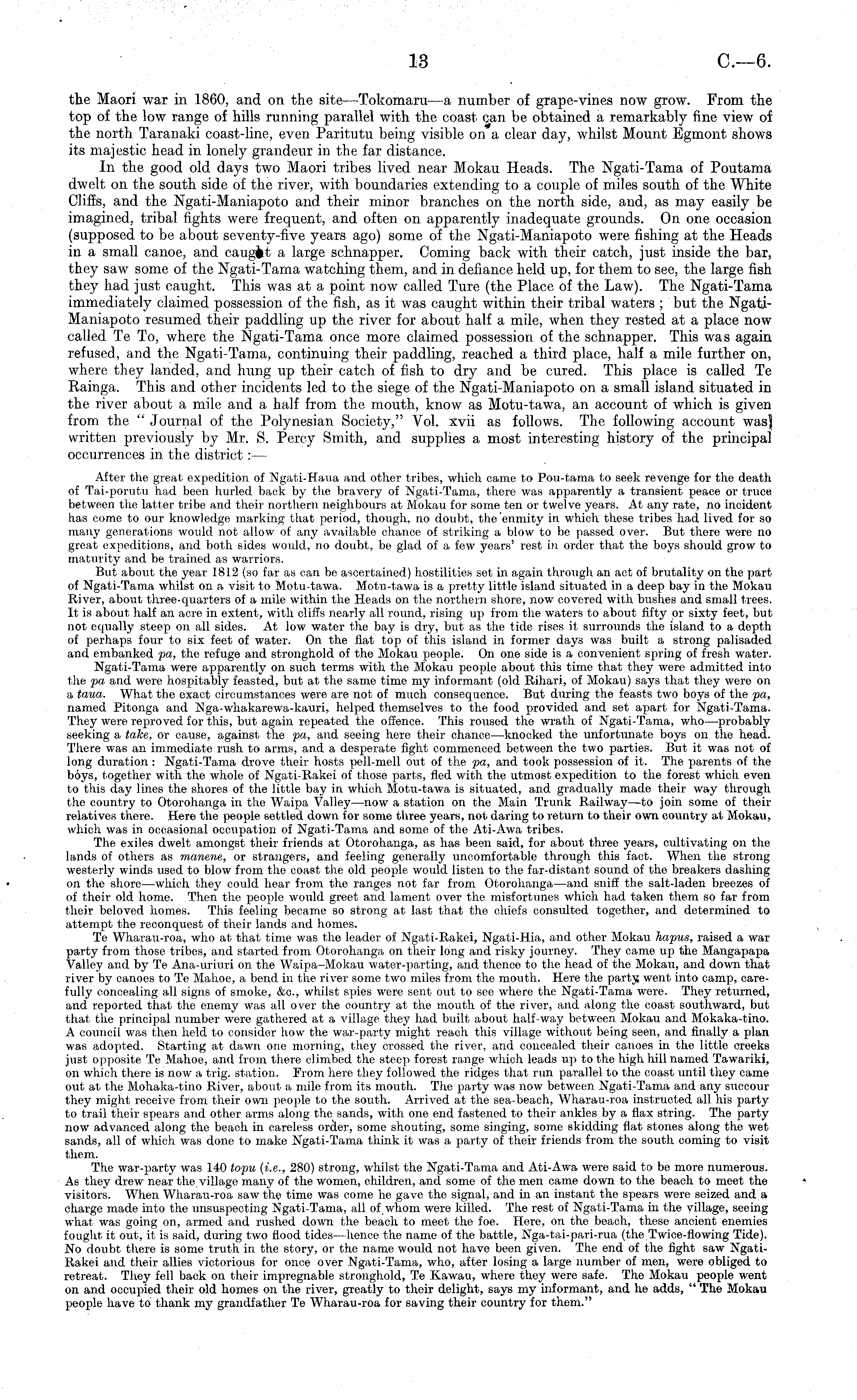 the Maori war in 1860, and on the site—Tokomaru—a number of grape-vines now grow. From the top of the low range of hills running parallel with the coast can be obtained a remarkably fine view of the north Taranaki coast-line, even Paritutu being visible on a clear day, whilst Mount Egmont shows its majestic head in lonely grandeur in the far distance. In the good old days two Maori tribes lived near Mokau Heads. The Ngati-Tama of Poutama dwelt on the south side of the river, with boundaries extending to a couple of miles south of the White Cliffs, and the Ngati-Maniapoto and their minor branches on the north side, and, as may easily be imagined, tribal fights were frequent, and often on apparently inadequate grounds. On one occasion (supposed to be about seventy-five years ago) some of the Ngati-Maniapoto were fishing at the Heads in a small canoe, and caugfct a large schnapper. Coming back with their catch, just inside the bar, they saw some of the Ngati-Tama watching them, and in defiance held up, for them to see, the large fish they had just caught. This was at a point now called Ture (the Place of the Law). The Ngati-Tama immediately claimed possession of the fish, as it was caught within their tribal waters ; but the NgatiManiapoto resumed their paddling up the river for about half a mile, when they rested at a place now called Te To, where the Ngati-Tama once more claimed possession of the schnapper. This was again refused, and the Ngati-Tama, continuing their paddling, reached a third place, half a mile further on, where they landed, and hung up their catch of fish to dry and be cured. This place is called Te Rainga. This and other incidents led to the siege of the Ngati-Maniapoto on a small island situated in the river about a mile and a half from the mouth, know as Motu-tawa, an account of which is given from the " Journal of the Polynesian Society," Vol. xvii as follows. The following account was'j written previously by Mr. S. Percy Smith, and supplies a most interesting history of the principal occurrences in the district:— After the great expedition of Ngati-Haua and other tribes, which came to Pou-tama to seek revenge for the death of Tai-porutu had been hurled back by the bravery of Ngati-Tama, there was apparently a transient peace or truce between the latter tribe and their northern neighbours at Mokau for some ten or twelve years. At any rate, no incident has come to our knowledge marking that period, though, no doubt, the enmity in which these tribes had lived for so many generations would not allow of any available chance of striking a blow to be passed over. But there were no great expeditions, and both sides would, no doubt, be glad of a few years' rest in order that the boys should grow to maturity and be trained as warriors. But about the year 1812 (so far as can be ascertained) hostilities set in again through an act of brutality on the part of Ngati-Tama whilst on a visit to Motu-tawa. Motu-tawa is a pretty little island situated in a deep bay in the Mokau River, about three-quarters of a mile within the Heads on the northern shore, now covered with bushes and small trees. It is about half an acre in extent, with cliffs nearly all round, rising up from the waters to about fifty or sixty feet, but not equally steep on all sides. At low water the bay is dry, but as the tide rises it surrounds the island to a depth of perhaps four to six feet of water. On the flat top of this island in former days was built a strong palisaded and embanked pa, the refuge and stronghold of the Mokau people. On one side is a convenient spring of fresh water. Ngati-Tama were apparently on such terms with the Mokau people about this time that they were admitted into tile pa and were hospitably feasted, but at the same time my informant (old Bihari, of Mokau) says that they were on a taua. What the exact circumstances were are not of much consequence. But during the feasts two boys of the pa, named Pitonga and Nga-whakarewa-kauri, helped themselves to the food provided and set apart for Ngati-Tama. They were reproved for this, but again repeated the offence. This roused the wrath of Ngati-Tama, who—probably seeking a take, or cause, against the pa, and seeing here their chance—knocked the unfortunate boys on the head. There was an immediate rush to arms, and a desperate fight commenced between the two parties. But it was not of long duration : Ngati-Tama drove their hosts pell-mell out of the pa, and took possession of it. The parents of the boys, together with the whole of Ngati-Rakei of those parts, fled with the utmost expedition to the forest which even to this day lines the shores of the little bay in which Motu-tawa is situated, and gradually made their way through the country to Otorohanga in the Waipa Valley—now a station on the Main Trunk Railway—to join some of their relatives there. Here the people settled down for some three years, not daring to return to their own country at Mokau, which was in occasional occupation of Ngati-Tama and some of the Ati-Awa tribes. The exiles dwelt amongst their friends at Otorohanga, as has been said, for about three years, cultivating on the lands of others as manene, or strangers, and feeling generally uncomfortable through this fact. When the strong westerly winds used to blow from the coast the old people would listen to the far-distant sound of the breakers dashing on the shore —which they could hear from the ranges not far from Otorohanga —and sniff the salt-laden breezes of of their old home. Then the people would greet and lament over the misfortunes which had taken them so far from their beloved homes. This feeling became so strong at last that the chiefs consulted together, and determined to attempt the reconquest of their lands and homes. Te Wharau-roa, who at that time was the leader of Ngati-Rakei, Ngati-Hia, and other Mokau hapus, raised a war party from those tribes, and started from Otorohanga on their long and 