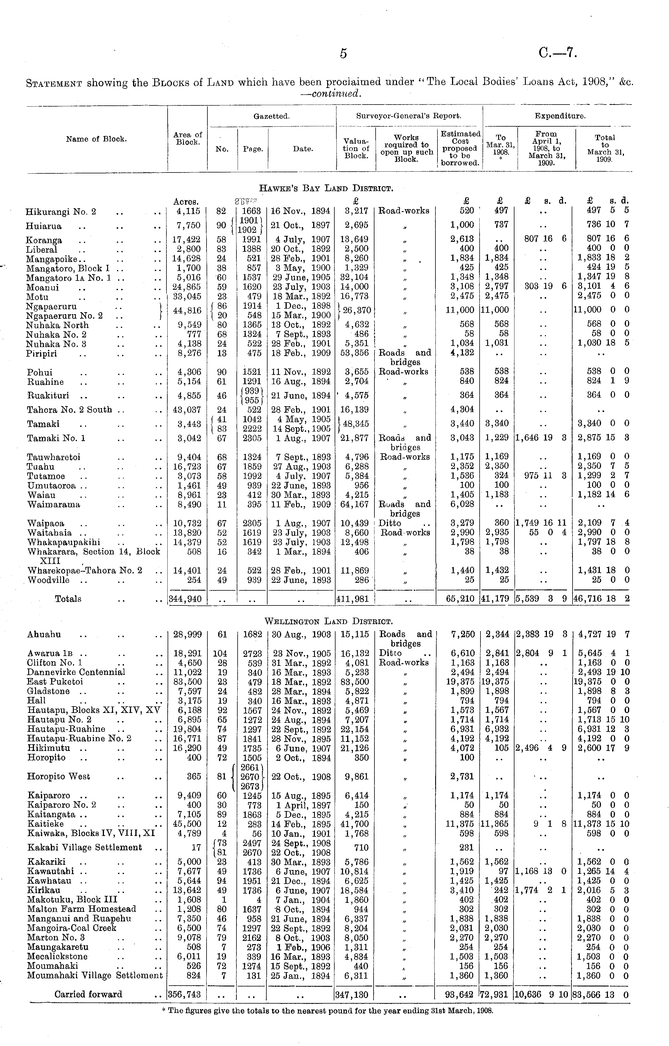 Name of Block. Area of Block. No. Gazetted. Page. Date. Surv< Valuation of Block. iyor-General's Report. Works Estimated To From o P e q n U up ea ~* "SI 1 ' "OS.'to' open up sucn to be isus. March 31, BiocK. borrowed. 1909. Expenditure. Total to March 31, 1909. Hawke's Bay L. lND Disti HOT. Acres. 4,115 1663 19011 1902 } 1991 1388 521 857 1537 1620 479 1914 548 1365 1324 522 475 16 Nov., 1894 £ 3,217 Road-works £ 520 £ ; 497 £ s. d. £ s. d. 497 5 5 Hikurangi No. 2 82 Huiarua 7,750 90 | 21 Oct., 1897 2,695 1,000 737 736 10 7 Koranga Liberal Mangapoike Mangatoro, Block I .. Mangatoro 1a No. 1 .. Moanui Motu Ngapaeruru Ngapaeruru No. 2 .. f Nuhaka North Nuhaka No. 2 Nuhaka No. 3 Piripiri 17,422 2,800 14,628 1,700 5,016 24,865 33,045 58 83 24 38 60 59 23 ( 86 t 20 80 68 24 13 4 July, 1907 20 Oct., 1892 28 Feb., 1901 3 May, 1900 29 June, 1905 23 July, 1903 18 Mar., 1892 1 Dec, 1898 15 Mar., 1900 13 Oct., 1892 7 Sept., 1893 28 Feb., 1901 18 Feb., 1909 13,649 2,500 8,260 1,329 32,104 14,000 16,773 126,370 2,613 400 1,834 425 1,348 3,108 2,475 400 1,834 425 1,348 2,797 2,475 807 16 6 807 16 6 400 0 0 1,833 18 2 424 19 5 1,347 19 8 3,101 4 6 2,475 0 0 303 19 6 44,816 11,000 11,000 11,000 0 0 9,549 777 4,138 8,276 4,632 486 5,351 53,356 568 58 1,034 4,132 568 58 1,031 568 0 0 58 0 0 1,030 18 5 Roads and bridges Road-works 538 0 0 824 1 9 Pohui Ruahine 4,306 5,154 90 61 1521 1291 (939) 1955 J 522 1042 2222 2305 11 Nov., 1892 16 Aug., 1894 3,655 2,704 538 840 538 824 Ruakituri 4,855 46 21 June, 1894 ' 4,575 364 364 364 0 0 Tahora No. 2 South Tamaki 43,037 3,443 24 f 41 1 83 67 28 Feb., 1901 4 May, 1905 14 Sept., 1905 1 Aug., 1907 16,139 | 48,345 21,877 4,304 3,440 3,340 3,340 0 0 Tamaki No. 1 3,042 Roads and bridges Road-works 3,043 1,229 1,646 19 3 2,875 15 3 Tauwharetoi Tuahu Tutamoe Umutaoroa Waiau Waimarama 9,404 16,723 3,073 1,461 8,961 8,490 68 67 58 49 23 11 1324 1859 1992 939 412 395 7 Sept., 1893 27 Aug., 1903 4 July. 1907 22 June, 1893 30 Mar., 1893 11 Feb., 1909 4,796 6,288 5,384 956 4,215 64,167 1,175 2,352 1,536 100 1,405 6,028 1,169 2,350 324 100 1,183 975 11 3 1,169 0 0 2,350 7 5 1,299 2 7 100 0 0 1,182 14 6 Waipaoa Waitahaia Whakapaupakihi Whakarara, Section 14, Block XIII Wharekopae-Tahora No. 2 Woodville 10,732 13,820 14,379 508 67 52 52 16 2305 1619 1619 342 1 Aug., 1907 23 July, 1903 23 July, 1903 1 Mar., 1894 10,439 8,660 12,498 406 Ruads and bridges Ditto Road works 3,279 2,990 1,798 38 360 2,935 1,798 38 1,749 16 11 55 0 4 2,109 7 4 2,990 0 0 1,797 18 8 38 0 0 14,401 254 24 49 522 939 28 Feb., 1901 22 June, 1893 11,869 286 1,440 25 1,432 25 1,431 18 0 25 0 0 Totals 344,940 |411,981 65,210 [41,179 [5,539 3 9 |46,716 18 2 Ahuahu Vellington L, iND Dist: 1ICT. Awarua IB .. Clifton No. 1 Dannevirke Centennial East Puketoi Gladstone .. Hall Hautapu, Blocks XI, XIV, XV Hautapu No. 2 Hautapu-Ruahine Hautapu-Ruahine No. 2 Hikimutu Horopito 28,999 18,291 4,650 11,022 83,500 7,597 3,175 6,188 6,895 19,804 16,771 16 ,290 400 61 104 28 19 23 24 19 92 65 74 87 49 72 1682 2723 539 340 479 482 340 1567 1272 1297 1841 1735 1505 2661) 2670 I 2673) 1245 773 1863 283 56 2497 2670 413 1736 1951 1736 4 1637 958 1297 2162 273 339 1274 131 30 Aug., 1903 23 Nov., 1905 31 Mar., 1892 16 Mar., 1893 18 Mar., 1892 28 Mar,, 1894 16 Mar., 1893 24 Nov., 1892 24 Aug., 1894 22 Sept., 1892 28 Nov., 1895 6 June, 1907 2 Oct., 1894 15,115 16,132 4,081 5,233 83,500 5,822 4,871 5,469 7,207 22,154 11,152 21,126 350 Roads and bridges Ditto Road-works 7,250 6,610 1,163 2,494 19,375 1,899 794 1,573 1,714 6,931 4,192 4,072 100 2,344 2,841 1,163 2,494 19,375 1,898 794 1,567 1,714 6,932 4,192 105 2,383 19 3 2,804 9 1 4,727 19 7 5,645 4 1 1,163 0 0 2,493 19 10 19,375 0 0 1,898 8 3 794 0 0 1,567 0 0 1,713 15 10 6,931 12 3 4,192 0 0 2,600 17 9 2,496 4 9 Horopito West 365 81 ■ 22 Oot., 1908 9,861 2,731 Kaiparoro Kaiparoro No. 2 Kaitangata Kaitieke Kaiwaka, Blocks IV, VIII, XI Kakahi Village Settlement Kakariki Kawautahi Kawhatau Kirikau Makotuku, Block III Malton Farm Homestead Manganui and Ruapehu Mangoira-Coal Creek Marton No. 3 Maungakaretu Mecalickstone Moumahaki Moumahaki Village Settlement 9,409 400 7,105 45,500 4,789 17 5,000 7,677 5,644 13,642 1,608 1,208 7,350 6,500 9,078 508 6,011 526 824 60 30 89 12 4 (73 181 23 49 94 49 1 80 46 74 79 7 19 72 7 15 Aug., 1895 1 April, 1897 5 Dec, 1895 14 Feb., 1895 10 Jan., 1901 24 Sept., 1908 22 Oct., 1908 30 Mar., 1893 6 June, 1907 21 Dec, 1894 6 June, 1907 7 Jan., 1904 •8 Oct., 1894 21 June, 1894 22 Sept., 1892 8 Oct., 1903 1 Feb., 1906 16 Mar., 1893 15 Sept., 1892 25 Jan., 1894 6,414 150 4,215 41,700 1,768 710 5,786 10,814 6,625 18,584 1,860 944 6,337 8,204 8,050 1,311 4,834 440 6,311 1,174 50 884 11,375 598 231 1,562 1,919 1,425 3,410 402 302 1,838 2,031 2,270 254 1,503 156 1,360 1,174 50 884 11,365 598 1,562 97 1,425 242 402 302 1,838 2,030 2,270 254 1,503 156 1,360 9 18 1,168 13 0 1,774 2 1 1,174 0 0 50 0 0 884 0 0 11,373 15 10 598 0 0 1,562 0 0 1,265 14 4 1,425 0 0 2,016 5 3 402 0 0 302 0 0 1,838 0 0 2,030 0 0 2,270 0 0 254 0 0 1,503 0 0 156 0 0 1,360 0 0 Carried forward |356,743 J347.130 93,642 172,931 J10.636 9 10 |83,566 13 0 * The figures give the totals to the nearest pound for the year ending 31st March, 1908.