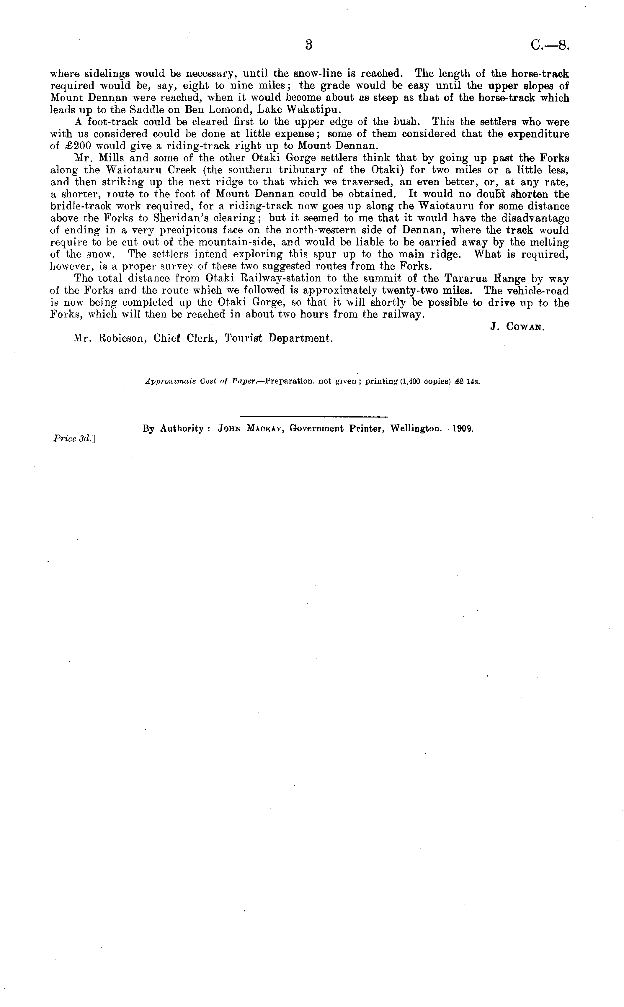 where sidelings would be necessary, until the snow-line is reached. The length of the horse-track required would be, say, eight to nine miles; the grade would be easy until the upper slopes of Mount Dennan were reached, when it would become about as steep as that of the horse-track which leads up to the Saddle on Ben Lomond, Lake Wakatipu. A foot-track could be cleared first to the upper edge of the bush. This the settlers who were with us considered could be done at little expense; some of them considered that the expenditure of £200 would give a riding-track right up to Mount Dennan. Mr. Mills and some of the other Otaki Gorge settlers think that by going up past the Forks along the Waiotauru Creek (the southern tributary of the Otaki) for two miles or a little less, and then striking up the next ridge to that which we traversed, an even better, or, at any rate, a shorter, loute to the foot of Mount Dennan could be obtained. It would no doubt shorten the bridle-track work required, for a riding-track now goes up along the Waiotauru for some distance above the Forks to Sheridan's clearing; but it seemed to me that it would have the disadvantage of ending in a very precipitous face on the north-western side of Dennan, where the track would require to be cut out of the mountain-side, and would be liable to be carried away by the melting of the snow. The settlers intend exploring this spur up to the main ridge. What is required, however, is a proper survey of these two suggested routes from the Forks. The total distance from Otaki Railway-station to the summit of the Tararua Range by way of the Forks and the route which we followed is approximately twenty-two miles. The vehicle-road is now being completed up the Otaki Gorge, so that it will shortly be possible to drive up to the Forks, which will then be reached in about two hours from the railway. J. COW AN. Mr. Robieson, Chief Clerk, Tourist Department. Approximate Cost of Paper.— Preparation, not given ; printing (1,400 copies) £$ 14s.