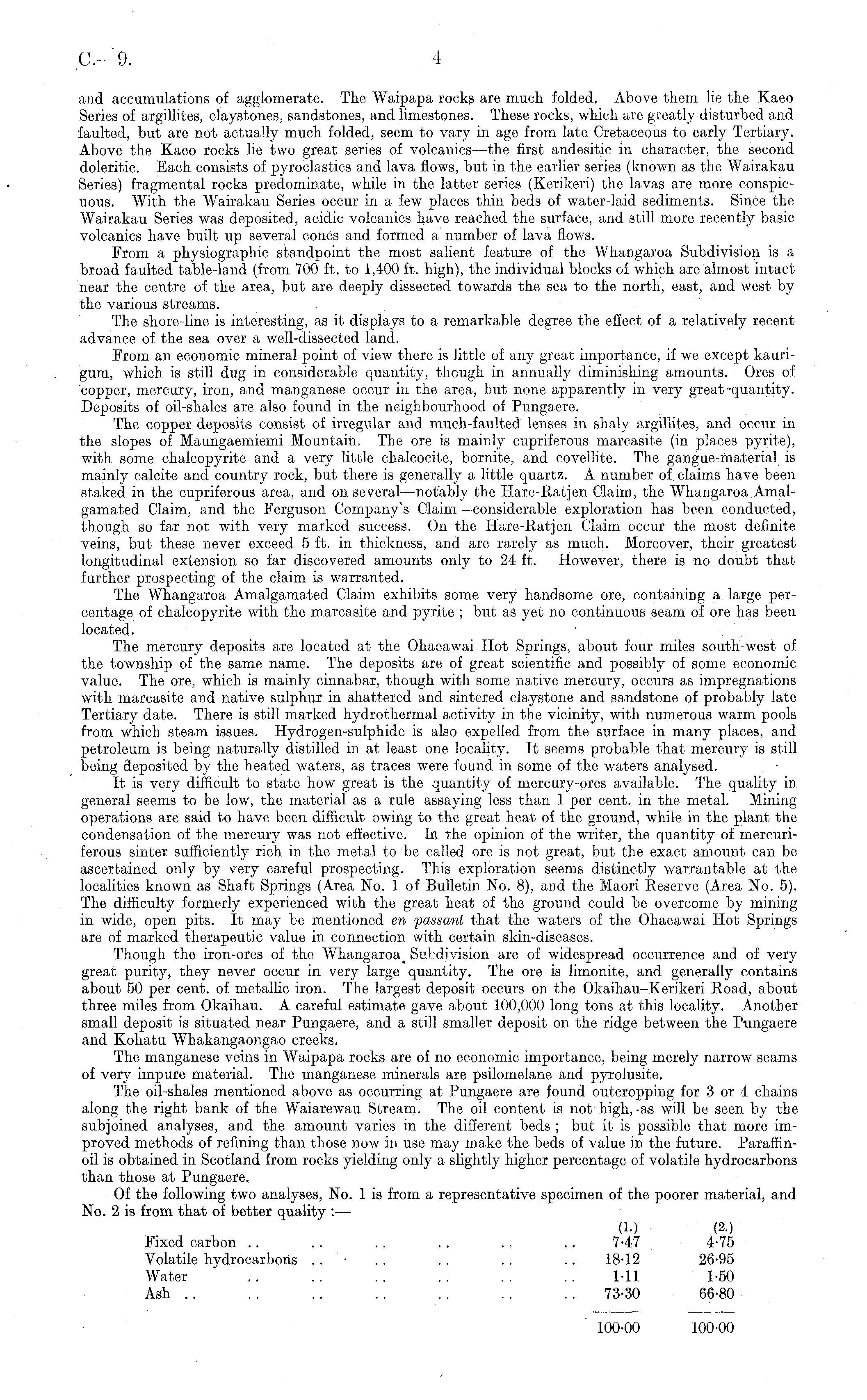 and accumulations of agglomerate. The Waipapa rocks are much folded. Above them lie the Kaeo Series of argillites, claystones, sandstones, and limestones. These rocks, which are greatly disturbed and faulted, but are not actually much folded, seem to vary in age from late Cretaceous to early Tertiary. Above the Kaeo rocks lie two great series of volcanics —the first andesitic in character, the second doleritic. Each consists of pyroclastics and lava flows, but in the earlier series (known as the Wairakau Series) fragmental rocks predominate, while in the latter series (Kerikeri) the lavas are more conspicuous. With the Wairakau Series occur in a few places thin beds of water-laid sediments. Since the Wairakau Series was deposited, acidic volcanics have reached the surface, and still more recently basic volcanics have built up several cone 3 and formed a number of lava flows. From a physiographic standpoint the most salient feature of the Whangaroa Subdivision is a broad faulted table-land (from 700 ft. to 1,400 ft. high), the individual blocks of which are almost intact near the centre of the area, but are deeply dissected towards the sea to the north, east, and west by the various streams. The shore-line is interesting, as it displays to a remarkable degree the effect of a relatively recent advance of the sea over a well-dissected land. From an economic mineral point of view there is little of any great importance, if we except kaurigum, which is still dug in considerable quantity, though in annually diminishing amounts. Ores of copper, mercury, iron, and manganese occur in the area, but none apparently in very great-quantity. Deposits of oil-shales are also found in the neighbourhood of Pungaere. The copper deposits consist of irregular and much-faulted lenses in shaly argillites, and occur in the slopes of Maungaemiemi Mountain. The ore is mainly cupriferous marcasite (in places pyrite), with some chalcopyrite and a very little chalcocite, bornite, and covellite. The gangue-material is mainly calcite and country rock, but there is generally a little quartz. A number of claims have been staked in the cupriferous area, and on several —notably the Hare-Ratjen Claim, the Whangaroa Amalgamated Claim, and the Ferguson Company's Claim —considerable exploration has been conducted, though so far not with very marked success. On the Hare-Ratjen Claim occur the most definite veins, but these never exceed 5 ft. in thickness, and are rarely as much. Moreover, their greatest longitudinal extension so far discovered amounts only to 24 ft. However, there is no doubt that further prospecting of the claim is warranted. The Whangaroa Amalgamated Claim exhibits some very handsome ore, containing a large percentage of chalcopyrite with the marcasite and pyrite ; but as yet no continuous seam of ore has been located. The mercury deposits are located at the Ohaeawai Hot Springs, about four miles south-west of the township of the same name. The deposits are of great scientific and possibly of some economic value. The ore, which is mainly cinnabar, though with some native mercury, occurs as impregnations with marcasite and native sulphur in shattered and sintered claystone and sandstone of probably late Tertiary date. There is still marked hydrothermal activity in the vicinity, with numerous warm pools from which steam issues. Hydrogen-sulphide is also expelled from the surface in many places, and petroleum is being naturally distilled in at least one locality. It seems probable that mercury is still being deposited by the heated waters, as traces were found in some of the waters analysed. It is very difficult to state how great is the quantity of mercury-ores available. The quality in general seems to be low, the material as a rule assaying less than 1 per cent, in the metal. Mining operations are said to have been difficult owing to the great heat of the ground, while in the plant the condensation of the mercury was not effective. la the opinion of the writer, the quantity of mercuriferous sinter sufficiently rich in the metal to be called ore is not great, but the exact amount can be ascertained only by very careful prospecting. This exploration seems distinctly warrantable at the localities known as Shaft Springs (Area No. 1 of Bulletin No. 8), and the Maori Reserve (Area No. 5). The difficulty formerly experienced with the great heat of the ground could be overcome by mining in wide, open pits. It may be mentioned en fassant that the waters of the Ohaeawai Hot Springs are of marked therapeutic value in connection with certain skin-diseases. Though the iron-ores of the Whangaroa_ Subdivision are of widespread occurrence and of very great purity, they never occur in very large quantity. The ore is limonite, and generally contains about 50 per cent, of metallic iron. The largest deposit occurs on the Okaihau-Kerikeri Road, about three miles from Okaihau. A careful estimate gave about 100,000 long tons at this locality. Another small deposit is situated near Pungaere, and a still smaller deposit on the ridge between the Pungaere and Kohatu Whakangaongao creeks. The manganese veins in Waipapa rocks are of no economic importance, being merely narrow seams of very impure material. The manganese minerals are psilomelane and pyrolusite. The oil-shales mentioned above as occurring at Pungaere are found outcropping for 3 or 4 chains along the right bank of the Waiarewau Stream. The oil content is not high,-as will be seen by the subjoined analyses, and the amount varies in the different beds ; but it is possible that more improved methods of refining than those now in use may make the beds of value in the future. Paraffinoil is obtained in Scotland from rocks yielding only a slightly higher percentage of volatile hydrocarbons than those at Pungaere. Of the following two analyses, No. 1 is from a representative specimen of the poorer material, and No. 2 is from that of better quality : — (10 (20 Fixed carbon