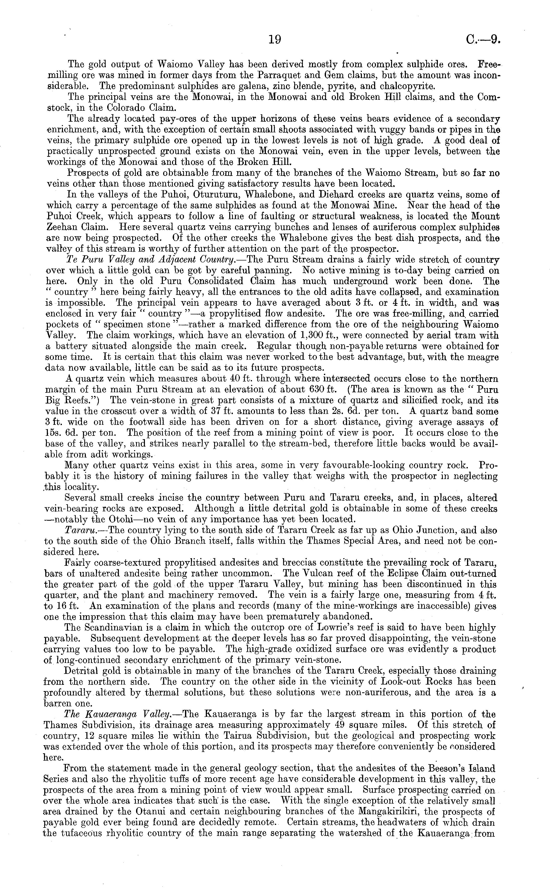 The gold output of Waiomo Valley has been derived mostly from complex sulphide ores. Freemilling ore was mined in former days from the Parraquet and Gem claims, but the amount was inconsiderable. The predominant sulphides are galena, zinc blende, pyrite, and chalcopyrite. The principal veins are the Monowai, in the Monowai and old Broken Hill claims, and the Cornstock, in the Colorado Claim. The already located pay-ores of the upper horizons of these veins bears evidence of a secondary enrichment, and, with the exception of certain small shoots associated with vuggy bands or pipes in the veins, the primary sulphide ore opened up in the lowest levels is not of high grade. A good deal of practically unprospected ground exists on the Monowai vein, even in the upper levels, between the workings of the Monowai and those of the Broken Hill. Prospects of gold are obtainable from many of the branches of the Waiomo Stream, but so far no veins other than those mentioned giving satisfactory results have been located. In the valleys of the Puhoi, Oturuturu, Whalebone, and Diehard creeks are quartz veins, some of which carry a percentage of the same sulphides as found at the Monowai Mine. Near the head of the Puhoi Creek, which appears to follow a line of faulting or structural weakness, is located the Mount Zeehan Claim. Here several quartz veins carrying bunches and lenses of auriferous complex sulphides are now being prospected. Of the other creeks the Whalebone gives the best dish prospects, and the valley of this stream is worthy of further attention on the part of the prospector. Te Puru Valley and Adjacent Country. —The Puru Stream drains a fairly wide stretch of country over which a little gold can be got by careful panning. No active mining is to-day being carried on here. Only in the old Puru Consolidated Claim has much underground work been done. The " country " here being fairly heavy, all the entrances to the old adits have collapsed, and examination is impossible. The principal vein appears to have averaged about 3 ft. or 4 ft. in width, and was enclosed in very fair " country " —a propylitised flow andesite. The ore was free-milling, and carried pockets of " specimen stone " —rather a marked difference from the ore of the neighbouring Waiomo Valley. The claim workings, which have an elevation of 1,300 ft., were connected by aerial tram with a battery situated alongside the main creek. Regular though non-payable returns were obtained for some time. It is certain that this claim was never worked to the best advantage, but, with the meagre data now available, little can be said as to its future prospects. A quartz vein which measures about 40 ft. through where intersected occurs close to the northern margin of the main Puru Stream at an elevation of about 630 ft. (The area is known as the " Puru Big Reefs.") The vein-stone in great part consists of a mixture of quartz and silicified rock, and its value in the crosscut over a width of 37 ft. amounts to less than 2s. 6d. per ton. A quartz band some 3 ft. wide on the footwall side has been driven on for a short distance, giving average assays of 15s. 6d. per ton. The position of the reef from a mining point of view is poor. It occurs close to the base of the valley, and strikes nearly parallel to the stream-bed, therefore little backs would be available from adit workings. Many other quartz veins exist in this area, some in very favourable-looking country rock. Probably it is the history of mining failures in the valley that weighs with the prospector in neglecting this locality. Several small creeks incise the country between Puru and Tararu creeks, and, in places, altered vein-bearing rocks are exposed. Although a little detrital gold is obtainable in some of these creeks —notably the Otohi —no vein of any importance has yet been located. Tararu. —The country lying to the south side of Tararu Creek as far up as Ohio Junction, and also to the south side of the Ohio Branch itself, falls within the Thames Special Area, and need not be considered here. Fairly coarse-textured propylitised andesites and breccias constitute the prevailing rock of Tararu, bars of unaltered andesite being rather uncommon. The Vulcan reef of the Eclipse Claim out-turned the greater part of the gold of the upper Tararu Valley, but mining has been discontinued in this quarter, and the plant and machinery removed. The vein is a fairly large one, measuring from 4 ft. to 16 ft. An examination of the plans and records (many of the mine-workings are inaccessible) gives one the impression that this claim may have been prematurely abandoned. The Scandinavian is a claim in which the outcrop ore of Lowrie's reef is said to have been highly payable. Subsequent development at the deeper levels has so far proved disappointing, the vein-stone carrying values too low to be payable. The high-grade oxidized surface ore was evidently a product of long-continued secondary enrichment of the primary vein-stone. Detrital gold is obtainable in many of the branches of the Tararu Creek, especially those draining from the northern side. The country on the other side in the vicinity of Look-out Rocks has been profoundly altered by thermal solutions, but these solutions were non-auriferous, and the area is a barren one. The Kauaeranga Valley. —The Kauaeranga is by far the largest stream in this portion of the Thames Subdivision, its drainage area measuring approximately 49 square miles. Of this stretch of country, 12 square miles lie within the Tairua Subdivision, but the geological and prospecting work was extended over the whole of this portion, and its prospects may therefore conveniently be considered here. From the statement made in the general geology section, that the andesites of the Beeson's Island Series and also the rhyolitic tuffs of more recent age have considerable development in this valley, the prospects of the area from a mining point of view would appear small. S