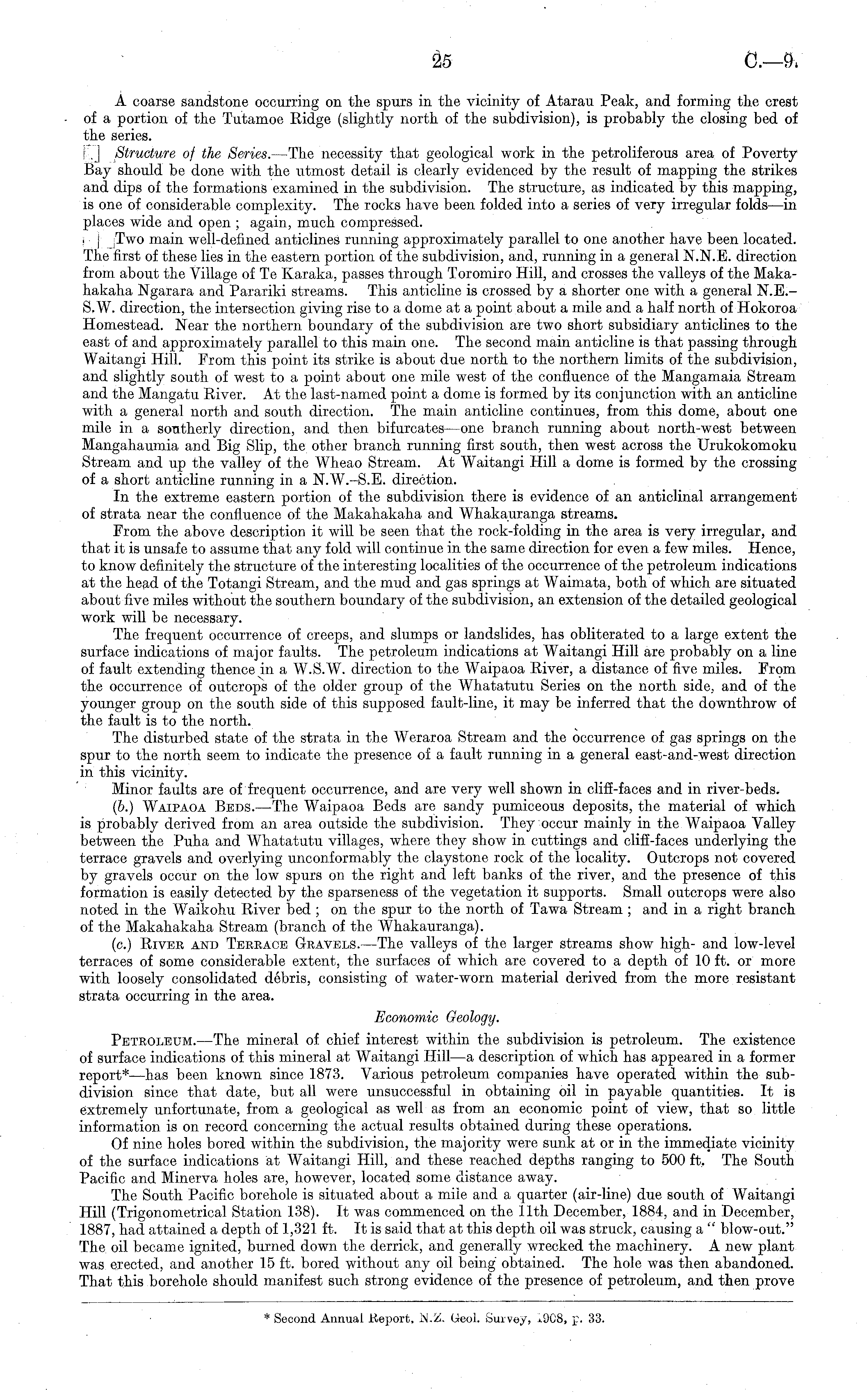 A coarse sandstone occurring on the spurs in the vicinity of Atarau Peak, and forming the crest of a portion of the Tutamoe Ridge (slightly north of the subdivision), is probably the closing bed of the series. f.] Structure of the Series. —The necessity that geological work in the petroliferous area of Poverty Bay should be done with the utmost detail is clearly evidenced by the result of mapping the strikes and dips of the formations examined in the subdivision. The structure, as indicated by this mapping, is one of considerable complexity. The rocks have been folded into a series of very irregular folds—in places wide and open ; again, much compressed. , ) jTwo main well-defined anticlines running approximately parallel to one another have been located. The first of these lies in the eastern portion of the subdivision, and, running in a general N.N.E. direction from about the Village of Te Karaka, passes through Toromiro Hill, and crosses the valleys of the Makahakaha Ngarara and Parariki streams. This anticline is crossed by a shorter one with a general N.E.S.W. direction, the intersection giving rise to a dome at a point about a mile and a half north of Hokoroa Homestead. Near the northern boundary of the subdivision are two short subsidiary anticlines to the east of and approximately parallel to this main one. The second main anticline is that passing through Waitangi Hill. From this point its strike is about due north to the northern limits of the subdivision, and slightly south of west to a point about one mile west of the confluence of the Mangamaia Stream and the Mangatu River. At the last-named point a dome is formed by its conjunction with an anticline with a general north and south direction. The main anticline continues, from this dome, about one mile in a southerly direction, and then bifurcates —one branch running about north-west between Mangahaumia and Big Slip, the other branch running first south, then west across the Urukokomoku Stream and up the valley of the Wheao Stream. At Waitangi Hill a dome is formed by the crossing of a short anticline running in a N.W.-S.E. direction. In the extreme eastern portion of the subdivision there is evidence of an anticlinal arrangement of strata near the confluence of the Makahakaha and Whakauranga streams. From the above description it will be seen that the rock-folding in the area is very irregular, and that it is unsafe to assume that any fold will continue in the same direction for even a few miles. Hence, to know definitely the structure of the interesting localities of the occurrence of the petroleum indications at the head of the Totangi Stream, and the mud and gas springs at Waimata, both of which are situated about five miles without the southern boundary of the subdivision, an extension of the detailed geological work will be necessary. The frequent occurrence of creeps, and slumps or landslides, has obliterated to a large extent the surface indications of major faults. The petroleum indications at Waitangi Hill are probably on a line of fault extending thence in a W.S.W. direction to the Waipaoa River, a distance of five miles. From the occurrence of outcrops of the older group of the Whatatutu Series on the north side, and of the younger group on the south side of this supposed fault-line, it may be inferred that the downthrow of the fault is to the north. The disturbed state of the strata in the Weraroa Stream and the occurrence of gas springs on the spur to the north seem to indicate the presence of a fault running in a general east-and-west direction in this vicinity. Minor faults are of frequent occurrence, and are very well shown in cliff-faces and in river-beds. (6.) Waipaoa Beds. —The Waipaoa Beds are sandy pumiceous deposits, the material of which is probably derived from an area outside the subdivision. They occur mainly in the Waipaoa Valley between the Puha and Whatatutu villages, where they show in cuttings and cliff-faces underlying the terrace gravels and overlying unconformably the claystone rock of the locality. Outcrops not covered by gravels occur on the low spurs on the right and left banks of the river, and the presence of this formation is easily detected by the sparseness of the vegetation it supports. Small outcrops were also noted in the Waikohu River bed ; on the spur to the north of Tawa Stream ; and in a right branch of the Makahakaha Stream (branch of the Whakauranga). (c.) River and Terrace Gravels.—The valleys of the larger streams show high- and low-level terraces of some considerable extent, the surfaces of which are covered to a depth of 10 ft. or more with loosely consolidated debris, consisting of water-worn material derived from the more resistant strata occurring in the area. Economic Geology. Petroleum. —The mineral of chief interest within the subdivision is petroleum. The existence of surface indications of this mineral at Waitangi Hill—a description of which has appeared in a former report* —has been known since 1873. Various petroleum companies have operated, within the subdivision since that date, but all were unsuccessful in obtaining oil in payable quantities. It is extremely unfortunate, from a geological as well as from an economic point of view, that so little information is on record concerning the actual results obtained during these operations. Of nine holes bored within the subdivision, the majority were sunk at or in the immediate vicinity of the surface indications at Waitangi Hill, and these reached depths ranging to 500 ft. The South Pacific and Minerva holes are, however, located some distance away. The South Pacific borehole is situated about a mile and a quarter (air-line) due south of Waitangi Hill (Trigonometrical Station 138). It was commenced on the 11th December, 1884, and in December, 1887, had attained a depth of 1,321 ft. It is said that at this depth oil was struck, causing a " blow-out." The oil became ignited, burned down the derrick, 