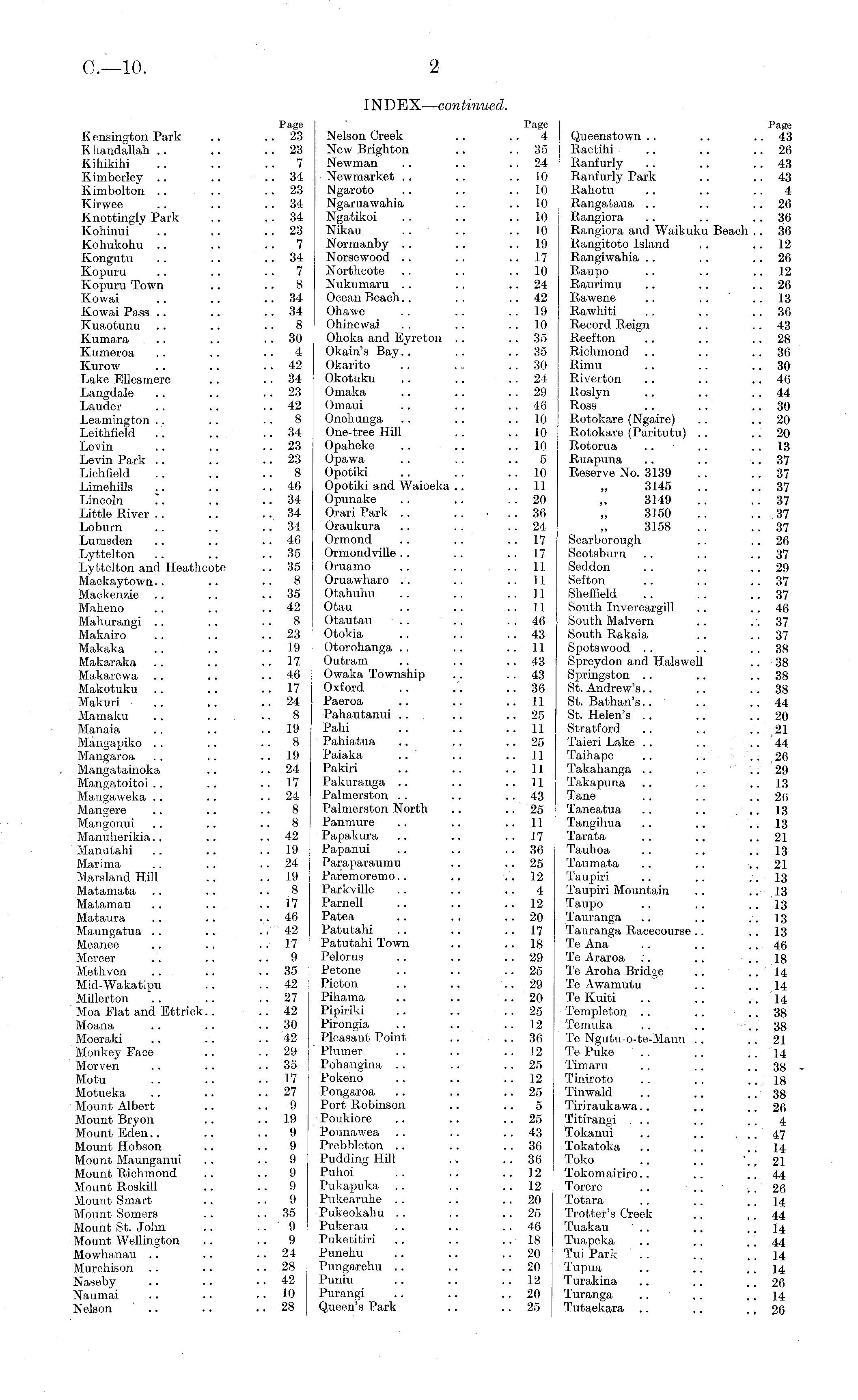 Page Page Nelson Creek .. .. 4 Queenstown .. .. ..43 New Brighton .. ..35 Raetihi .. .. ..26 Newman .. .. ..24 Ranfurly .. .. ..43 Newmarket .. .. 10 Ranfurly Park .. 43 Ngaroto .. .. ..10 Rahotu .. .. ..4 Ngaruawahia .. 10 Bangataua .. .. 26 Ngatikoi . . .. 10 Rangiora .. .. .. 36 Nikau .. .. 10 Rangiora and Waikuku Beach .. 36 Normanby .. .. 19 Rangitoto Island .. 12 Norse wood .... 17 Rangiwahia .. .. 26 Northcote .. .. .. 10 Raupo .. .. .. 12 Nukumaru .. .. .. 24 Raurimu .. .. .. 26 Ocean Beach.. .. ..42 Rawene .. .. ..13 Ohawe .. .. . . 19 Rawhiti .. .. .. 30 Ohinewai .... 10 Record Reign .. .. 43 Ohoka and Eyreton .... 35 Rcefton .. . . 28 Okain's Bay.. .. ..35 Richmond .. .. ..36 Okarito .. . . .. 30 Rimu .. .. .. 30 Okotuku .. .. .. 24 Riverton .. .. .. 46 Omaka .. .. .. 29 Roslyn .. .. . . 44 Omaui .. .. . . 46 Ross .. .. .. 30 Onehunga .. .. 10 Rotokare (Ngaire) .. .. 20 One-tree Hill .. ..10 Rotokare (Paritutu) .. ..20 Opaheke .. .. 10 Rotorua .. .. 13 Opawa . . . . .. 5 Ruapuna .. .. 37 Opotiki .. .. .. 10 Reserve No. 3139 .. .. 37 Opotiki and Waioeka .. ..11 „ 3145 .. ..37 Opunake .. .. ..20 „ 3149 .. ..37 Orari Park .. ..... 36 „ 3150 .. .. 37 Oraukura .. .. .. 24 „ 3158 . . .. 37 Ormond .. .. ..17 Scarborough .. .. 26 Ormondville .. .. 17 Scotsburn .. . . 37 Oruamo .. .. ..11 Seddon .. .. ..29 Oruawharo .. .. ..11 Sefton .. .. ..37 Otahuhu . . .. ..11 Sheffield .. .. .. 37 Otau .. .. ..11 South Invercargill .. .. 46 Otautau .. .. .. 46 South Malvern .. .. 37 Otokia .. .. .. 43 South Rakaia .. .. 37 Otorohanga .. .. ..11 Spotswood .. .. . . 38 Outram .. .. .. 43 Spreydon and Halswell .. 38 Owaka Township .. .. 43 Springston .. .. .. 38 Oxford .. .*. .. 36 St. Andrew's.. .. ..38 Paeroa .. .. ..11 St. Bathan's.. .. ..44 Pahautanui .. .... 25 St. Helen's .. .. . . 20 Pahi .. .. ..11 Stratford .. .. .. 2] Pahiatua .. .. .. 25 Taieri Lake .. .. . . 44 Paiaka .. .. ..11 Taihape .. .. ..26 Pakiri .. .. ..11 Takahanga .. .. ..29 Pakuranga .. .. ..11 Takapuna .. .. ..13 Palmerston .. .. .. 43 Tane .. . . .. 2{i Palmerston North .. .. 25 Taneatua .. .. .. 13 Panrnure .. .. ..11 Tangihua .. .. ..13 Papalmra .. .. ..17 Tarata .. .. ..21 Papanui .. .. .. 36 Tauhoa .. .. .. 13 Paraparaumu .. .. 25 Taumata .. .. .. 21 Paremoremo.. .. .'. 12 Taupiri .. .. ..13 Parkville .. .. .. 4 Taupiri Mountain .. .. 13 Parnell .. .. .. 12 Taupo .. .. .. 13 Patea .. .. .. 20 Tauranga .. .. .. 13 Patutahi .. .. ..17 Tauranga Racecourse.. .. 13 Patutahi Town .. ..18 Te Ana .. .. ..46 Pelorus .. .. ..29 Te Araroa .. .. ..18 Petone .. .. .. 25 Te Aroha Bridge .. .. 14 Picton .. .. .. 29 Te Awamutu ' .. .. 14 Pihama .. .. .. 20 Te Kuiti .. .. .. 14 Pipiriki .. .. .. 25 Templeton .. .. .. 38 Pirongia .. .. 12 Temuka . . .. .. 38 Pleasant Point .. .. 36 Te Ngutu-o-te-Manu .. . . 21 Plumer .. .. ..12 Te Puke .. .. ..14 Pohangina .. .. .. 25 Timaru . . .. .. 38 Pokeno .. .. .. 12 Tiniroto . . .. .. 18 Pongaroa .. .. .. 25 Tinwakl .. .. .. 38 Port Robinson .. ..5 Tiriraukawa.. .. ..26 Poukiore .. .. .. 25 Titirangi ... .. .. 4 Pounawea .. .. .. 43 Tokanui .. .. .. 47 Prebbloton .. .. .. 36 Tokatoka .. .. .. 14 Pudding Hill .. ..36 Toko .. .. '..21 Puhoi .. .. ..12 Tokomairiro.. .. .44 Pukapuka . . .. .. 12 Torere .. .. .. 26 Pukearuhe ...... 20 Totara .. .. .. 14 Pukeokahu .. .. .. 25 Trotter's Creek .. .. 44 Pukerau .. .. .. 46 Tuakau '.. .. .. 14 Puketitiri .. .. .. 18 Tuapeka ... .. .. 44 Punehn .. .. .. 20 Tui Park . . .. .. 14 Pungarehu .. .. .. 20 Tupua .. .. .. 14 Puniu .. .. ..12 Turakina .. .. ..26 Purangi .. .. ..20 Turanga .. .. ..14 Queen's Park .. .. 25 Tutaekara .. .. ~ 26