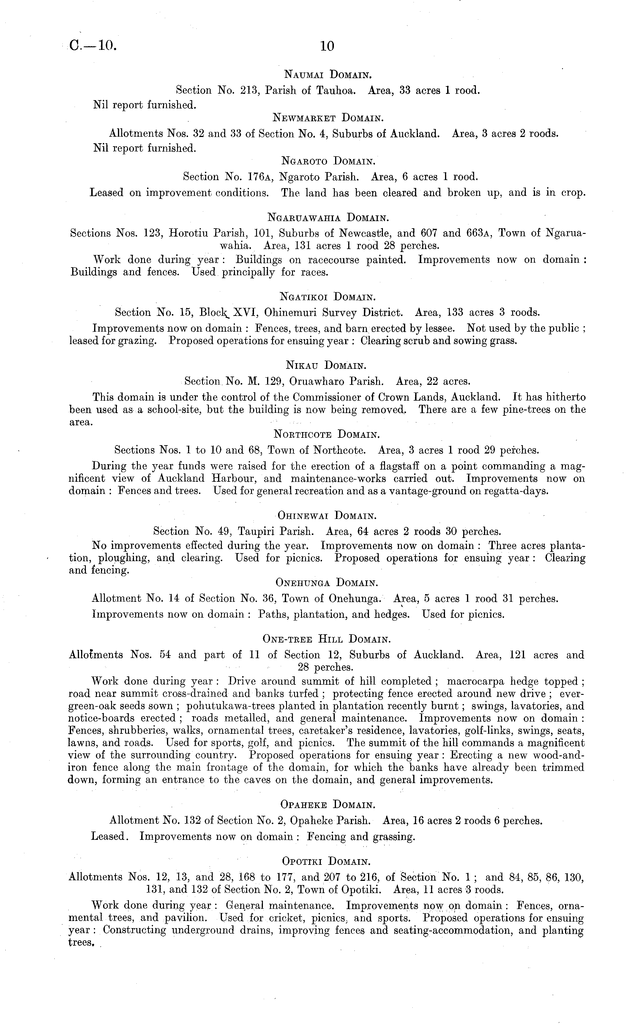 Naumai Domain. Section No. 213, Parish of Tauhoa. Area, 33 acres 1 rood. Nil report furnished. Newmarket Domain. Allotments Nos. 32 and 33 of Section No. 4, Suburbs of Auckland. Area, 3 acres 2 roods. Nil report furnished. Ngaeoto Domain. Section No. 176 a, Ngaroto Parish. Area, 6 acres 1 rood. Leased on improvement conditions. The land has been cleared and broken up, and is in crop. Ngabuawahia Domain. Sections Nos. 123, Horotiu Parish, 101, Suburbs of Newcastle, and 607 and 663 a, Town of Ngaruawahia. Area, 131 acres 1 rood 28 perches. Work done during year : Buildings on racecourse painted. Improvements now on domain : Buildings and fences. Used principally for races. Ngatikoi Domain. Section No. 15, Block_ XVI, Ohinemuri Survey District. Area, 133 acres 3 roods. Improvements now on domain : Fences, trees, and barn erected by lessee. Not used by the public ; leased for grazing. Proposed operations for ensuing year : Clearing scrub and sowing grass. Nikau Domain. Section No. M. 129, Oruawharo Parish. Area, 22 acres. This domain is under the control of the Commissioner of Crown Lands, Auckland. It has hitherto been used as a school-site, but the building is now being removed. There are a few pine-trees on the area. Nobthcote Domain. Sections Nos. Ito 10 and 68, Town of Northcote. Area, 3 acres 1 rood 29 perches. During the year funds were raised for the erection of a flagstaff on a point commanding a magnificent view of Auckland Harbour, and maintenance-works carried out. Improvements now on domain : Fences and trees. Used for general recreation and as a vantage-ground on regatta-days. Ohinewai Domain. Section No. 49, Taupiri Parish. Area, 64 acres 2 roods 30 perches. No improvements effected during the year. Improvements now on domain : Three acres plantation, ploughing, and clearing. Used for picnics. Proposed operations for ensuing year : Clearing and fencing. Onehunga Domain. Allotment No. 14 of Section No. 36, Town of Onehunga. Area, 5 acres 1 rood 31 perches. Improvements now on domain : Paths, plantation, and hedges. Used for picnics. One-teee Hill Domain. Allotments Nos. 54 and part of 11 of Section 12, Suburbs of Auckland. Area, 121 acres and 28 perches. Work done during year : Drive around summit of hill completed ; macrocarpa hedge topped ; road near summit cross-drained and banks turfed ; protecting fence erected around new drive ; ever-green-oak seeds sown ; pohutukawa-trees planted in plantation recently burnt; swings, lavatories, and notice-boards erected ; roads metalled, and general maintenance. Improvements now on domain : Fences, shrubberies, walks, ornamental trees, caretaker's residence, lavatories, golf-links, swings, seats, lawns, and roads. Used for sports, golf, and picnics. The summit of the hill commands a magnificent view of the surrounding country. Proposed operations for ensuing year : Erecting a new wood-and-iron fence along the main frontage of the domain, for which the banks have already been trimmed down, forming an entrance to the caves on the domain, and general improvements. Opaheke Domain. Allotment No. 132 of Section No. 2, Opaheke Parish. Area, 16 acres 2 roods 6 perches. Leased. Improvements now on domain : Fencing and grassing. Opotiki Domain. Allotments Nos. 12, 13, and 28, 168 to 177, and 207 to 216, of Section No. 1 ; and 84, 85, 86, 130, 131, and 132 of Section No. 2, Town of Opotiki. Area, 11 acres 3 roods. Work done during year : General maintenance. Improvements now on domain : Fences, ornamental trees, and pavilion. Used for cricket, picnics, and sports. Proposed operations for ensuing year : Constructing underground drains, improving fences and seating-accommodation, and planting trees.