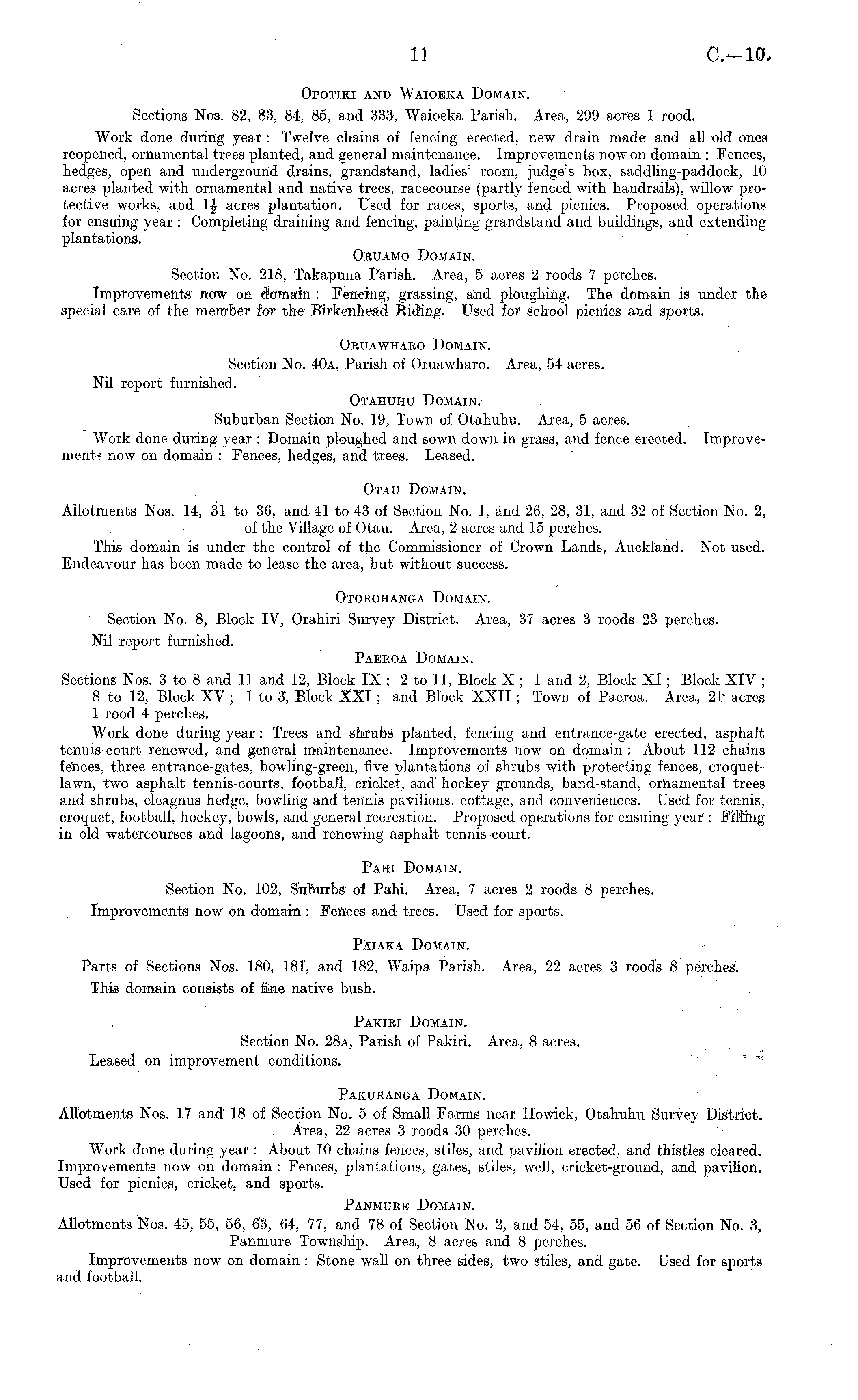 Opotiki and Waioeka Domain. Sections Nos. 82, 83, 84, 85, and 333, Waioeka Parish. Area, 299 acres 1 rood. Work done during year : Twelve chains of fencing erected, new drain made and all old ones reopened, ornamental trees planted, and general maintenance. Improvements now on domain : Fences, hedges, open and underground drains, grandstand, ladies' room, judge's box, saddling-paddock, 10 acres planted with ornamental and native trees, racecourse (partly fenced with handrails), willow protective works, and 1£ acres plantation. Used for races, sports, and picnics. Proposed operations for ensuing year : Completing draining and fencing, painting grandstand and buildings, and extending plantations. Oruamo Domain. Section No. 218, Takapuna Parish. Area, 5 acres 2 roods 7 perches. Improvements now on domain : Fencing, grassing, and ploughing. The domain is under the special care of the member for the Birkenhead Riding. Used for school picnics and sports. Okuawhaeo Domain. Section No. 40a, Parish of Oruawharo. Area, 54 acres. Nil report furnished. Otahuhu Domain. Suburban Section No. 19, Town of Otahuhu. Area, 5 acres. Work done during year : Domain ploughed and sown down in grass, and fence erected. Improvements now on domain : Fences, hedges, and trees. Leased. Otau Domain. Allotments Nos. 14, 31 to 36, and 41 to 43 of Section No. 1, and 26, 28, 31, and 32 of Section No. 2, of the Village of Otau. Area, 2 acres and 15 perches. This domain is under the control of the Commissioner of Crown Lands, Auckland. Not used. Endeavour has been made to lease the area, but without success. Otokohanga Domain. Section No. 8, Block IV, Orahiri Survey District. Area, 37 acres 3 roods 23 perches. Nil report furnished. Paeeoa Domain. Sections Nos. 3 to 8 and 11 and 12, Block IX ; 2 to 11, Block X ; 1 and 2, Block XI ; Block XIV ; Bto 12, Block XV ; Ito 3, Block XXI; and Block XXII ; Town of Paeroa. Area, 21' acres 1 rood 4 perches. Work done during year : Trees and shrubs planted, fencing and entrance-gate erected, asphalt tennis-court renewed, and general maintenance. Improvements now on domain : About 112 chains fences, three entrance-gates, bowling-green, five plantations of shrubs with protecting fences, croquetlawn, two asphalt tennis-courts, football, cricket, and hockey grounds, band-stand, ornamental trees and shrubs, eleagnus hedge, bowling and tennis pavilions, cottage, and conveniences. Used for tennis, croquet, football, hockey, bowls, and general recreation. Proposed operations for ensuing year : Filling in old watercourses and lagoons, and renewing asphalt tennis-court. Pahi Domain. Section No. 102, Suburbs of Pahi. Area, 7 acres 2 roods 8 perches. Improvements now on domain : Fences and trees. Used for sports. Paiaka Domain. Parts of Sections Nos. 180, 181, and 182, Waipa Parish. Area, 22 acres 3 roods 8 perches. This domain consists of fine native bush. Pakiri Domain. Section No. 28a, Parish of Pakiri. Area, 8 acres. Leased on improvement conditions. " *' Pakuranga Domain. Allotments Nos. 17 and 18 of Section No. 5 of Small Farms near Howick, Otahuhu Survey District. Area, 22 acres 3 roods 30 perches. Work done during year : About 10 chains fences, stiles, and pavilion erected, and thistles cleared. Improvements now on domain : Fences, plantations, gates, stiles, well, cricket-ground, and pavilion. Used for picnics, cricket, and sports. Panmure Domain. Allotments Nos. 45, 55, 56, 63, 64, 77, and 78 of Section No. 2, and 54, 55, and 56 of Section No. 3, Panmure Township. Area, 8 acres and 8 perches. Improvements now on domain : Stone wall on three sides, two stiles, and gate. Used for sports and football.